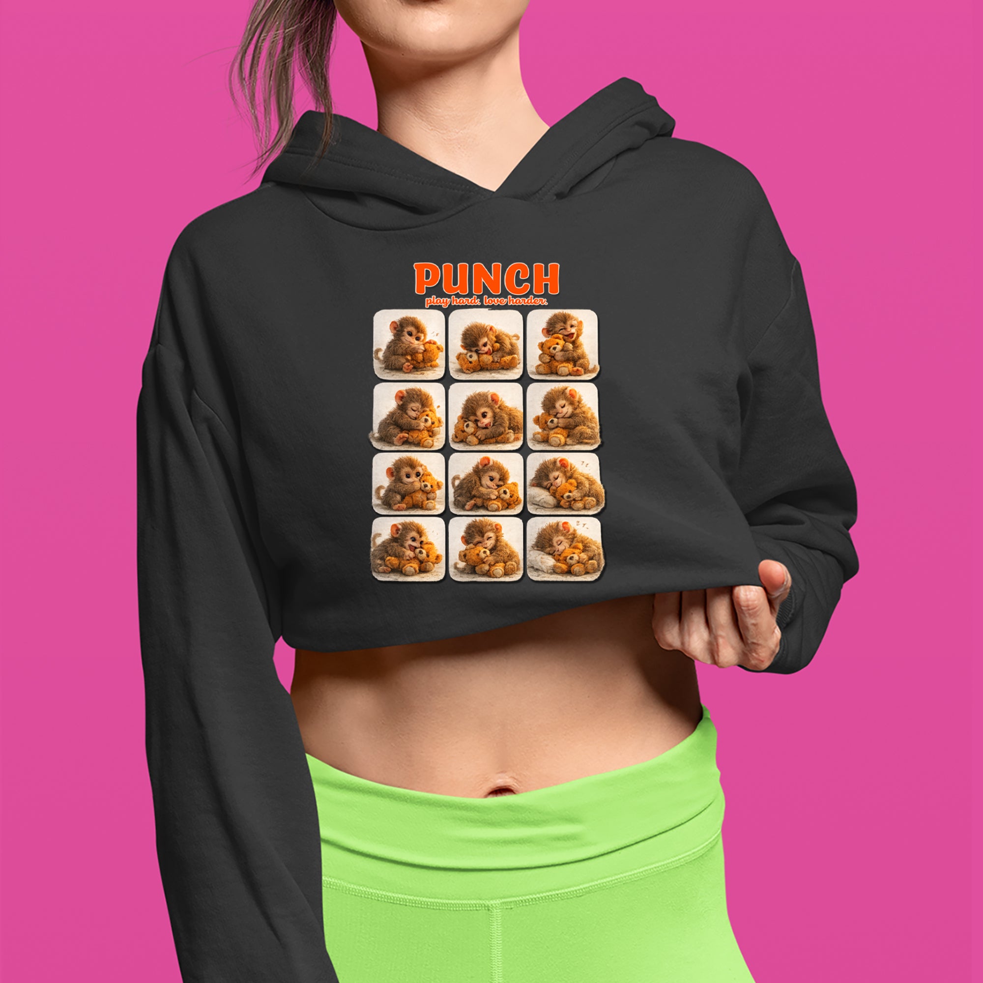 EVERY MOOD. ONE LITTLE MONKEY. | Chewing the plush, napping on it, laughing, brooding, cuddling - this design captures the full emotional range of the world's most relatable baby snow monkey in one epic grid. Fans will lose it. PLAY HARD. LOVE HARDER. | That is not just a tagline, that is Punch's entire biography. Japan zoo devotees, viral macaque followers, and anyone who has ever loved something with their whole chest will wear this like a badge of honor.