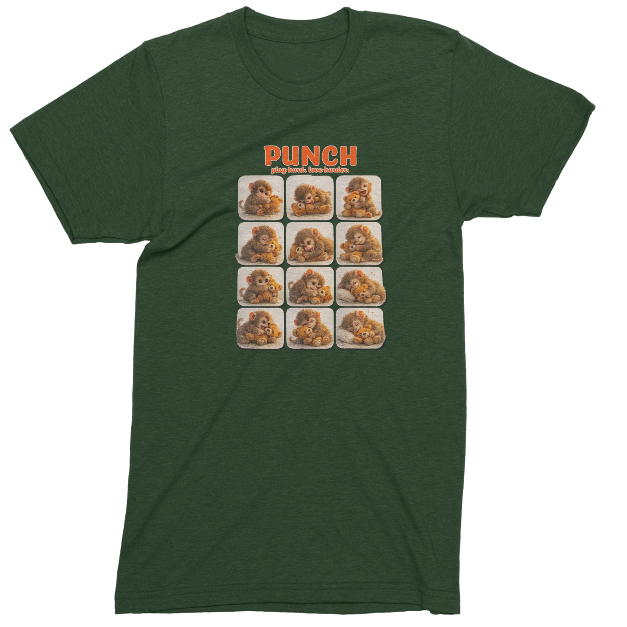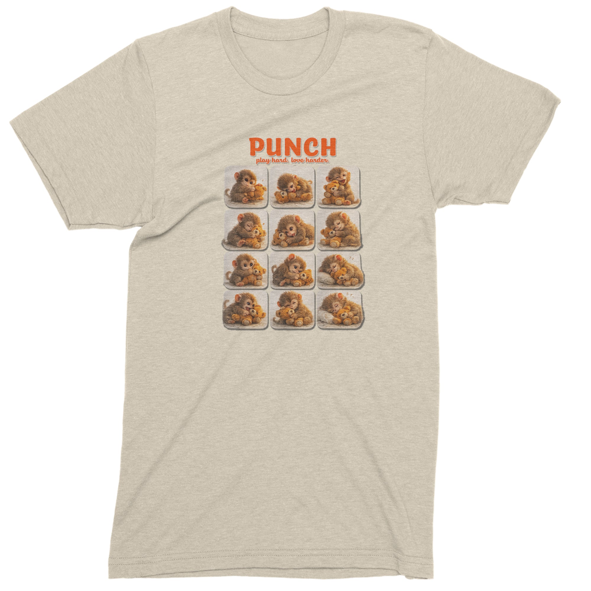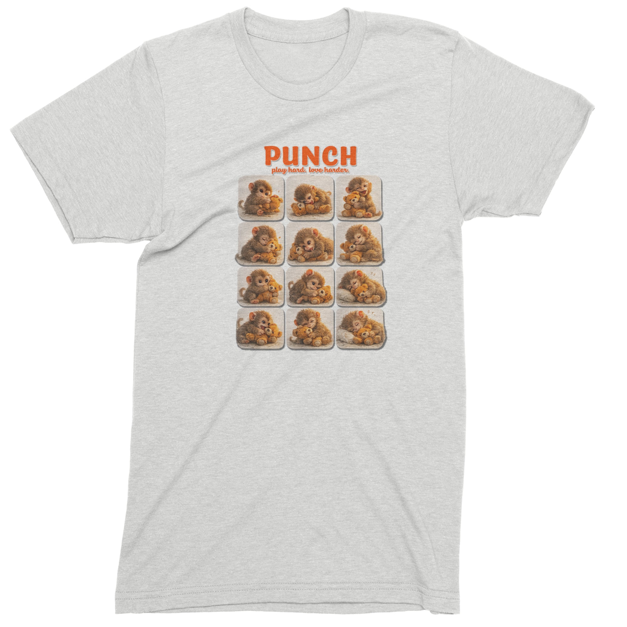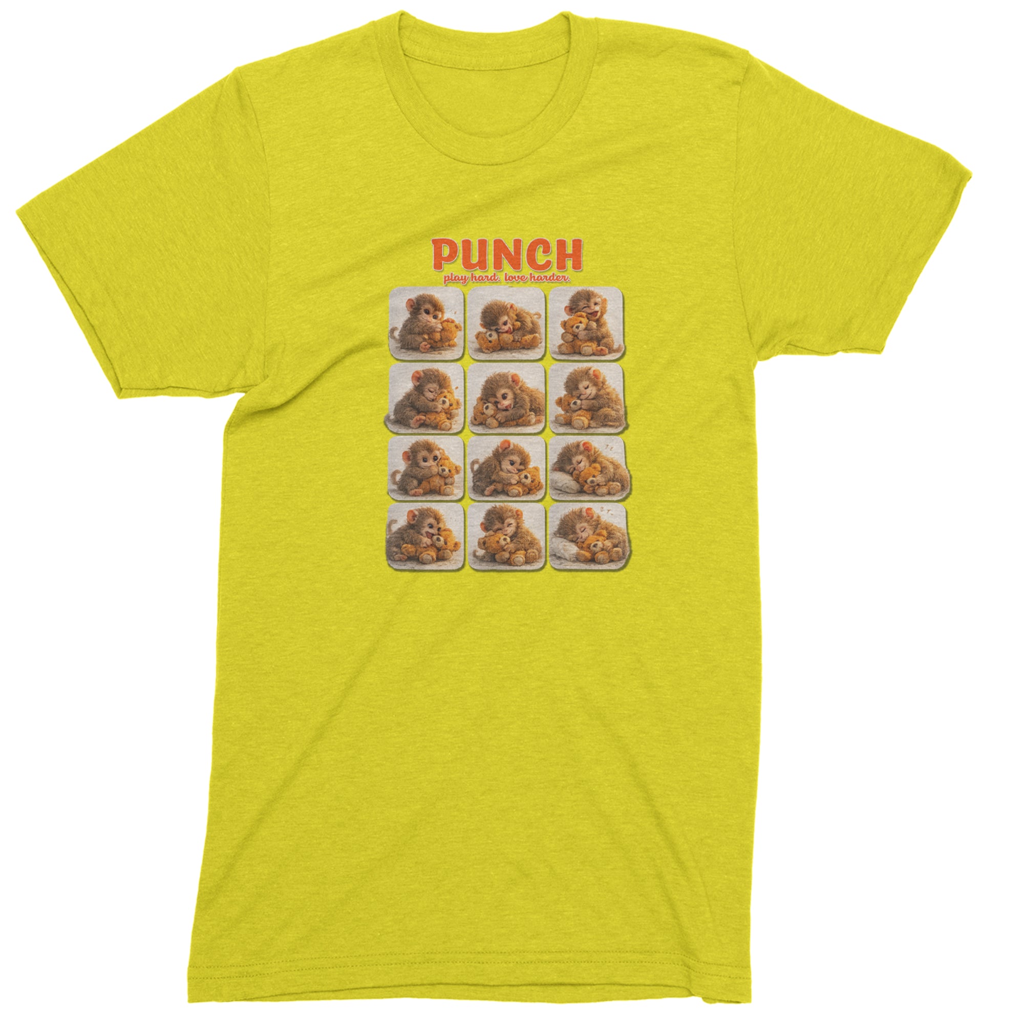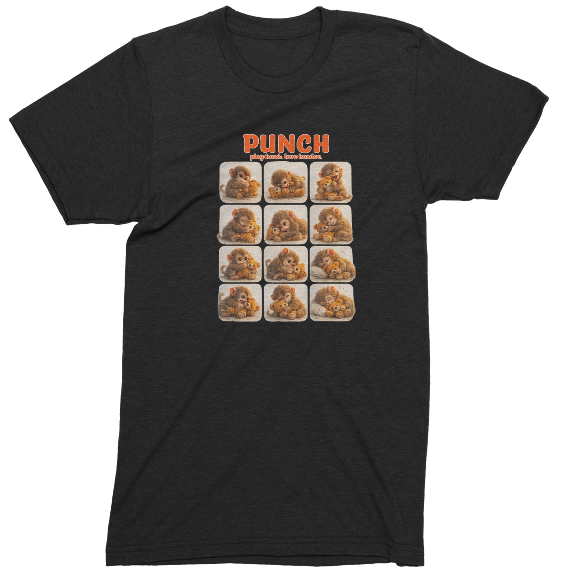 EVERY MOOD. ONE LITTLE MONKEY. | Chewing the plush, napping on it, laughing, brooding, cuddling - this design captures the full emotional range of the world's most relatable baby snow monkey in one epic grid. Fans will lose it.. PLAY HARD. LOVE HARDER. | That is not just a tagline, that is Punch's entire biography. Japan zoo devotees, viral macaque followers, and anyone who has ever loved something with their whole chest will wear this like a badge of honor..