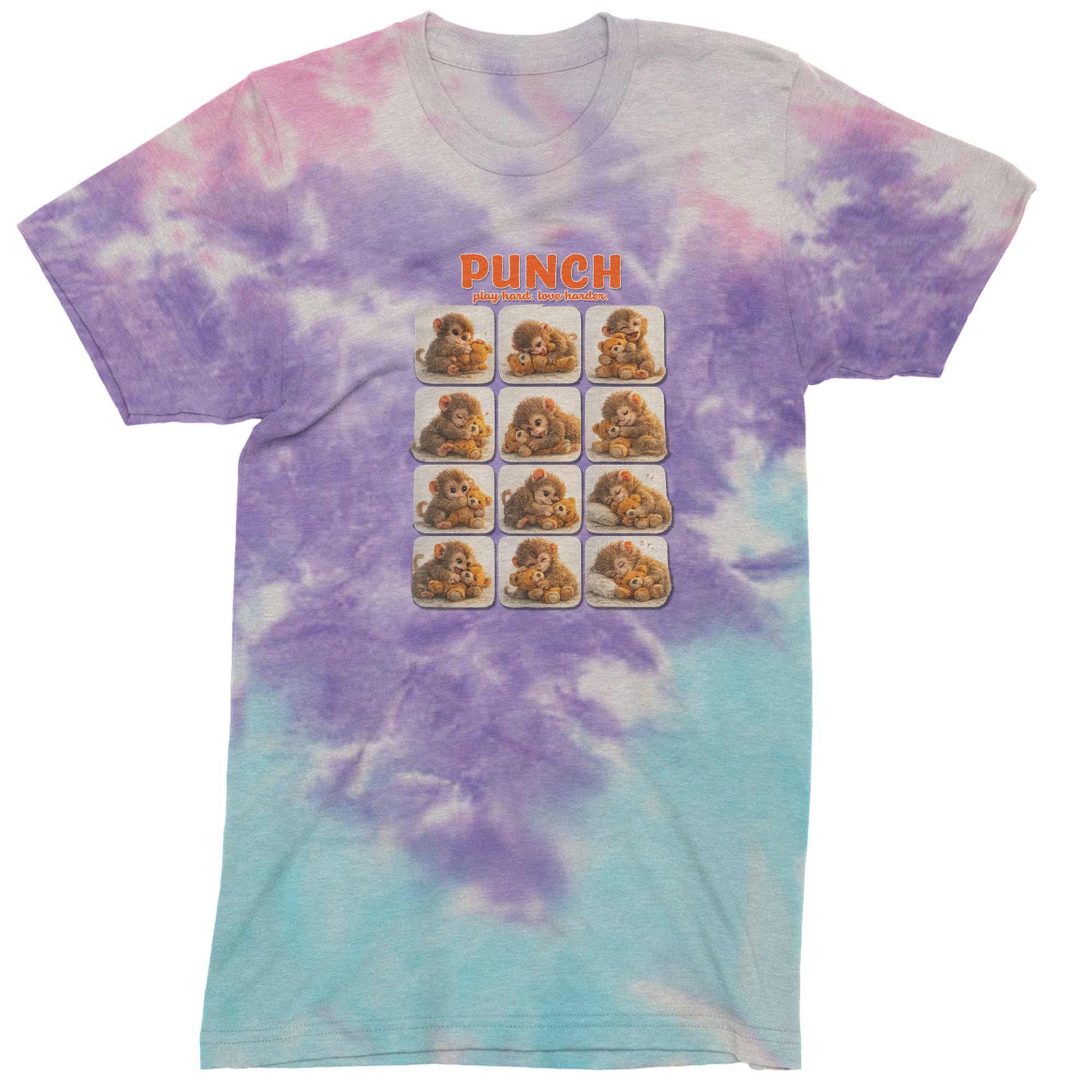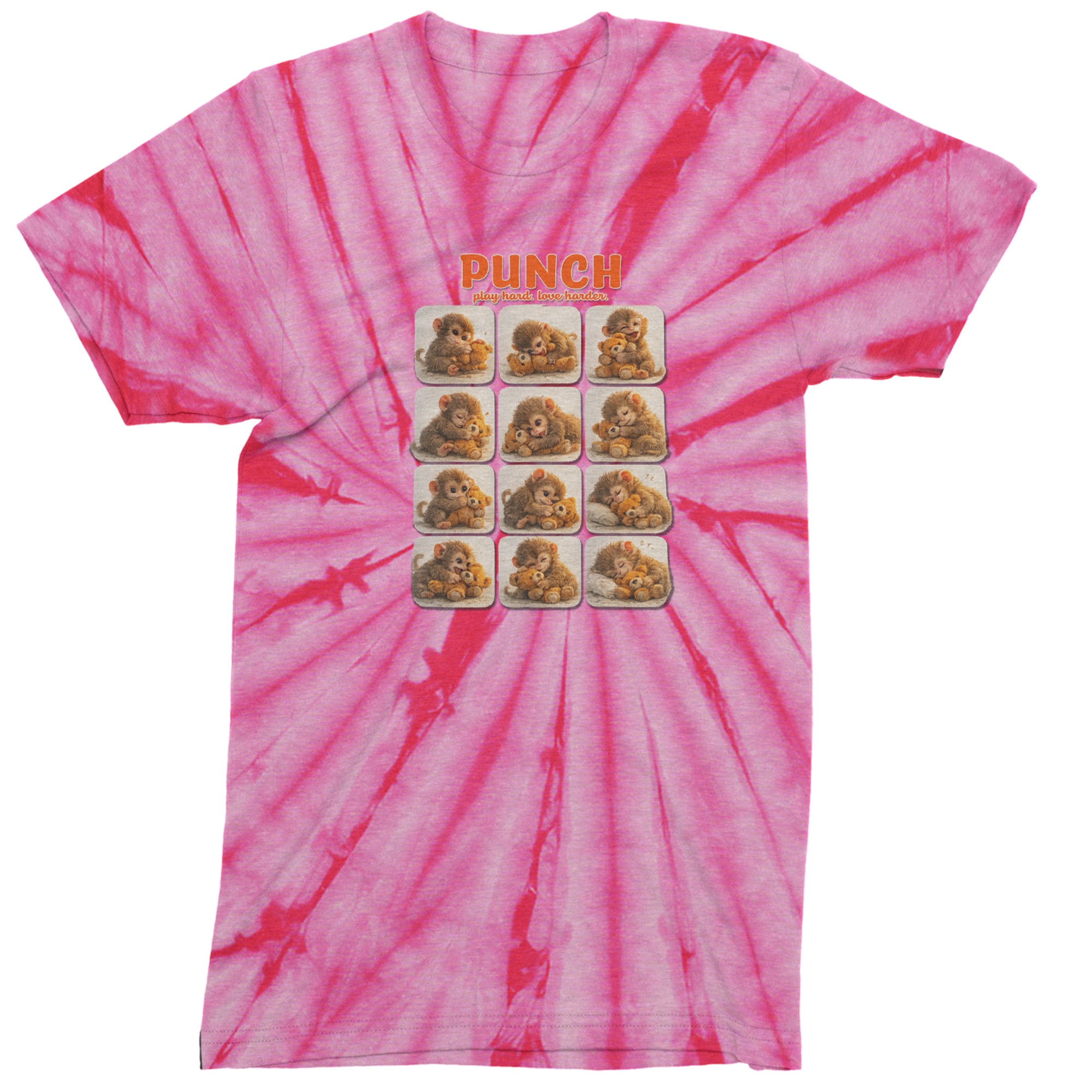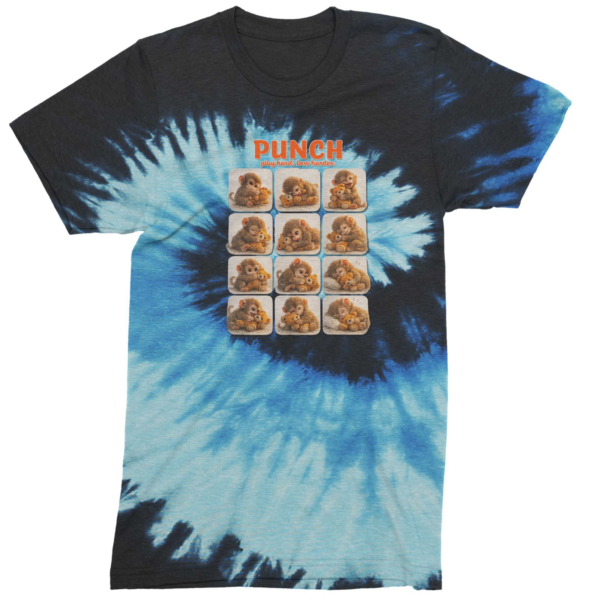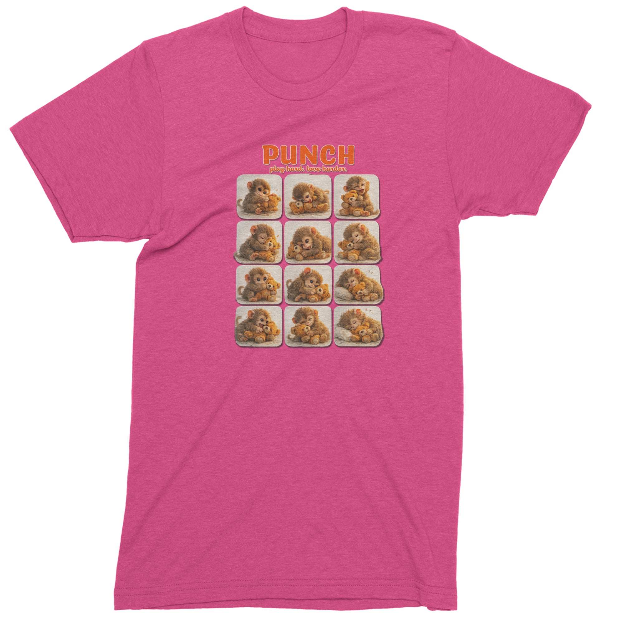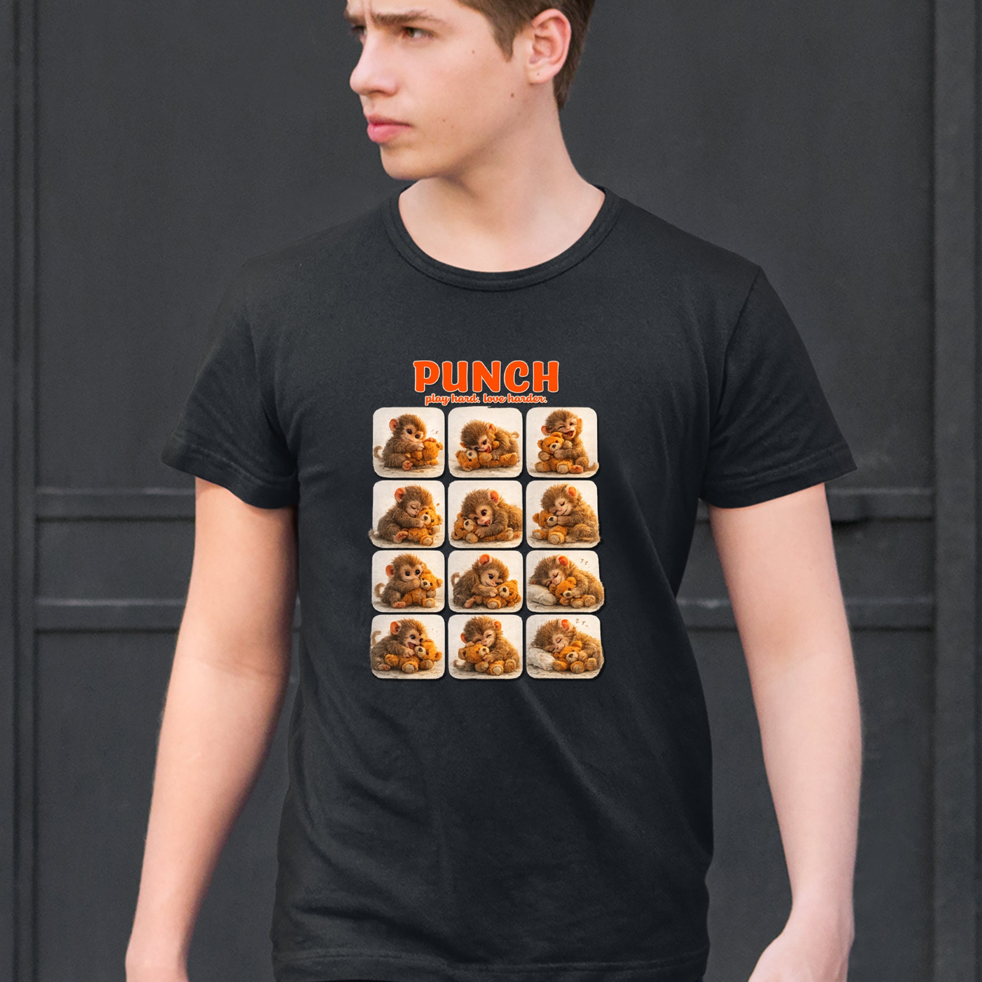 EVERY MOOD. ONE LITTLE MONKEY. | Chewing the plush, napping on it, laughing, brooding, cuddling - this design captures the full emotional range of the world's most relatable baby snow monkey in one epic grid. Fans will lose it.. PLAY HARD. LOVE HARDER. | That is not just a tagline, that is Punch's entire biography. Japan zoo devotees, viral macaque followers, and anyone who has ever loved something with their whole chest will wear this like a badge of honor..