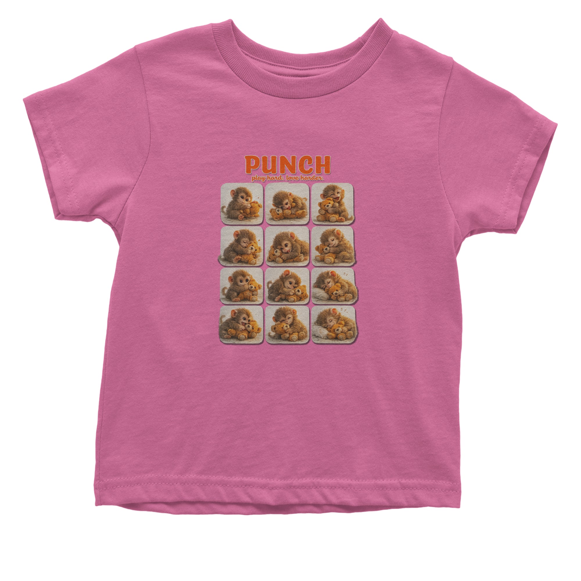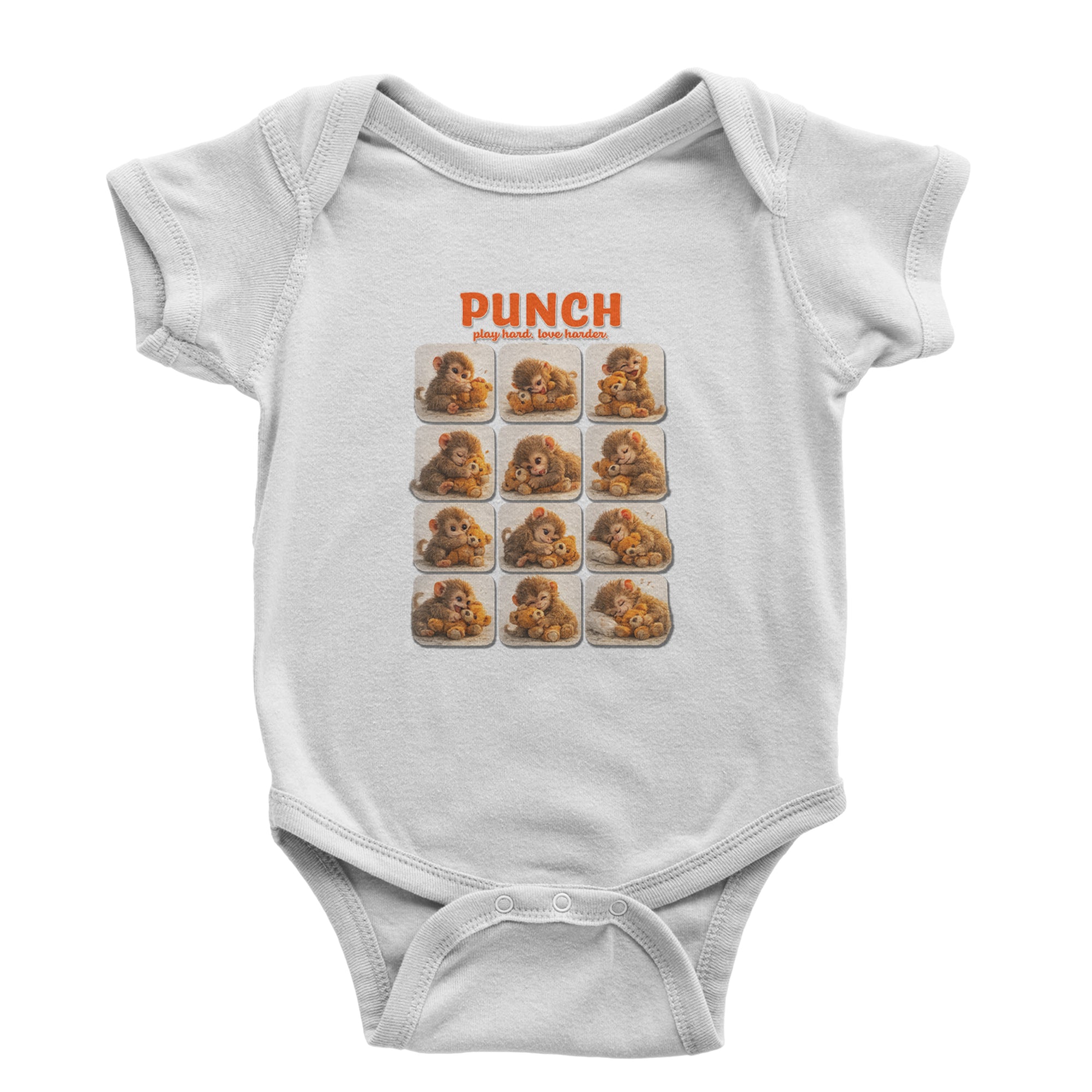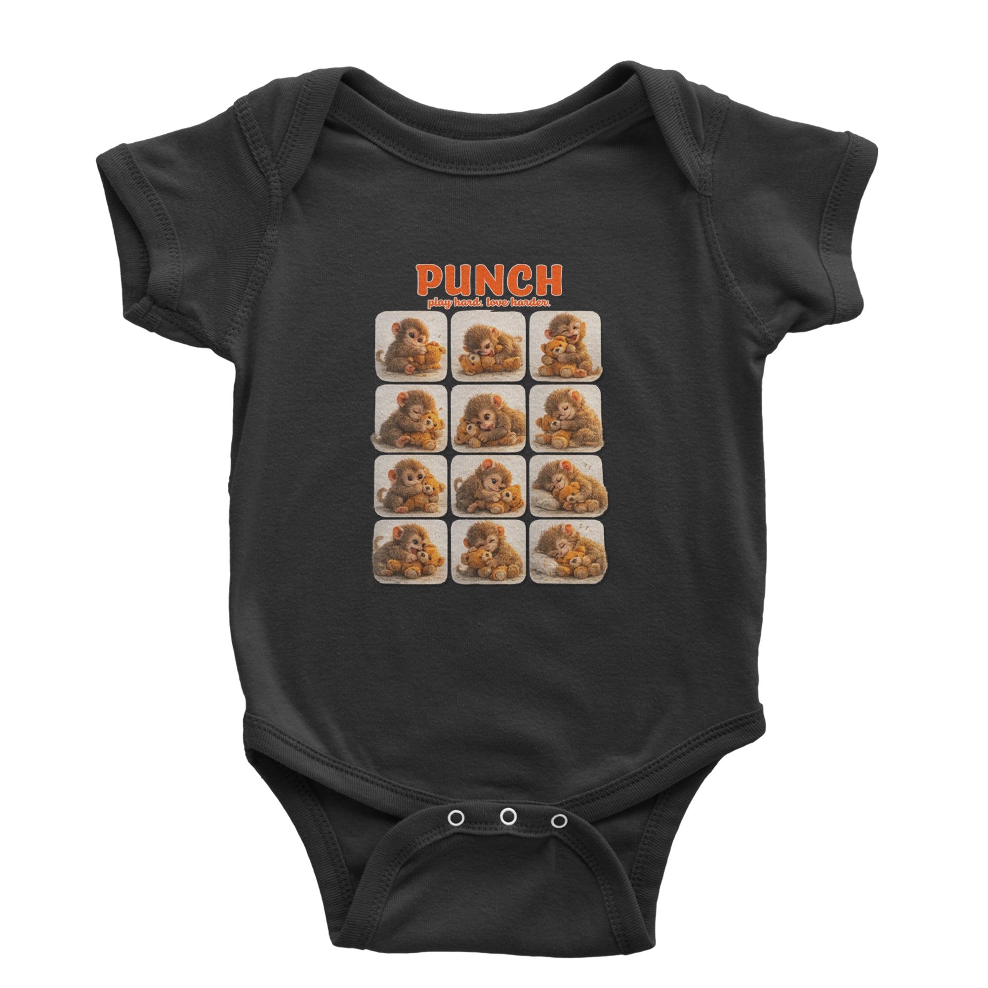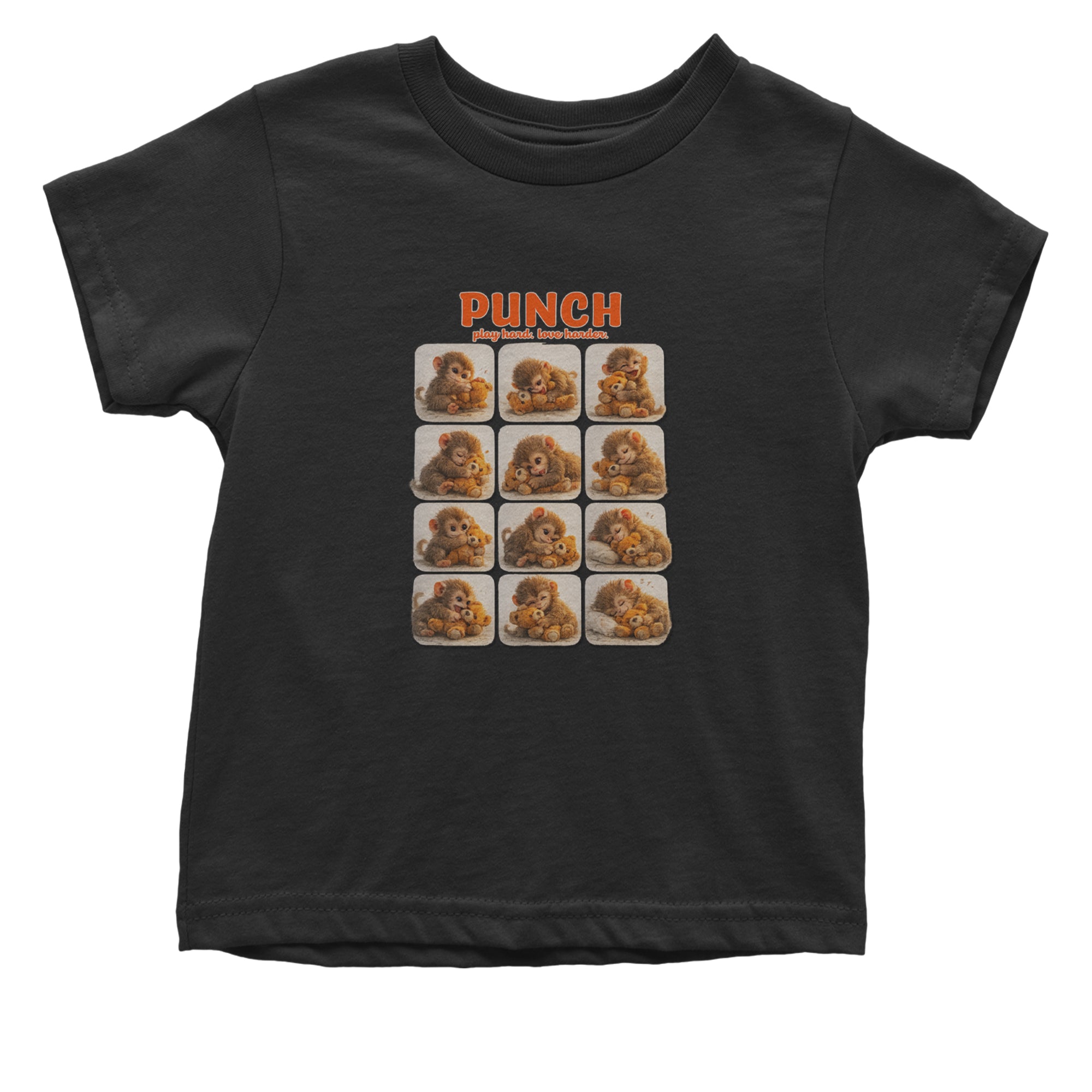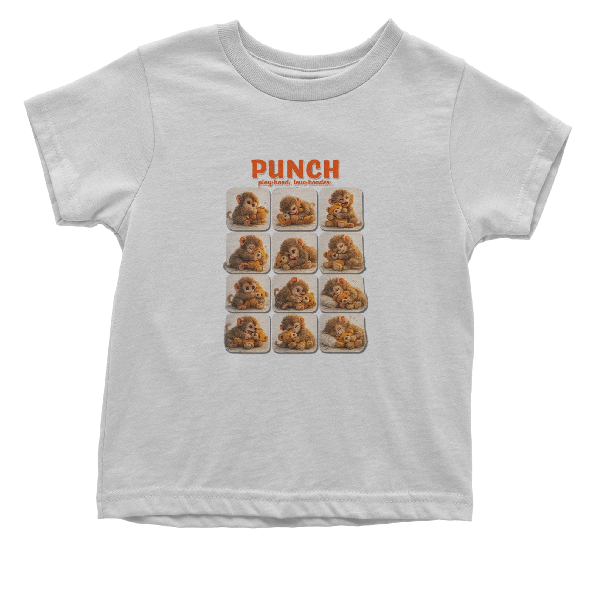 EVERY MOOD. ONE LITTLE MONKEY. | Chewing the plush, napping on it, laughing, brooding, cuddling - this design captures the full emotional range of the world's most relatable baby snow monkey in one epic grid. Fans will lose it. PLAY HARD. LOVE HARDER. | That is not just a tagline, that is Punch's entire biography. Japan zoo devotees, viral macaque followers, and anyone who has ever loved something with their whole chest will wear this like a badge of honor.