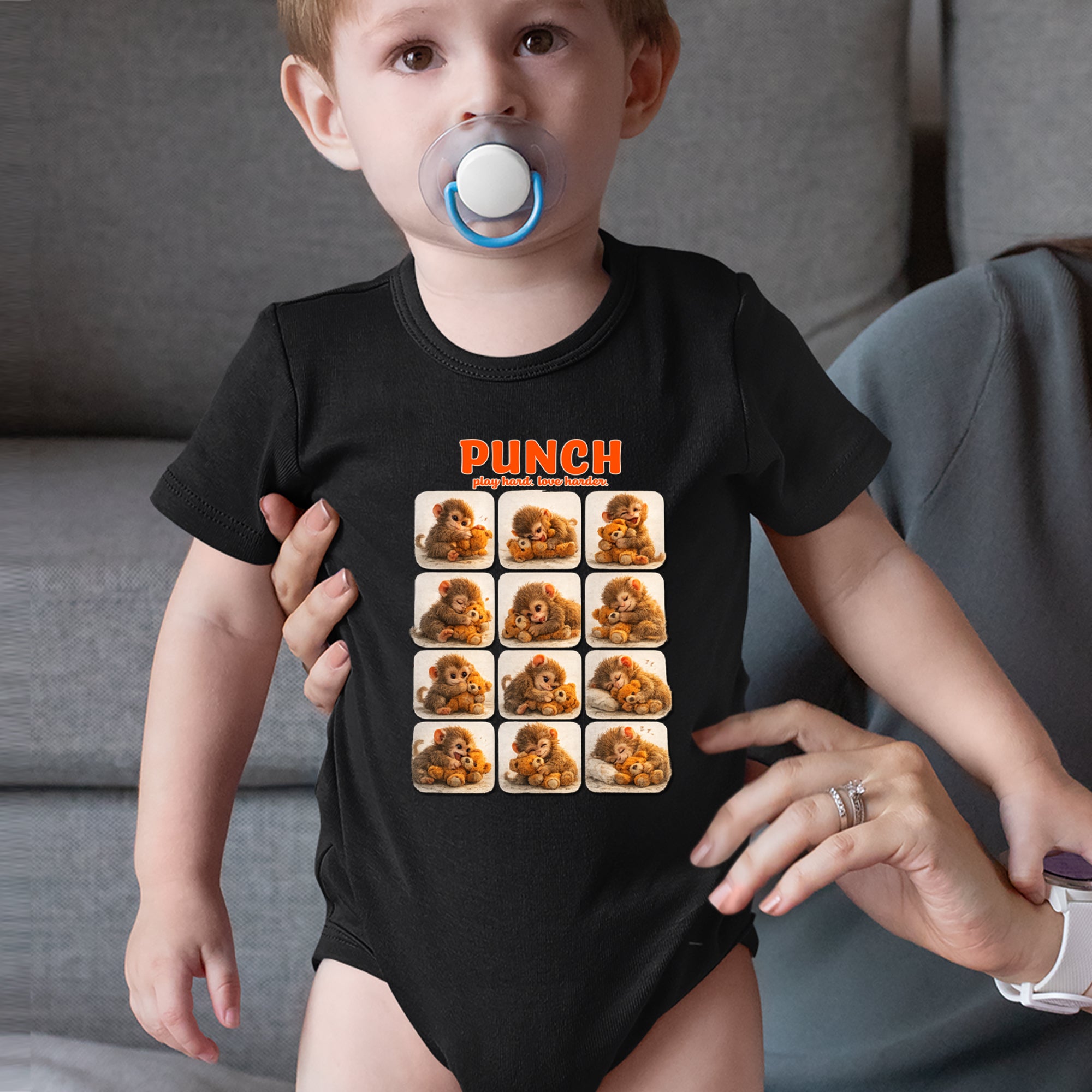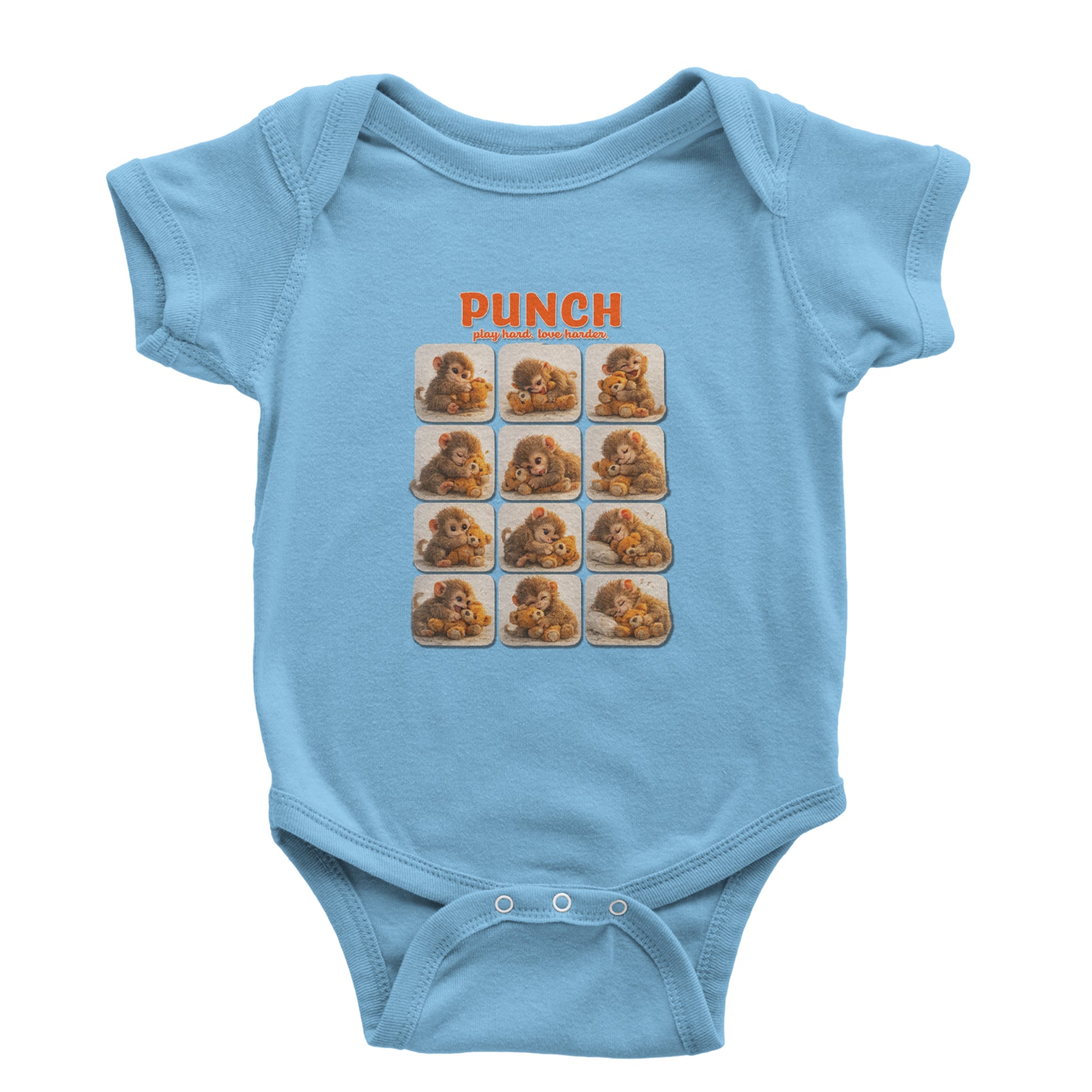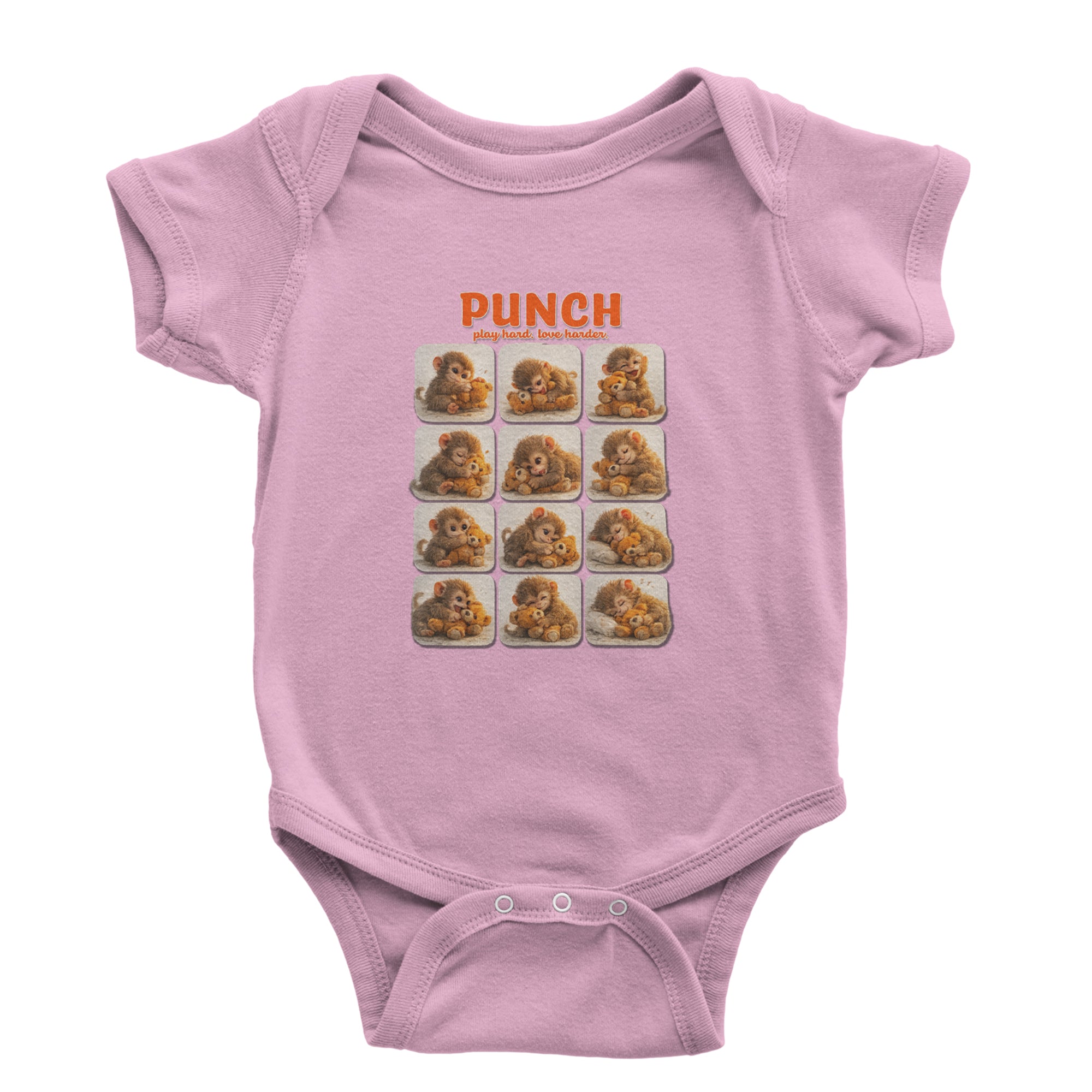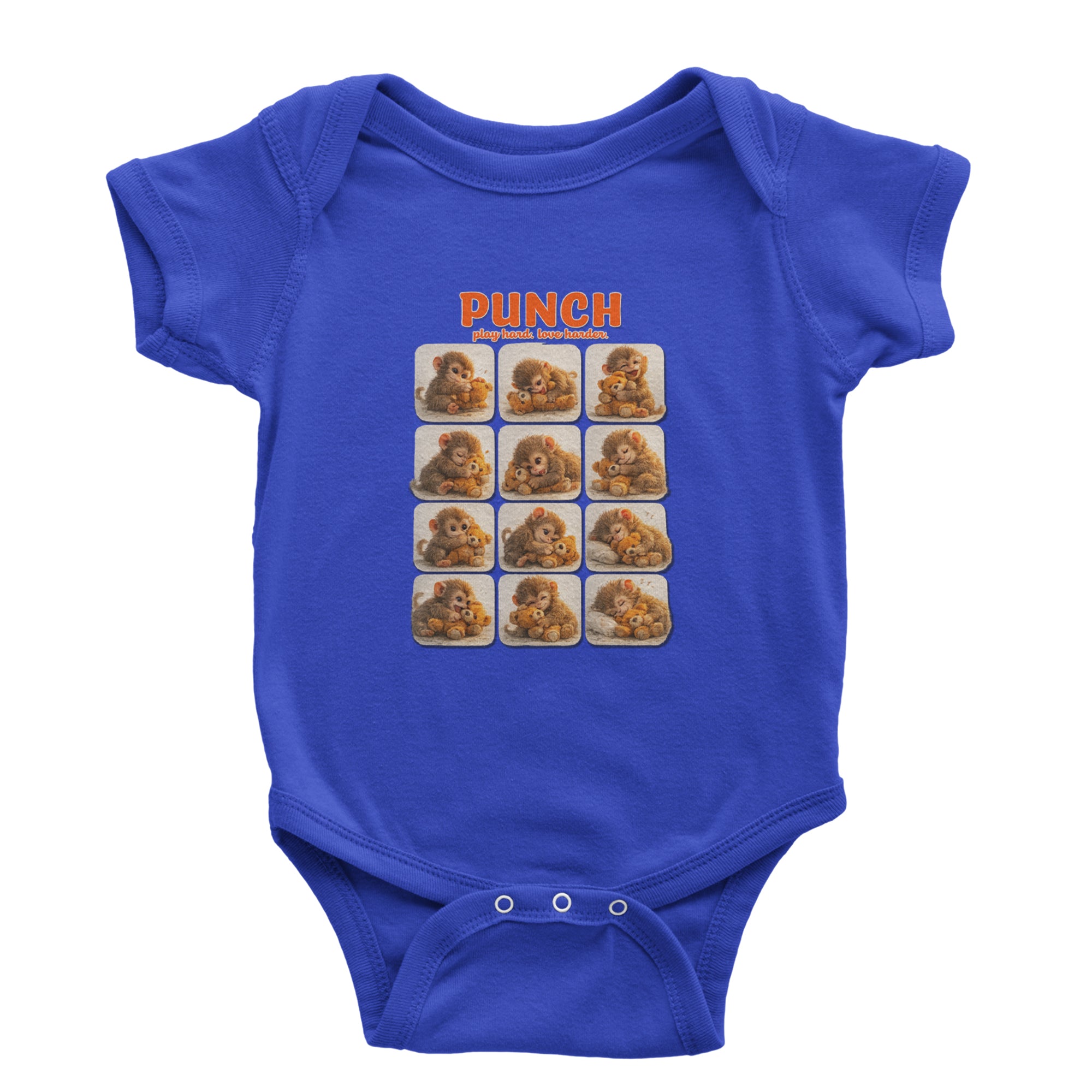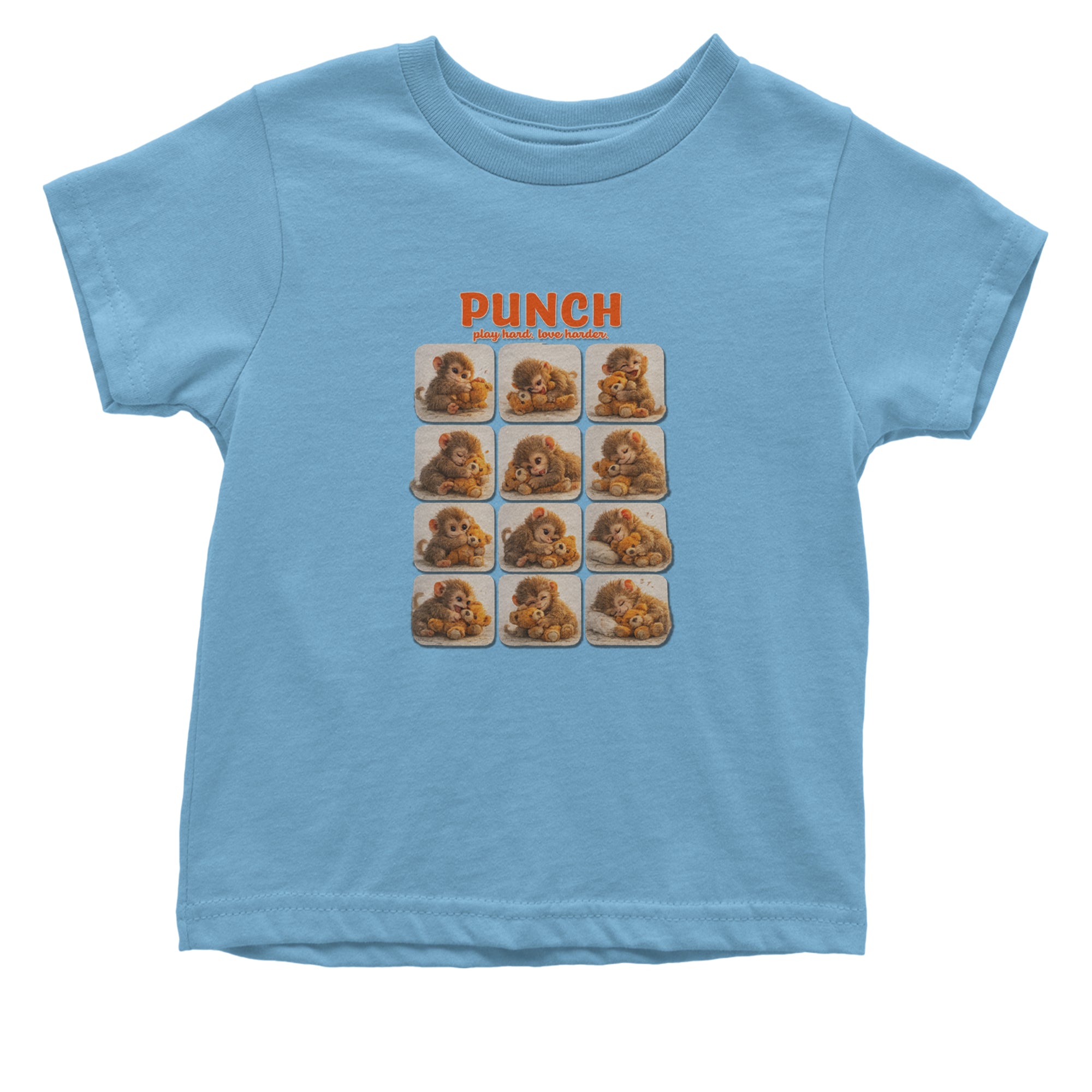 EVERY MOOD. ONE LITTLE MONKEY. | Chewing the plush, napping on it, laughing, brooding, cuddling - this design captures the full emotional range of the world's most relatable baby snow monkey in one epic grid. Fans will lose it. PLAY HARD. LOVE HARDER. | That is not just a tagline, that is Punch's entire biography. Japan zoo devotees, viral macaque followers, and anyone who has ever loved something with their whole chest will wear this like a badge of honor.