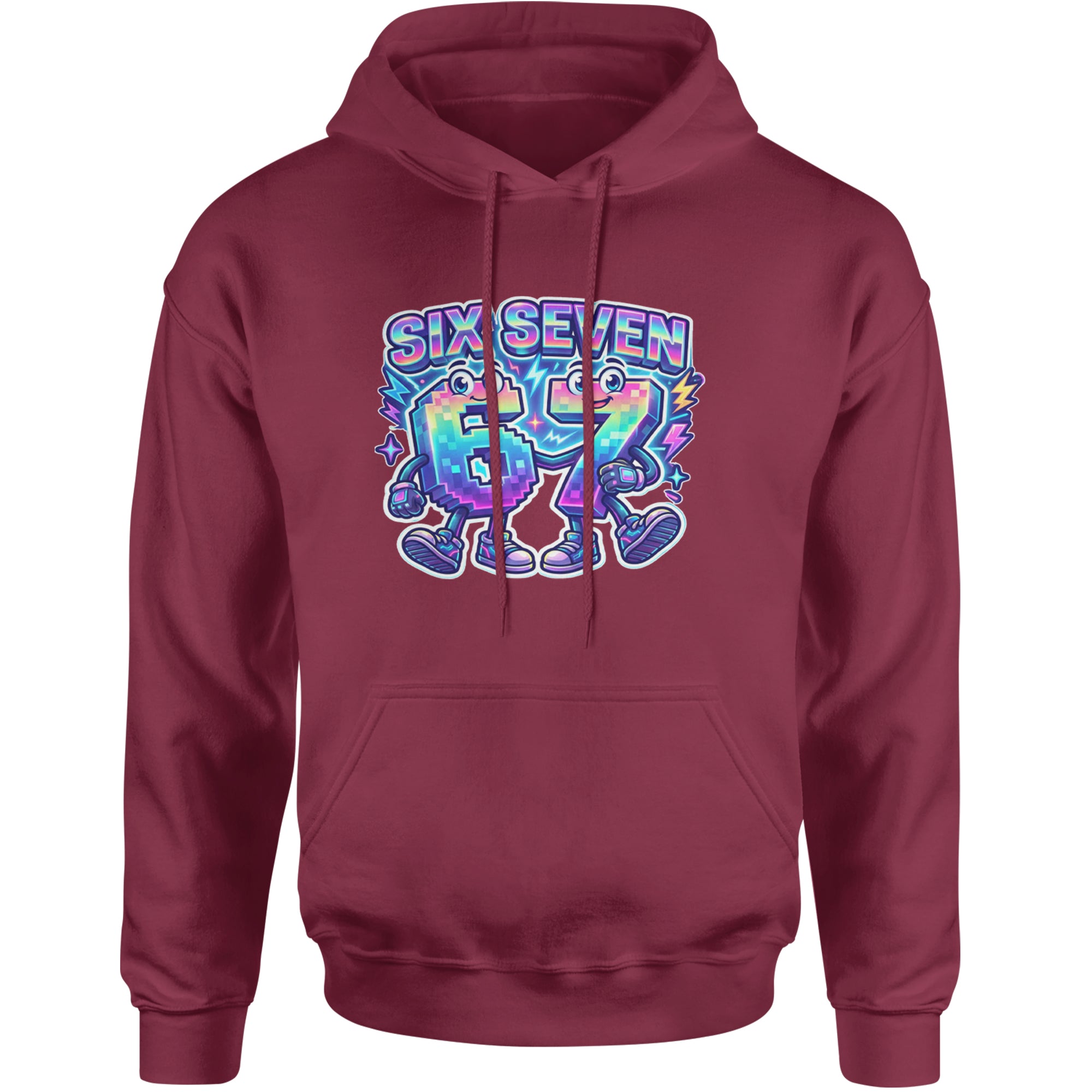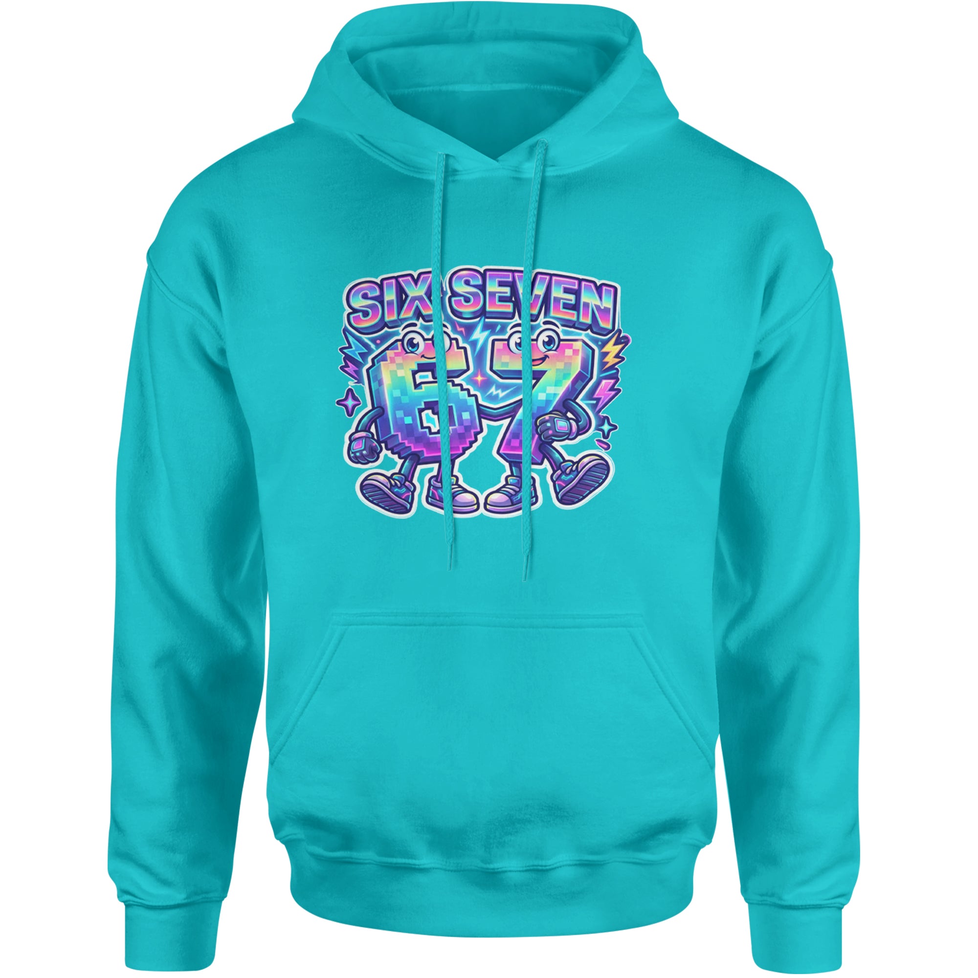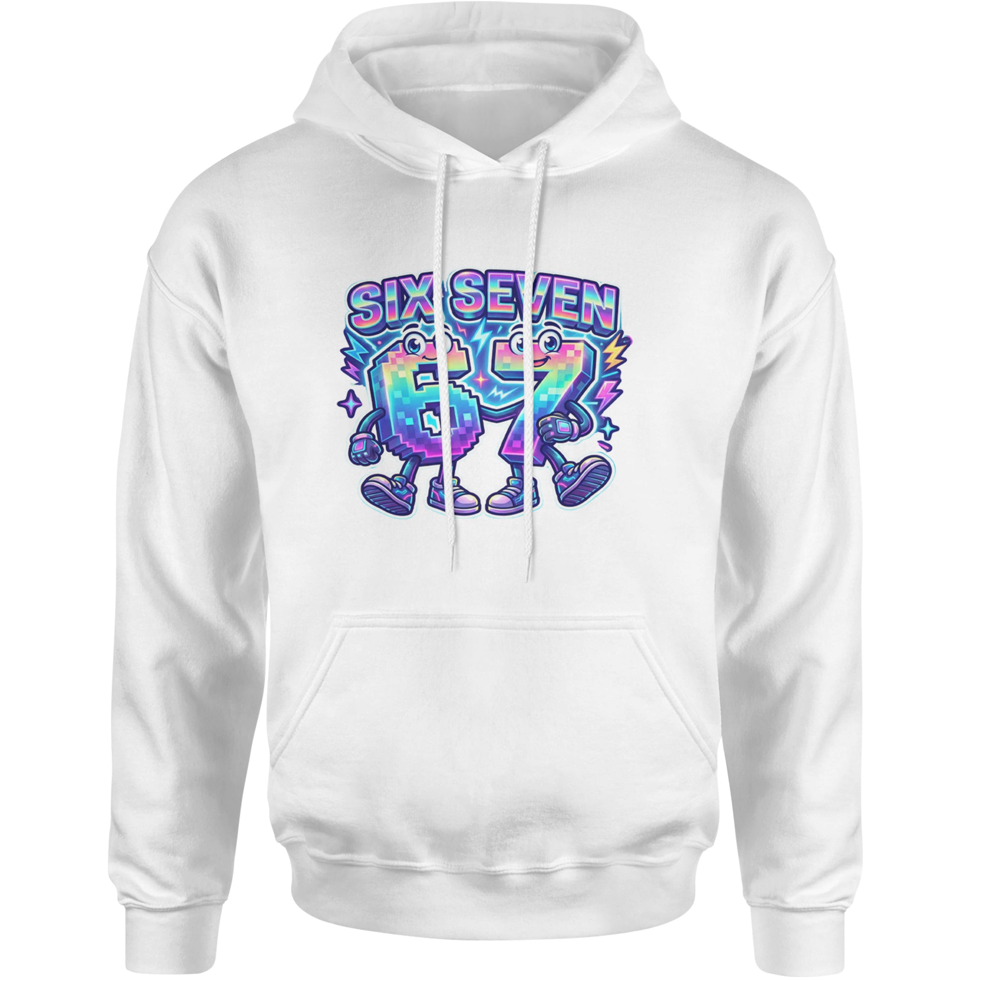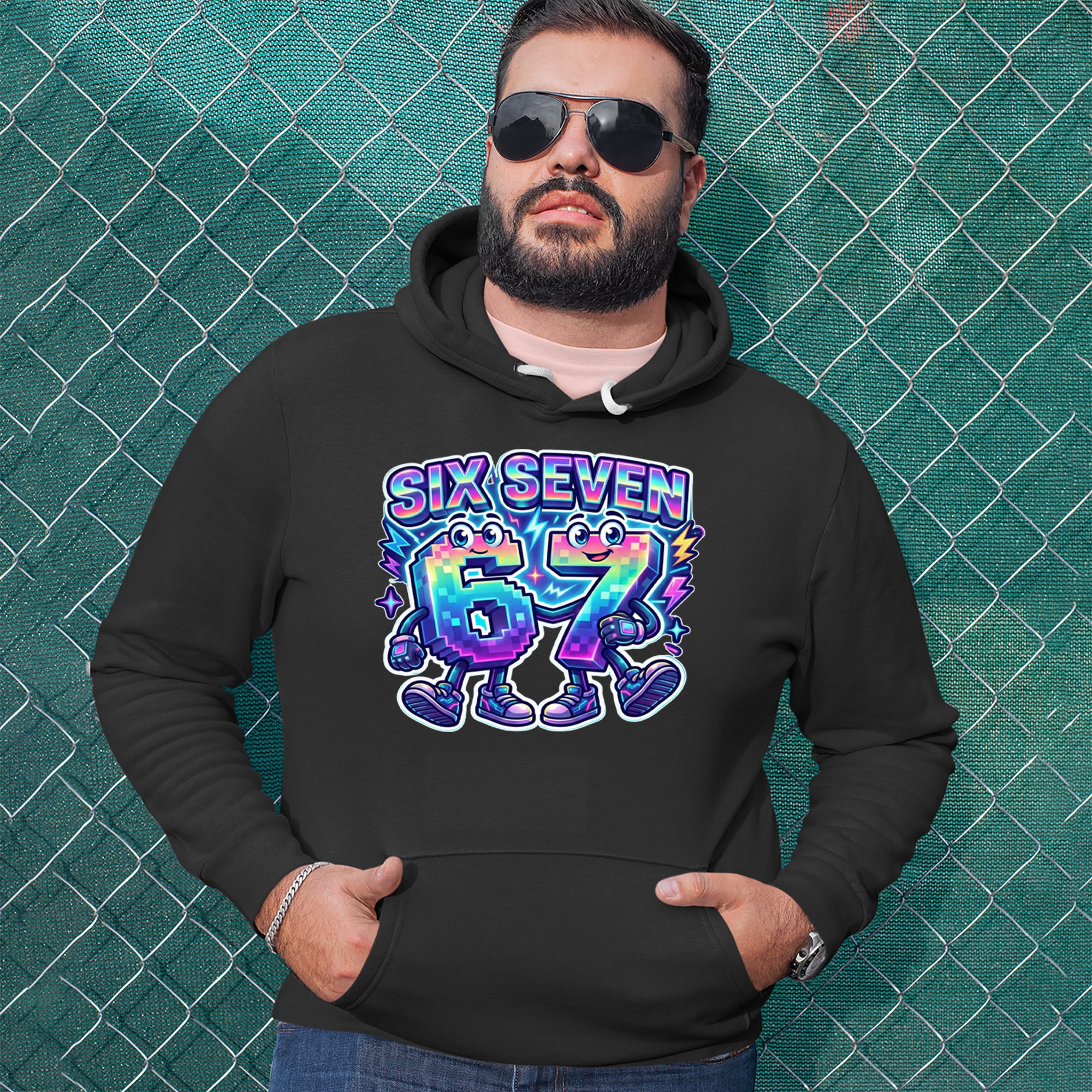 Colorful pixel 6 and 7 characters celebrate the viral Six Seven 67 meme, inspired by the TikTok brainrot number trend. Perfect for anyone who randomly blurts out six seven for no reason at all. Fun pick for Gen Alpha kids, meme lovers, hoop fans, and creators who live on reels and shorts. Bright neon rainbow style makes this 67 meme art pop in videos, streams, and everyday fit pics.