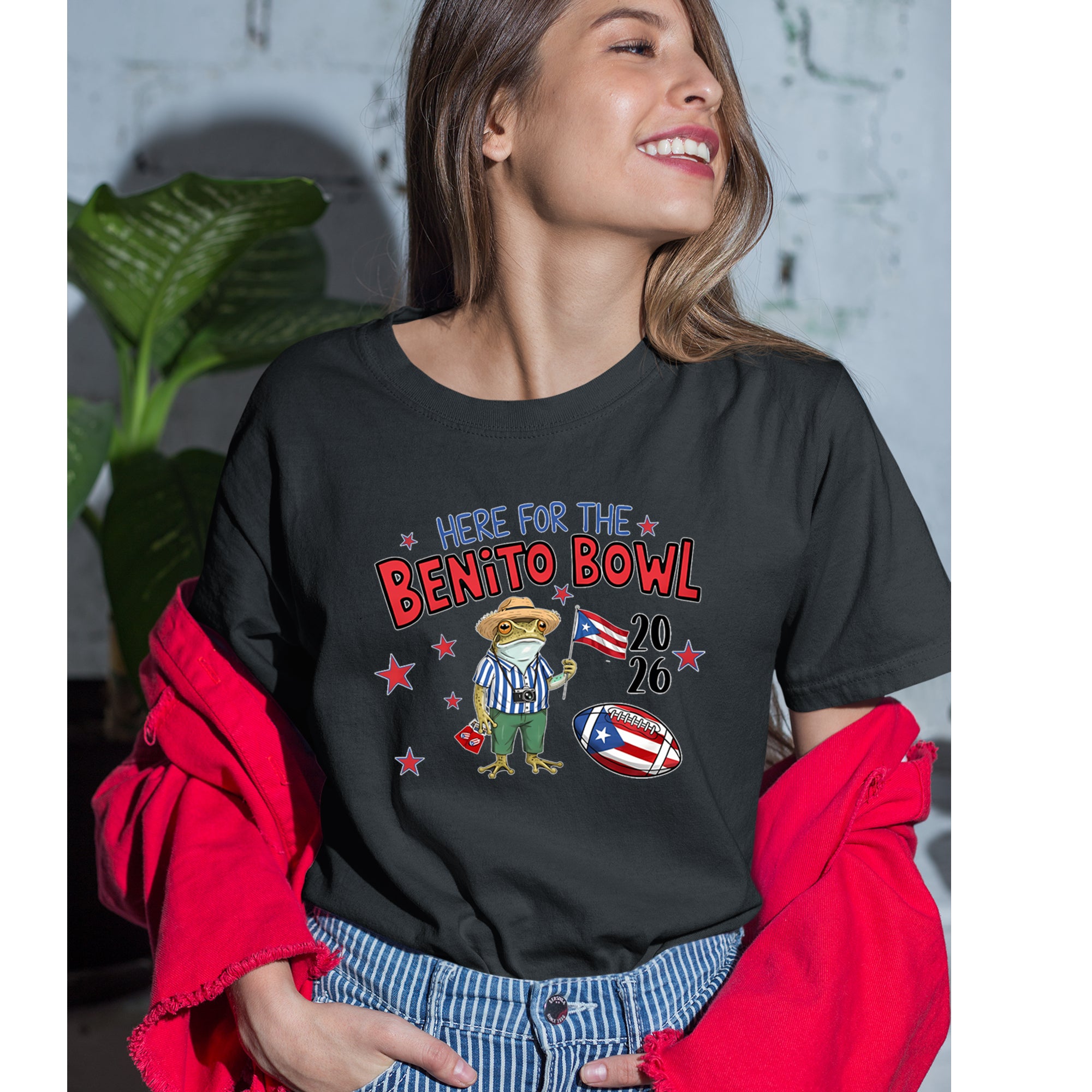 Get game-day ready island-style with this hilarious Benito Bowl 2026 design featuring a Puerto Rican coquí dressed like the ultimate tourist. It's a funny cultural crossover that brings the laughs and the pride. Whether you're in it for the football, the fiesta, or the frogs, this design is a must-have for fans of Puerto Rican humor, parody merch, and viral event tees.