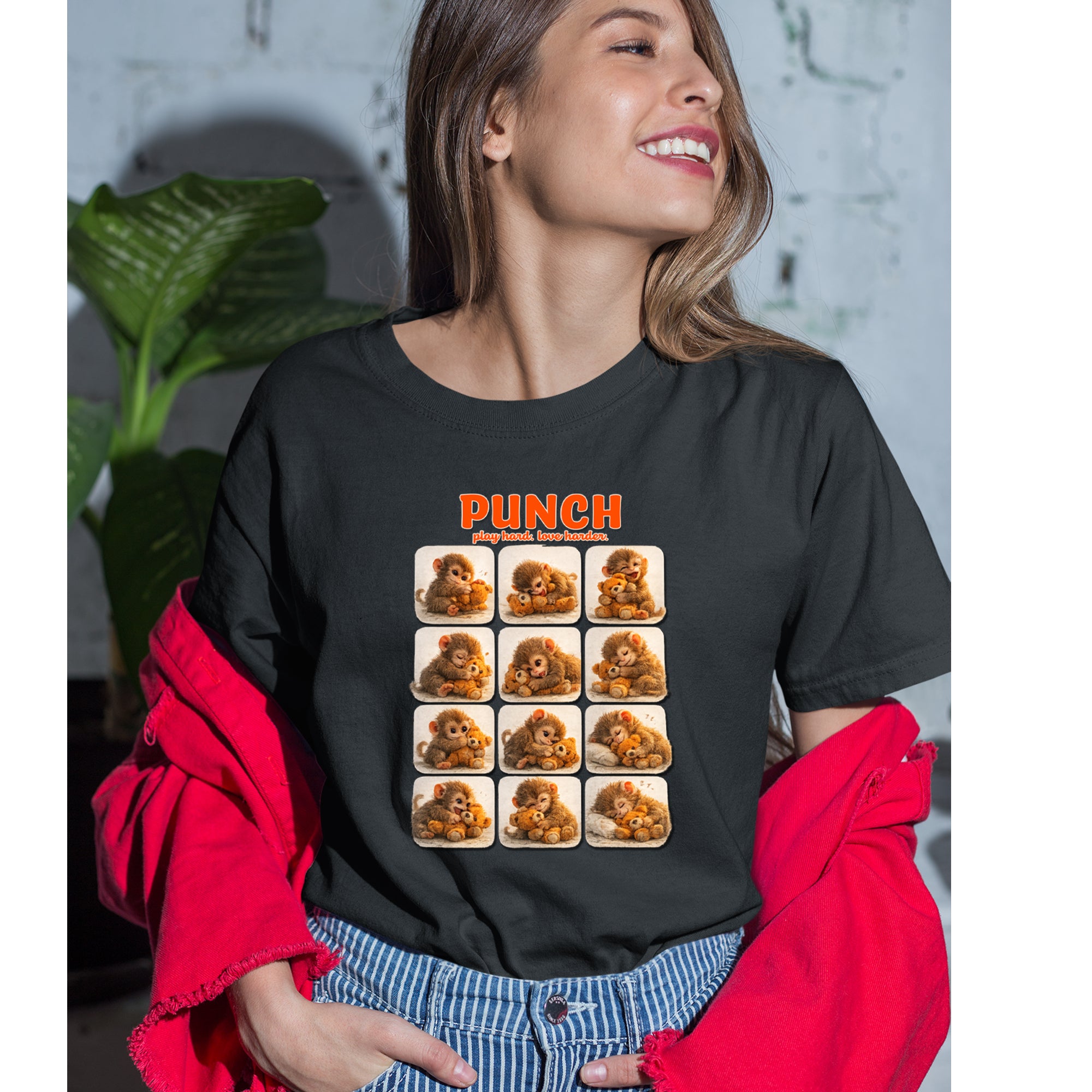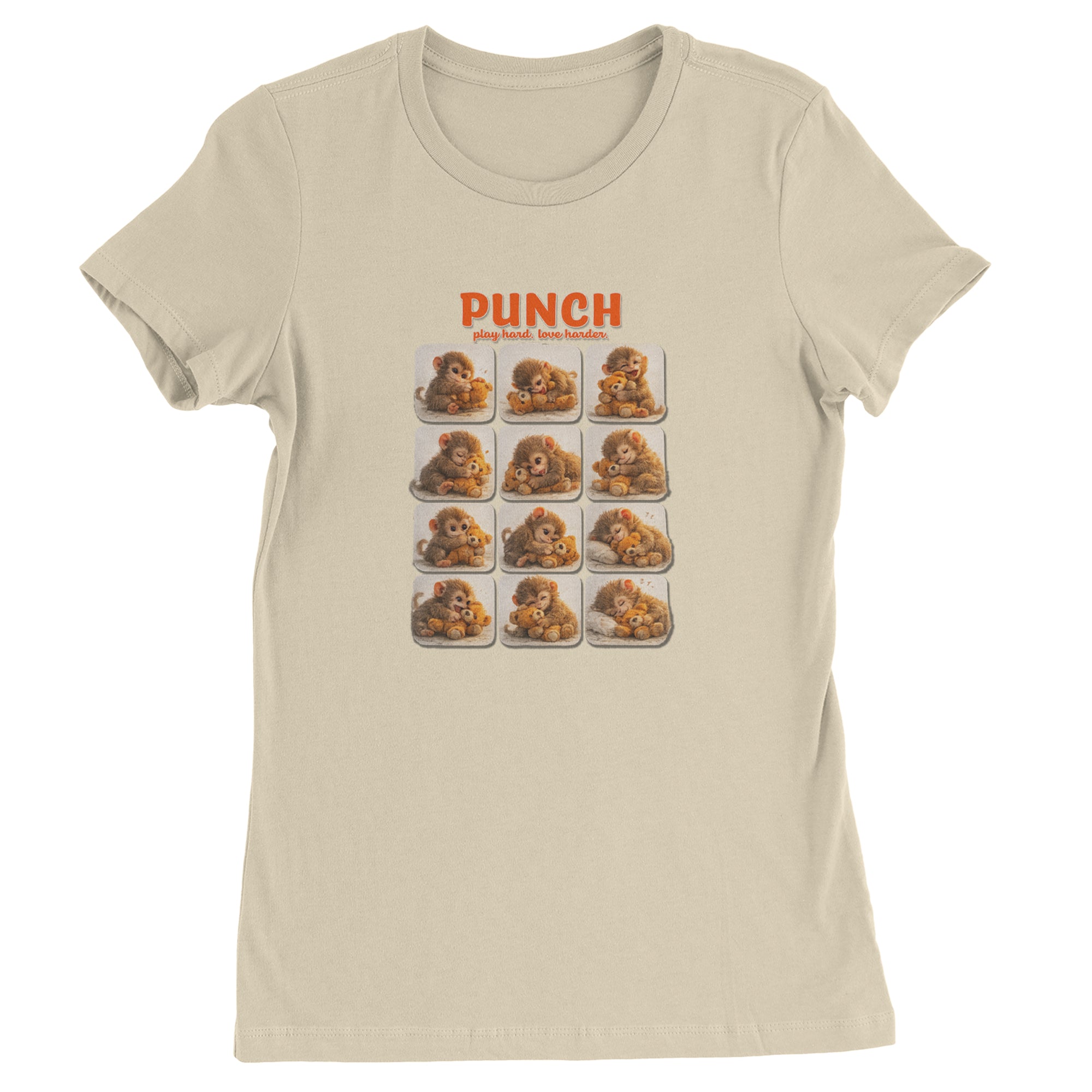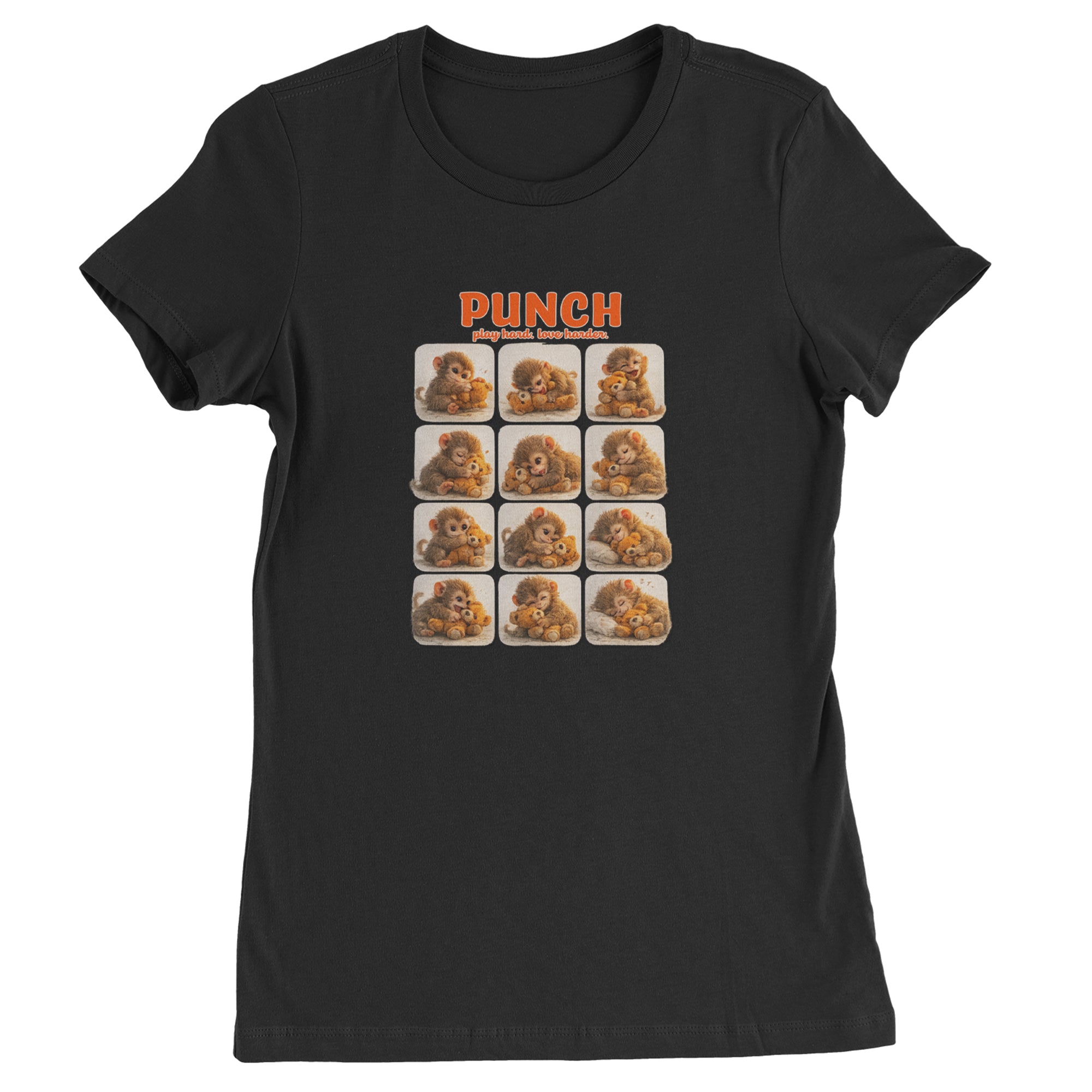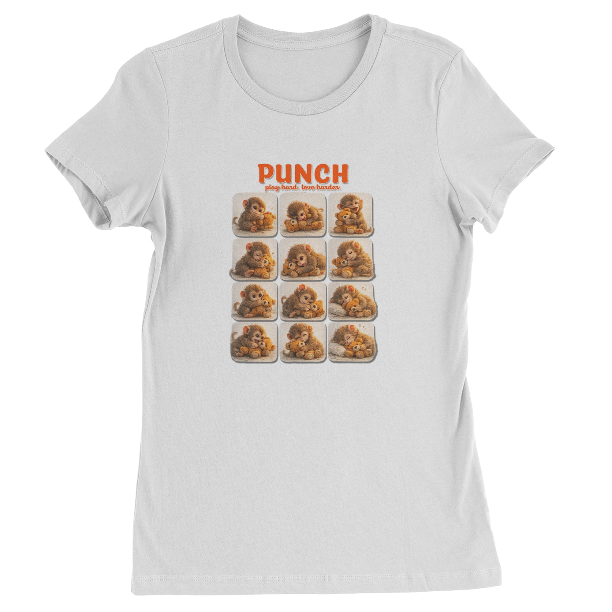EVERY MOOD. ONE LITTLE MONKEY. | Chewing the plush, napping on it, laughing, brooding, cuddling - this design captures the full emotional range of the world's most relatable baby snow monkey in one epic grid. Fans will lose it. PLAY HARD. LOVE HARDER. | That is not just a tagline, that is Punch's entire biography. Japan zoo devotees, viral macaque followers, and anyone who has ever loved something with their whole chest will wear this like a badge of honor.