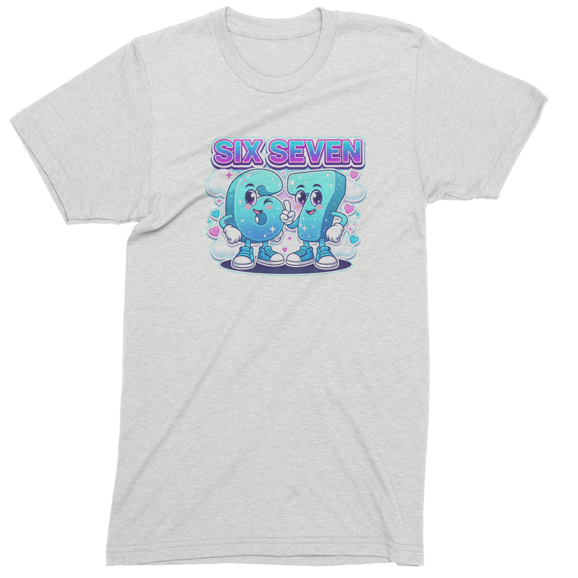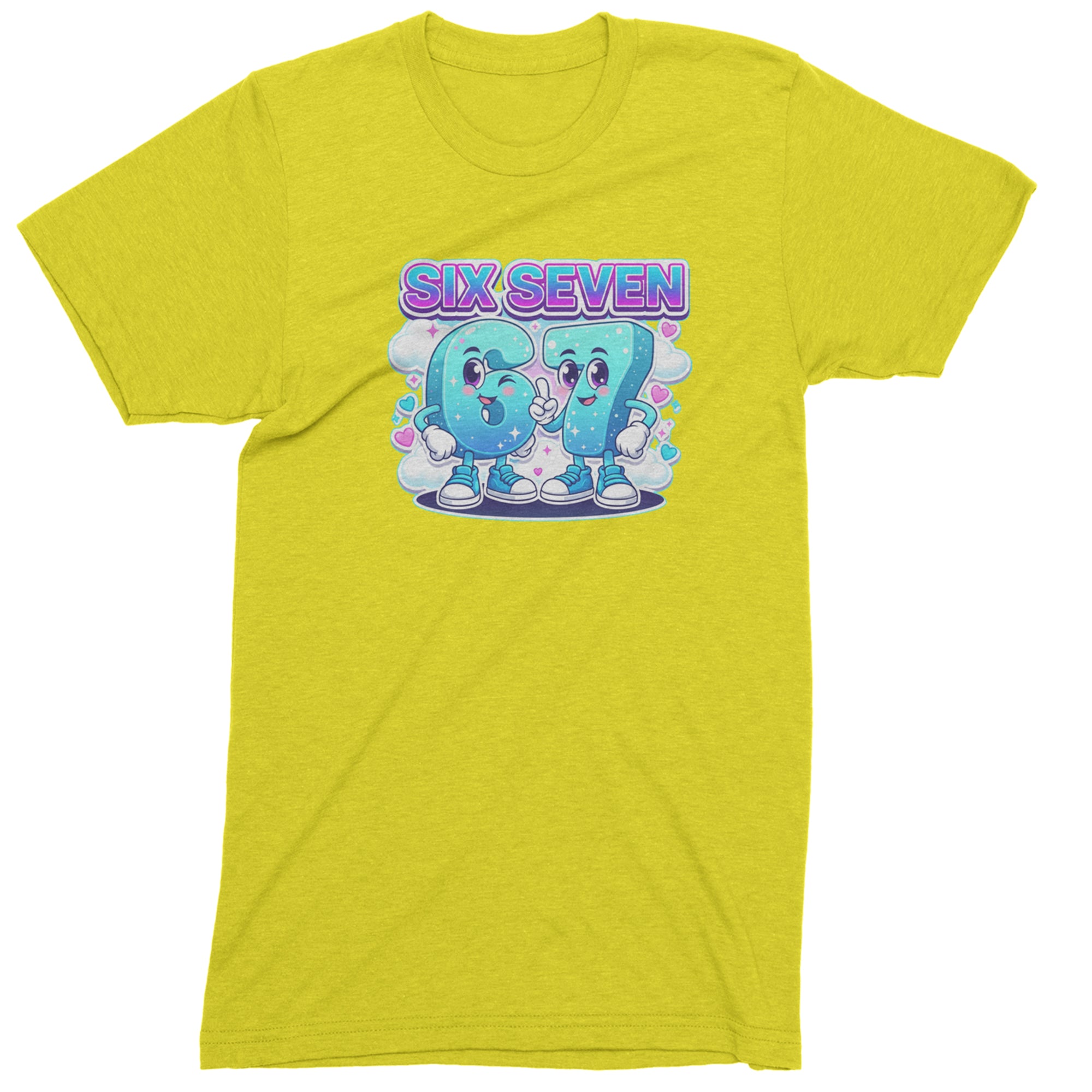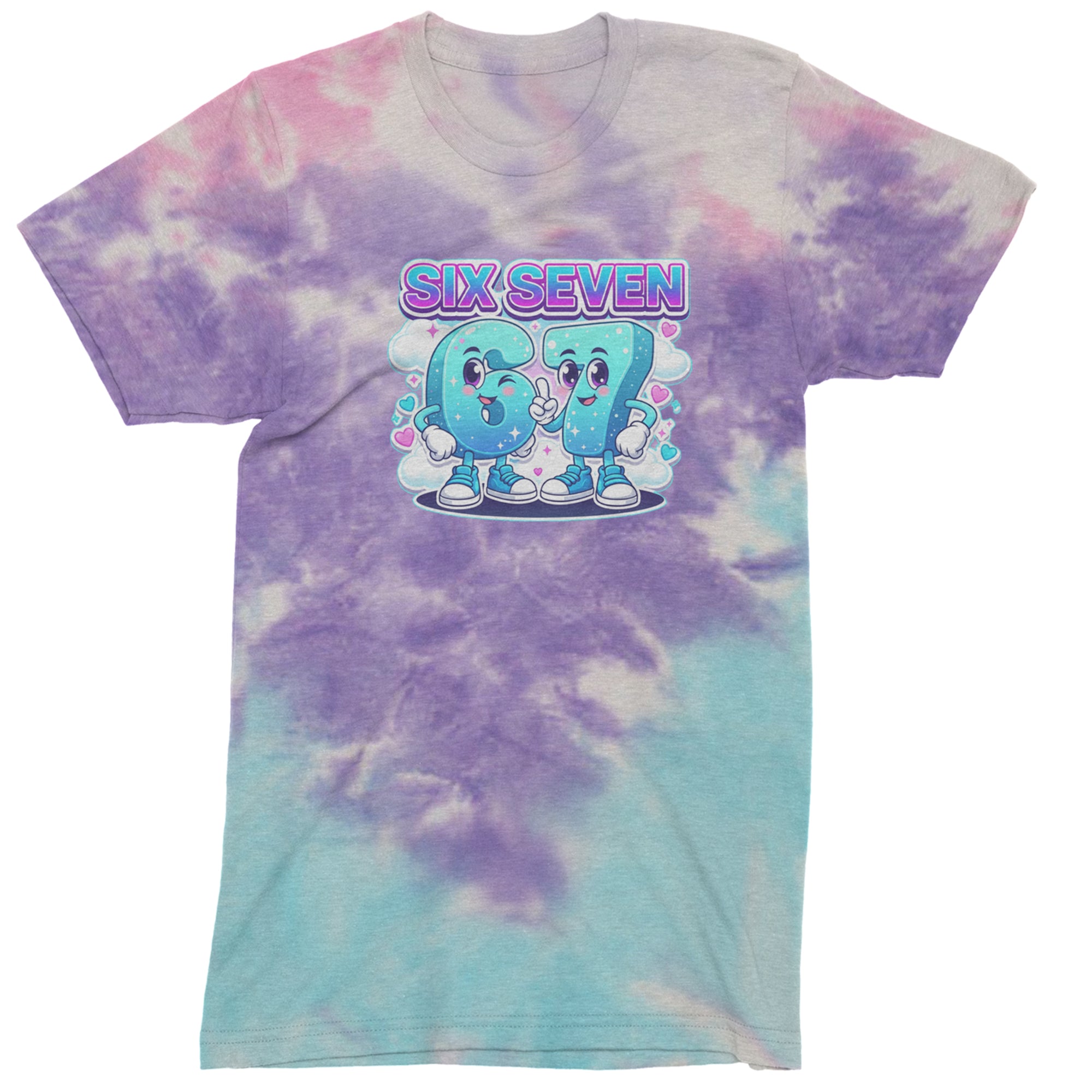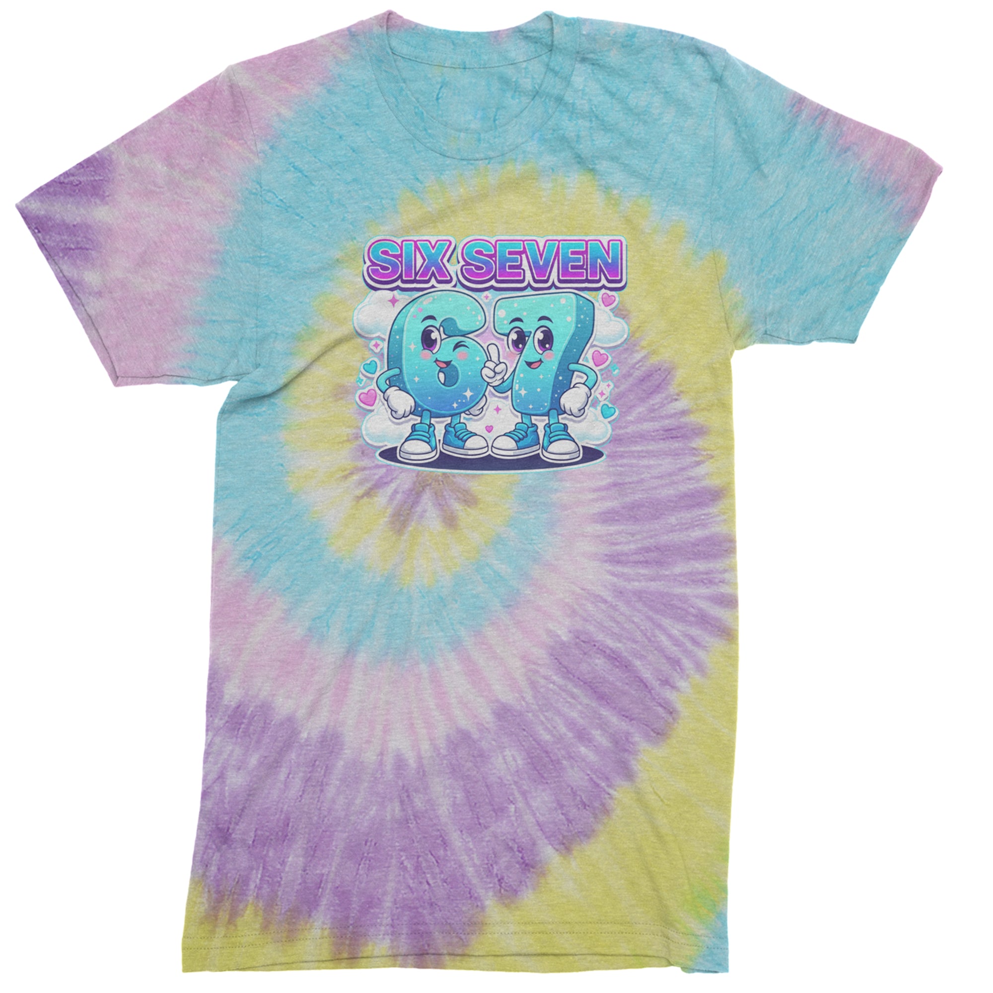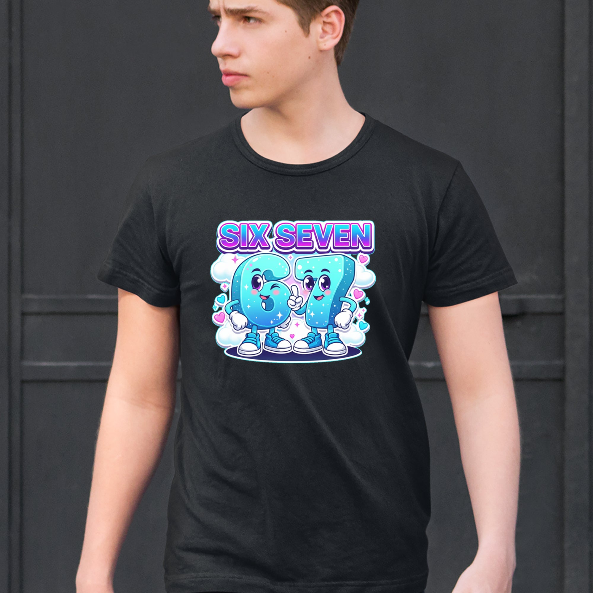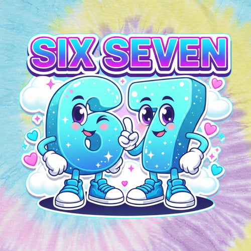 Adorable six and seven characters bring the viral 67 meme to life, surrounded by clouds, hearts, and sparkles for a soft pastel kawaii vibe kids and Gen Alpha fans love.. Perfect for meme lovers, TikTok scrollers, and number brainrot fans who keep saying six seven for no reason; great for everyday outfits, edits, and funny pop culture fits..