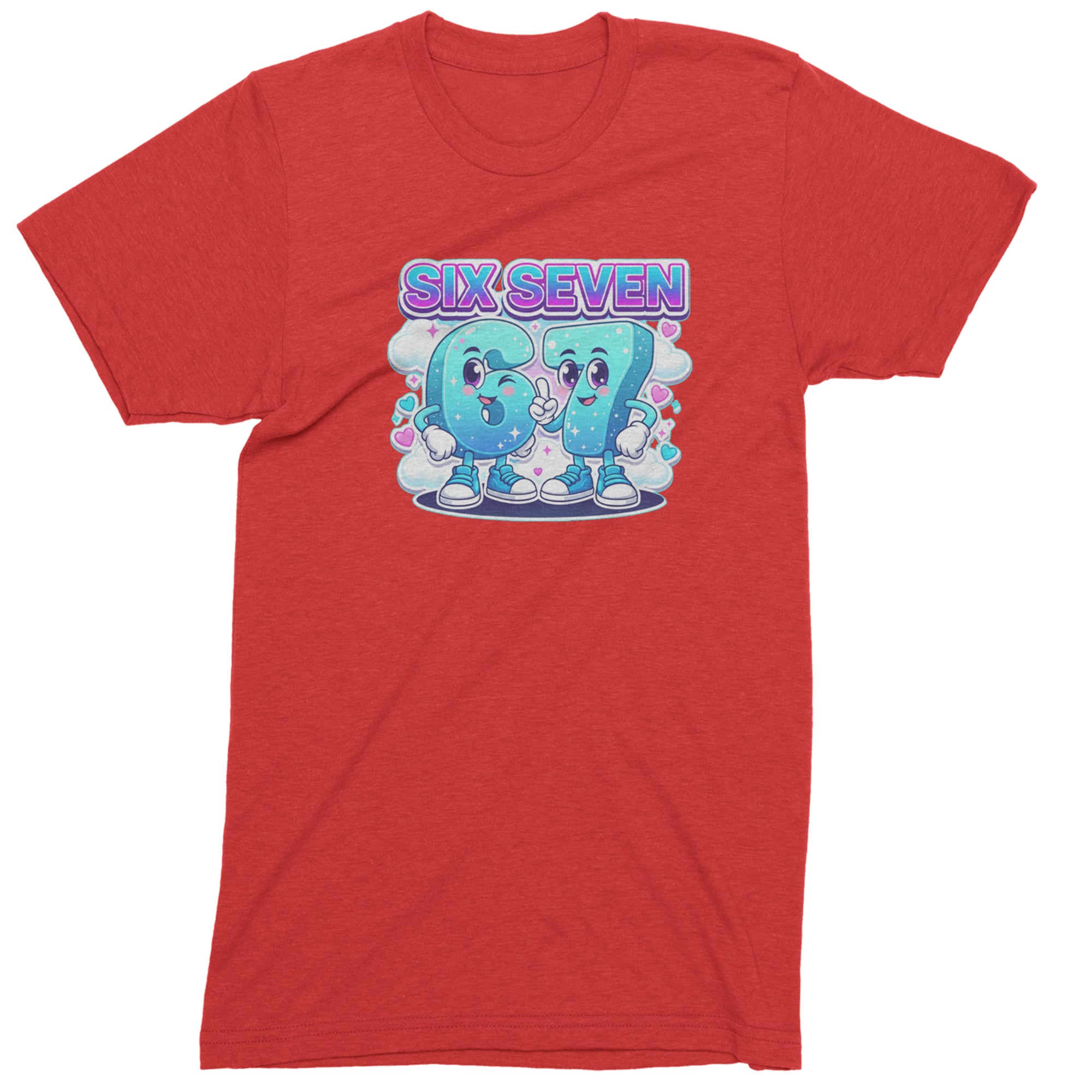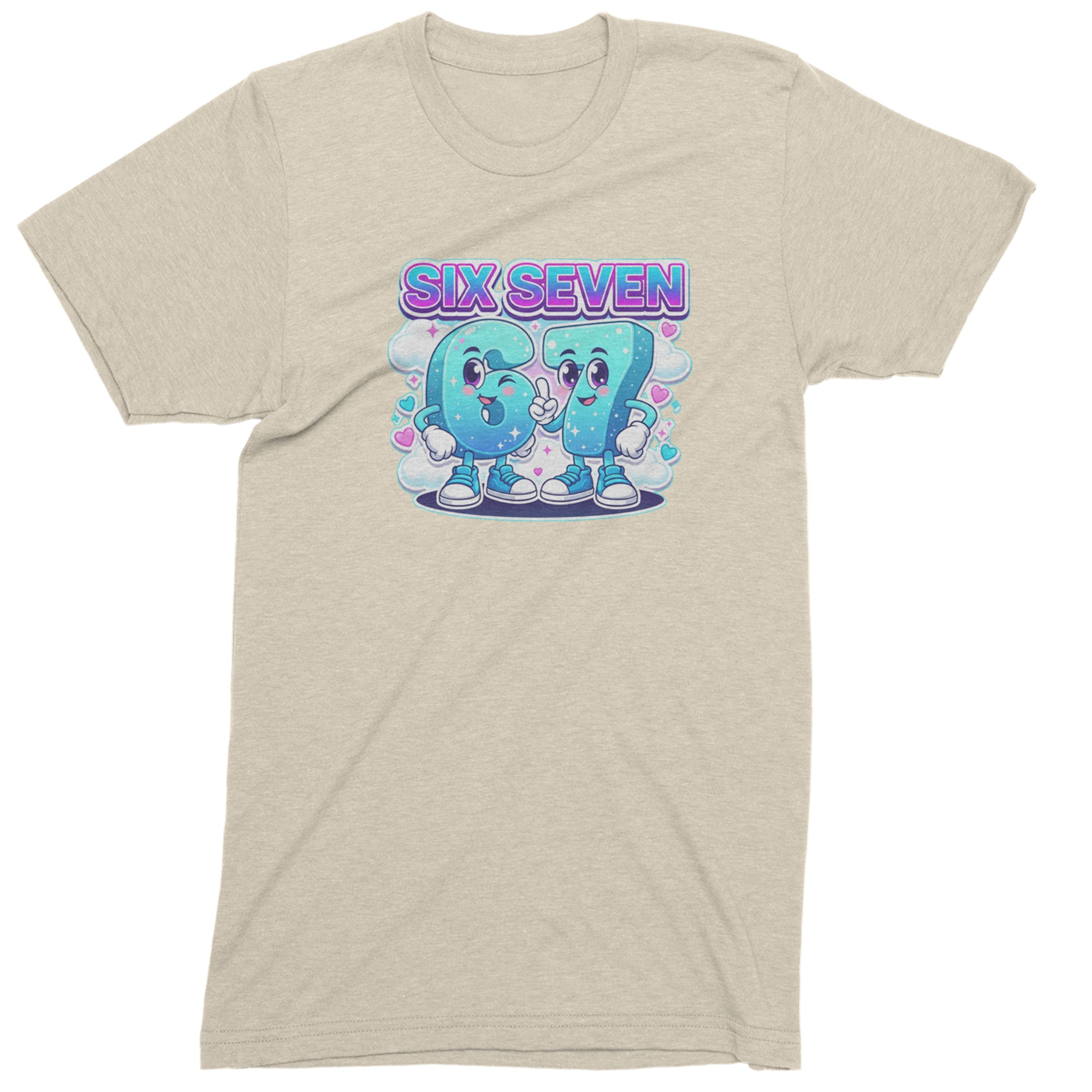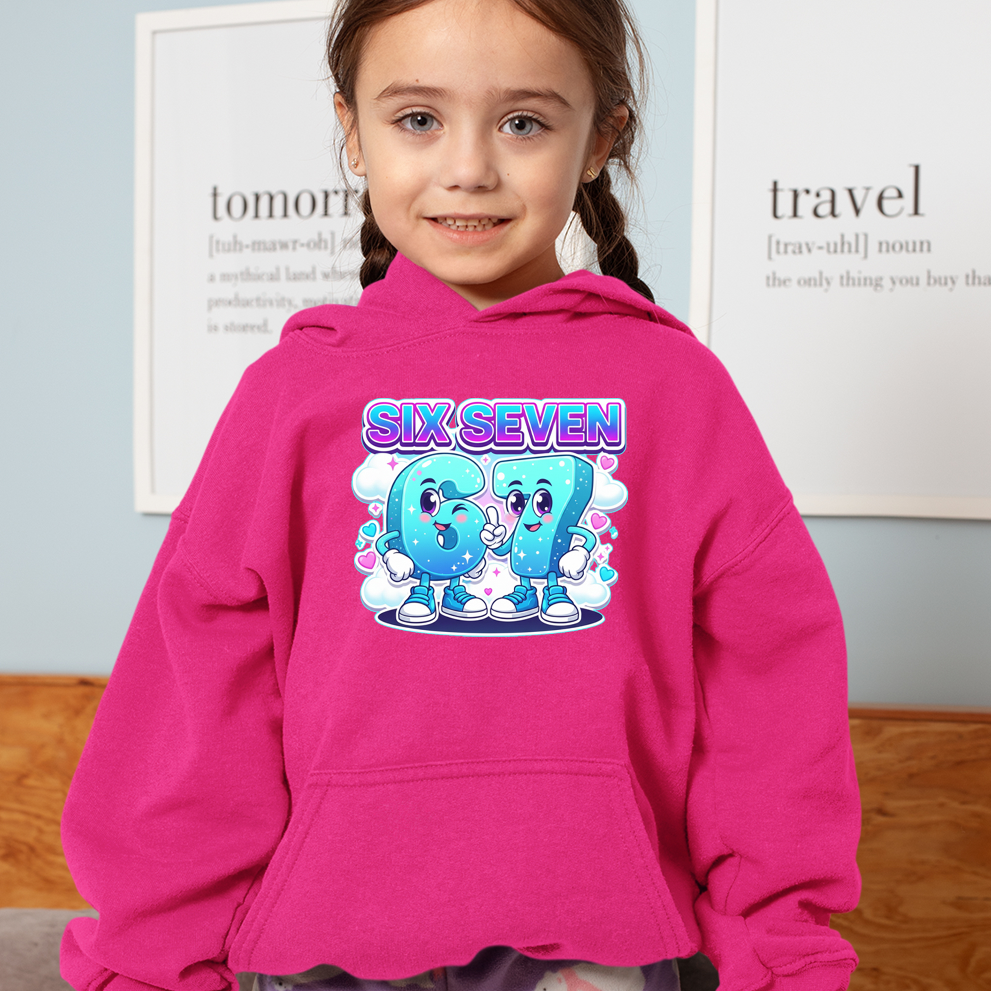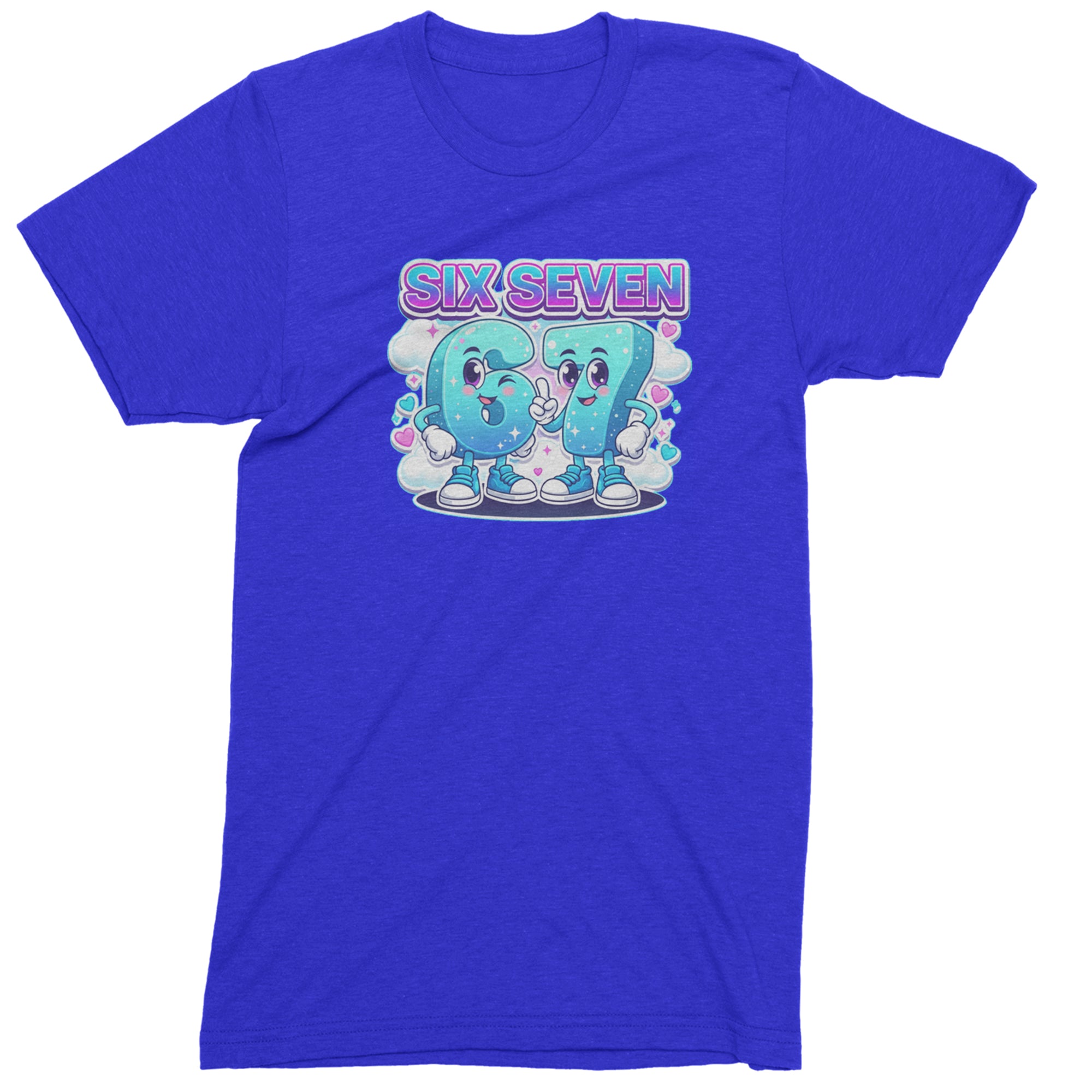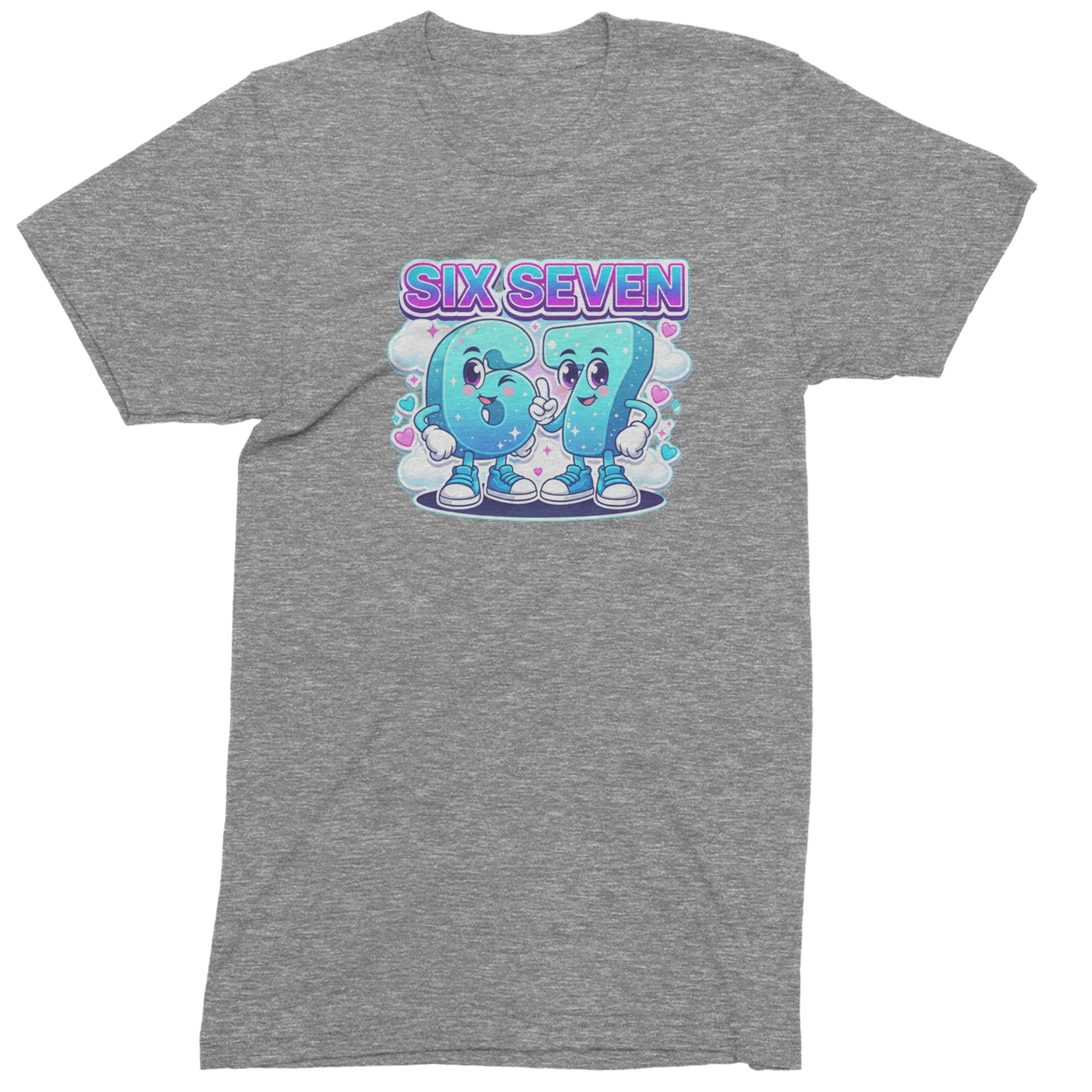 Adorable six and seven characters bring the viral 67 meme to life, surrounded by clouds, hearts, and sparkles for a soft pastel kawaii vibe kids and Gen Alpha fans love.. Perfect for meme lovers, TikTok scrollers, and number brainrot fans who keep saying six seven for no reason; great for everyday outfits, edits, and funny pop culture fits..