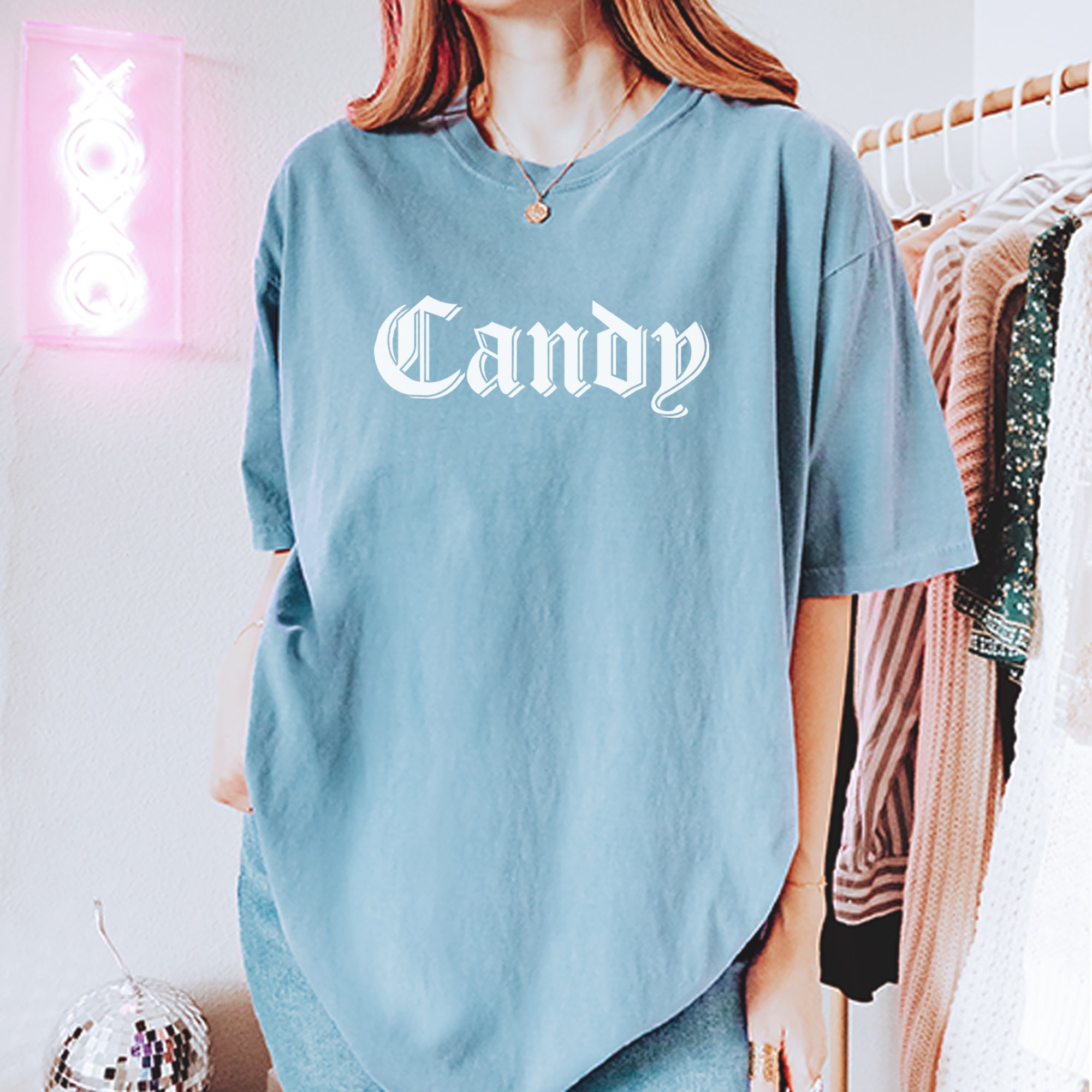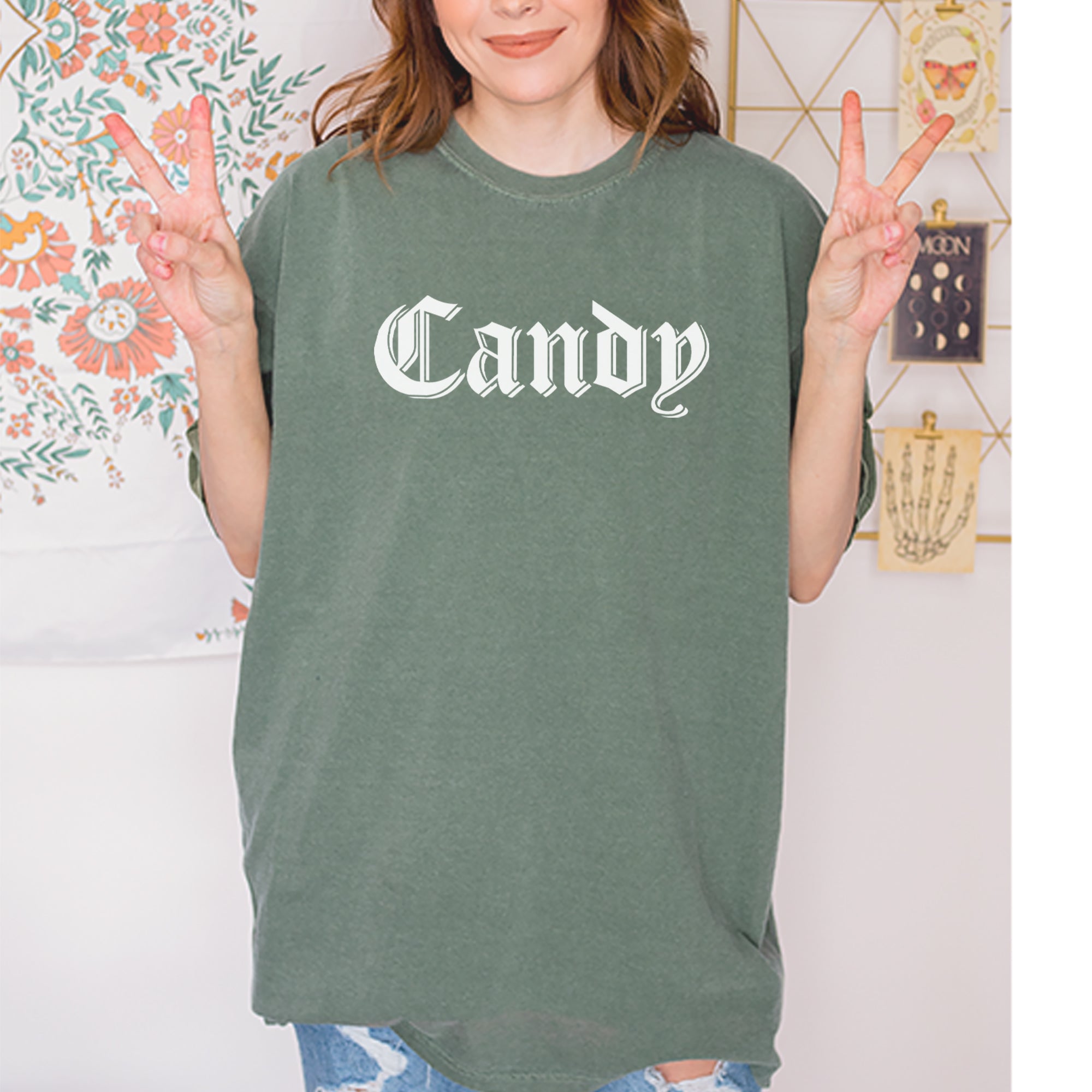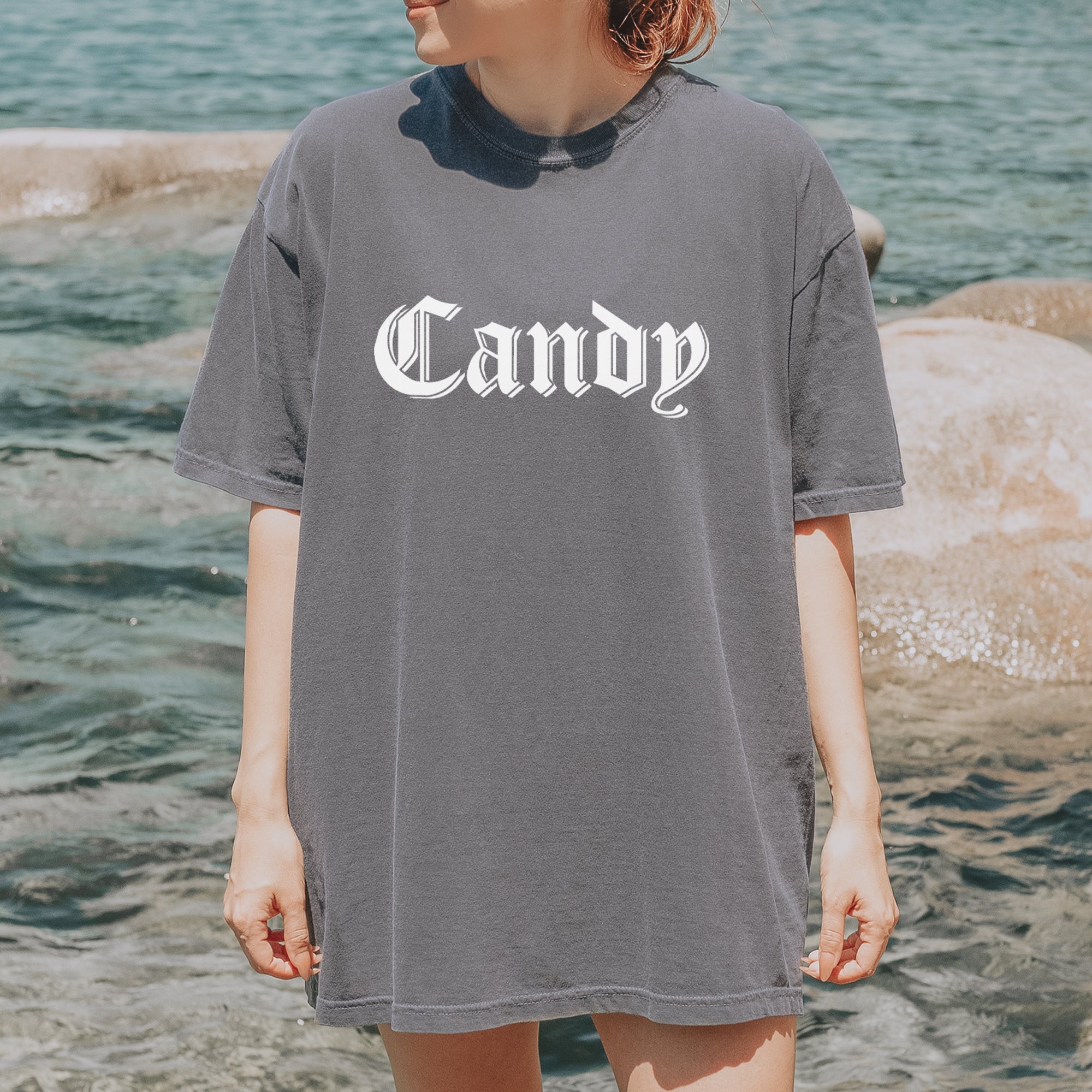 Sugar meets street with this bold "Candy" design in Old English font. It's giving sweet with a side of savage — perfect for turning heads and breaking hearts.. Whether you're rocking Y2K vibes or just love the contrast of cute and edgy, this aesthetic hits different. Ideal for baddies, trendsetters, and anyone who knows they're a treat..