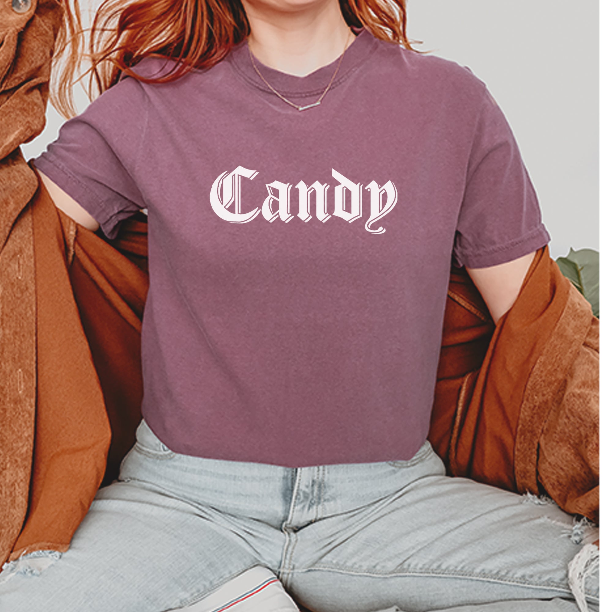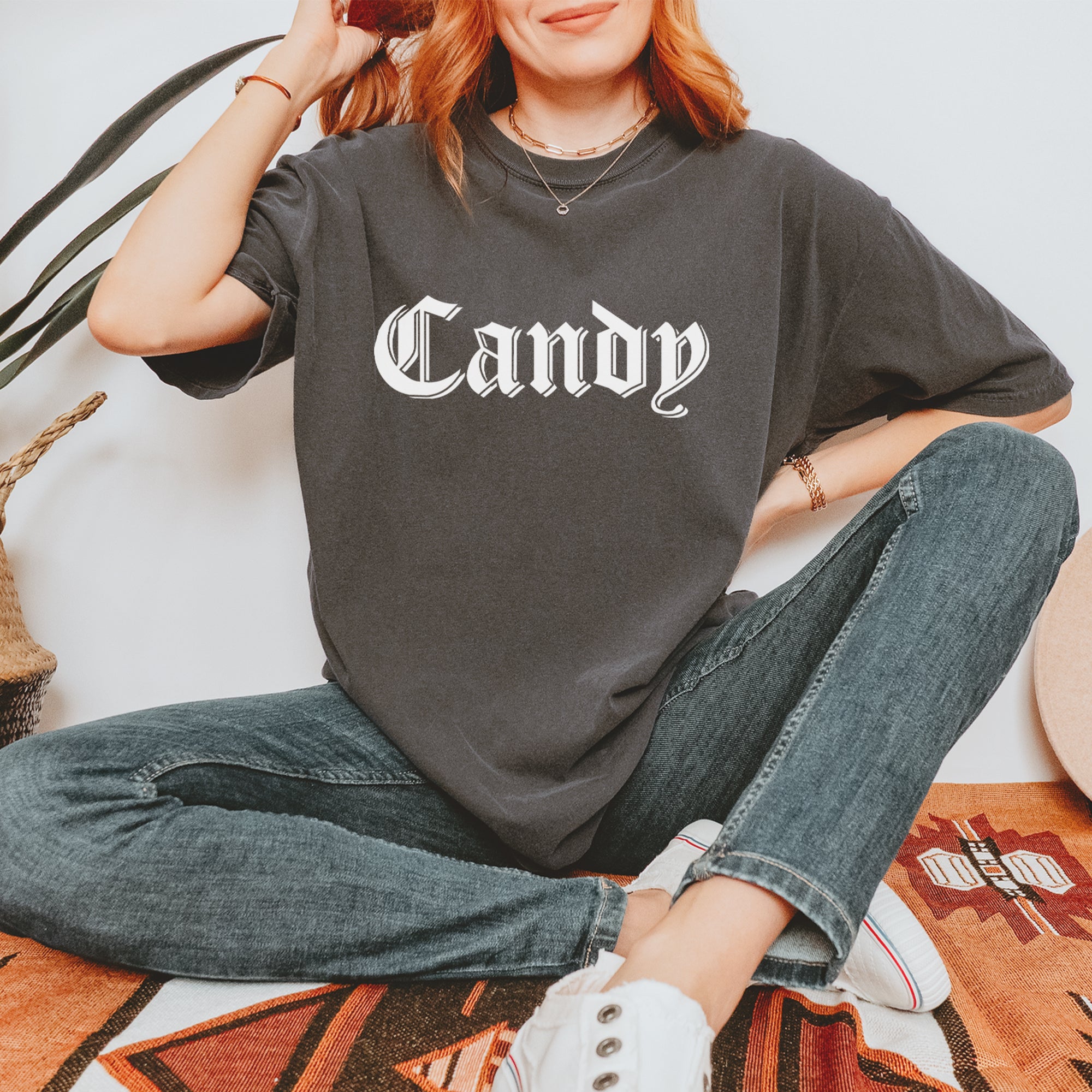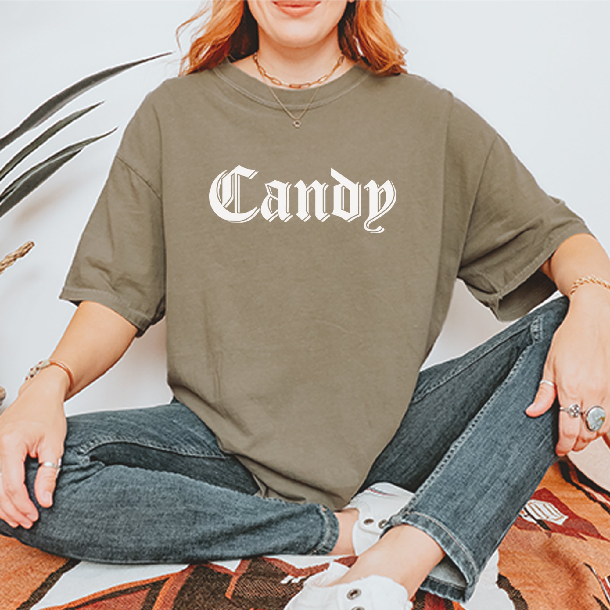 Sugar meets street with this bold "Candy" design in Old English font. It's giving sweet with a side of savage — perfect for turning heads and breaking hearts.. Whether you're rocking Y2K vibes or just love the contrast of cute and edgy, this aesthetic hits different. Ideal for baddies, trendsetters, and anyone who knows they're a treat..