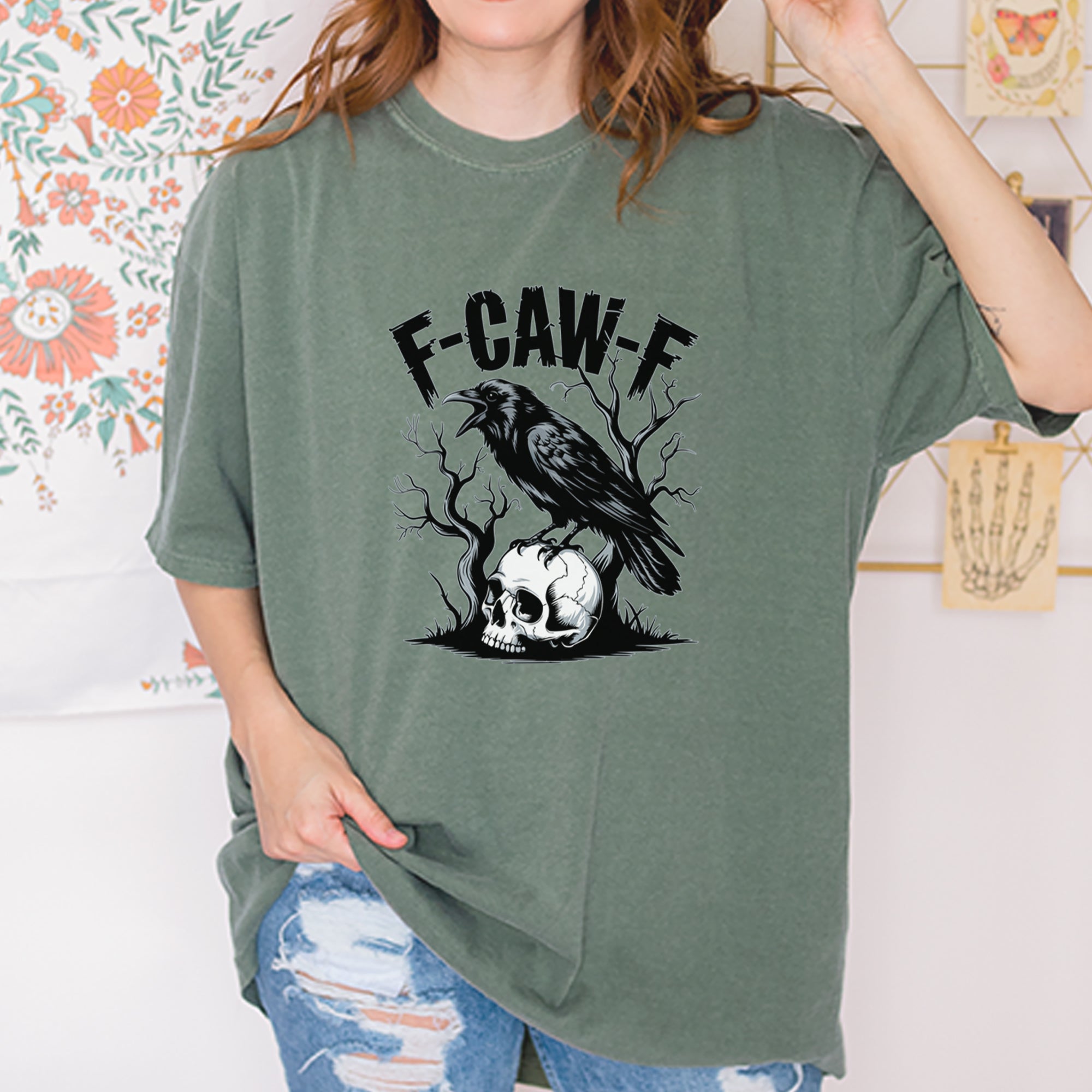 F-CAW-F is the viral way to say "back off" without saying it - perfect for anyone who loves dark humor, crows, and a little chaos.. Featuring a bold black crow perched on a skull with eerie tree branches, this design blends gothic vibes with meme-worthy snark. .