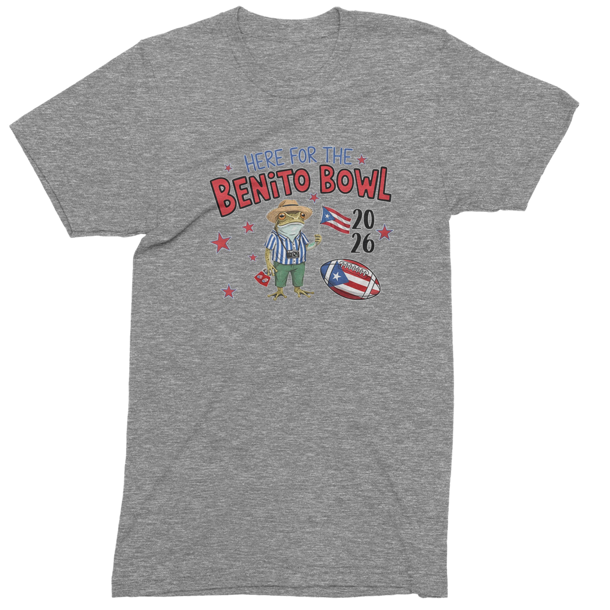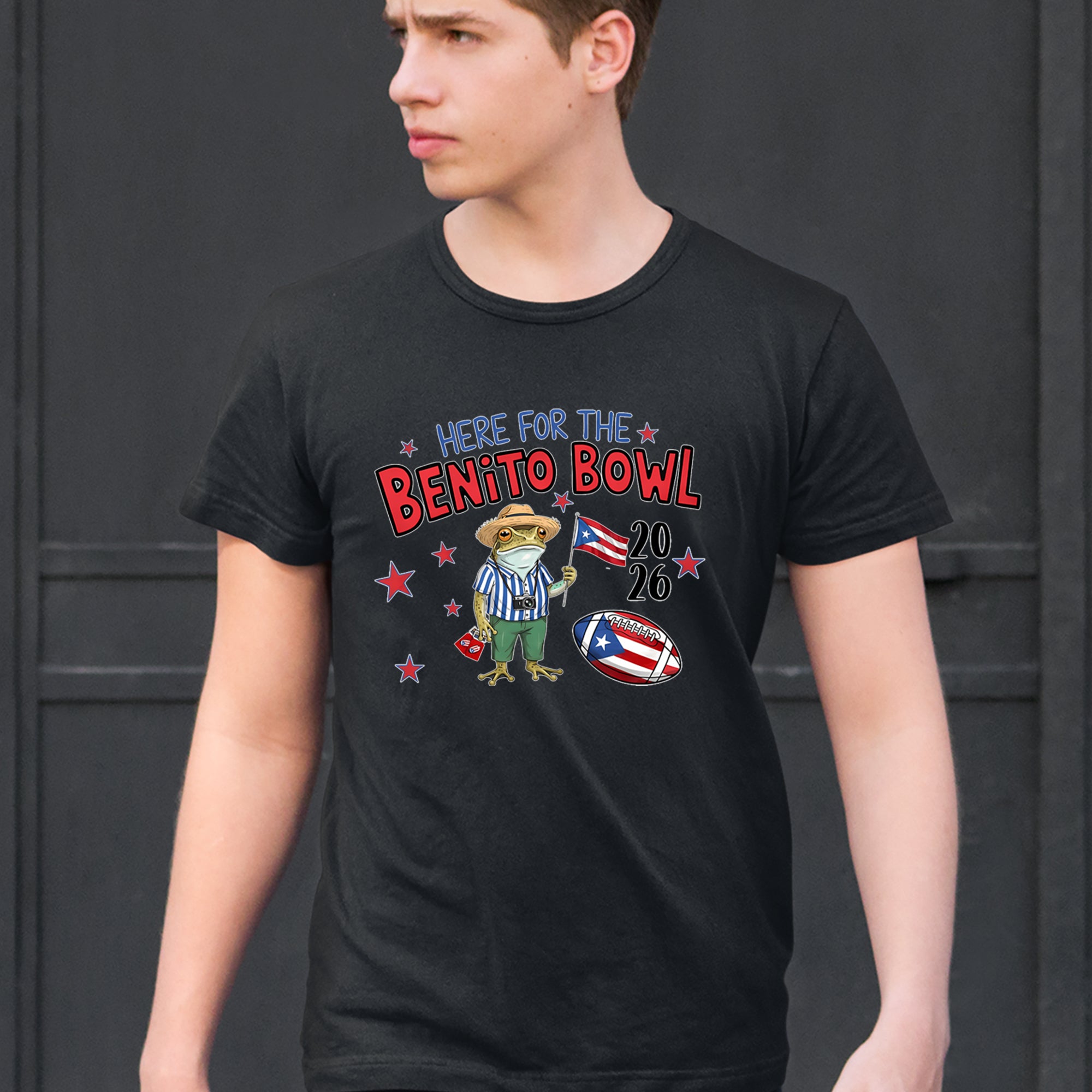 Get game-day ready island-style with this hilarious Benito Bowl 2026 design featuring a Puerto Rican coquí dressed like the ultimate tourist. It's a funny cultural crossover that brings the laughs and the pride.. Whether you're in it for the football, the fiesta, or the frogs, this design is a must-have for fans of Puerto Rican humor, parody merch, and viral event tees..