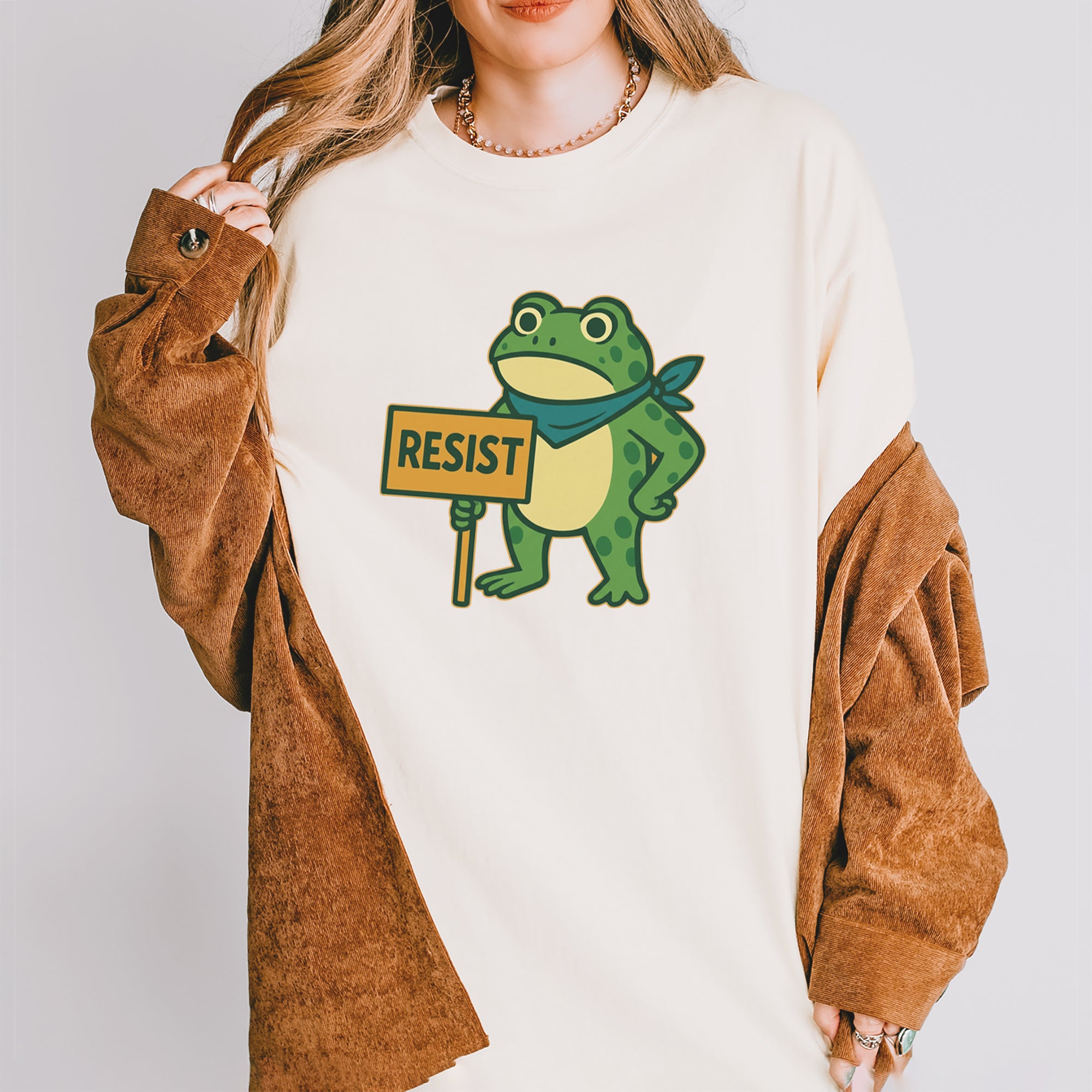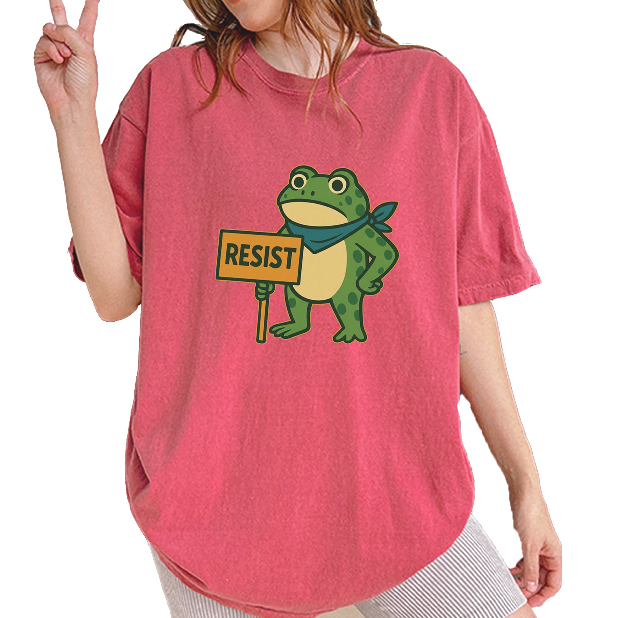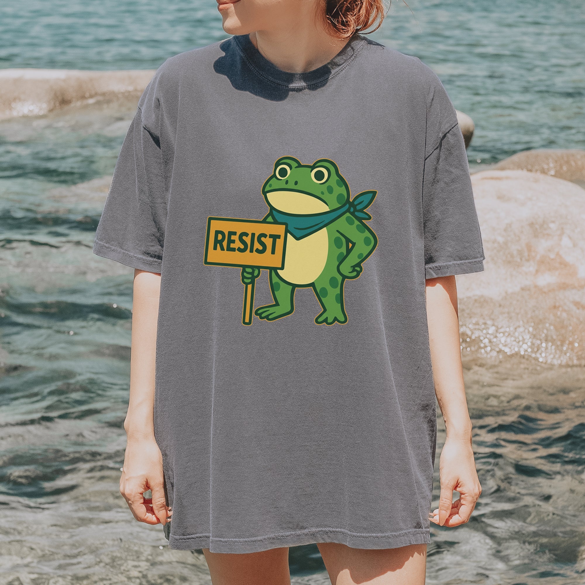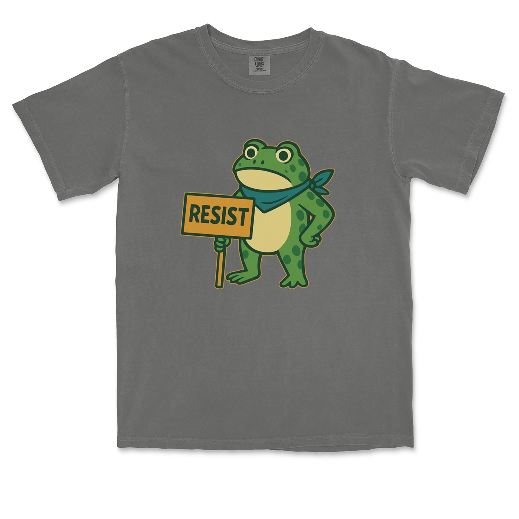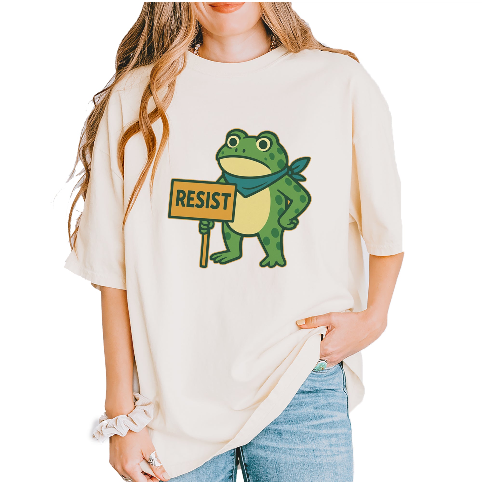 Cute but committed, this protest frog stands firm with sign in hand, bringing big energy from the streets of Portland to your wardrobe – a viral meme turned symbol of peaceful defiance.. Whether you're marching IRL or just resisting in spirit, this bold cartoon design mixes protest art with meme culture for a look that's both playful and powerful. Ribbiting Resistance..