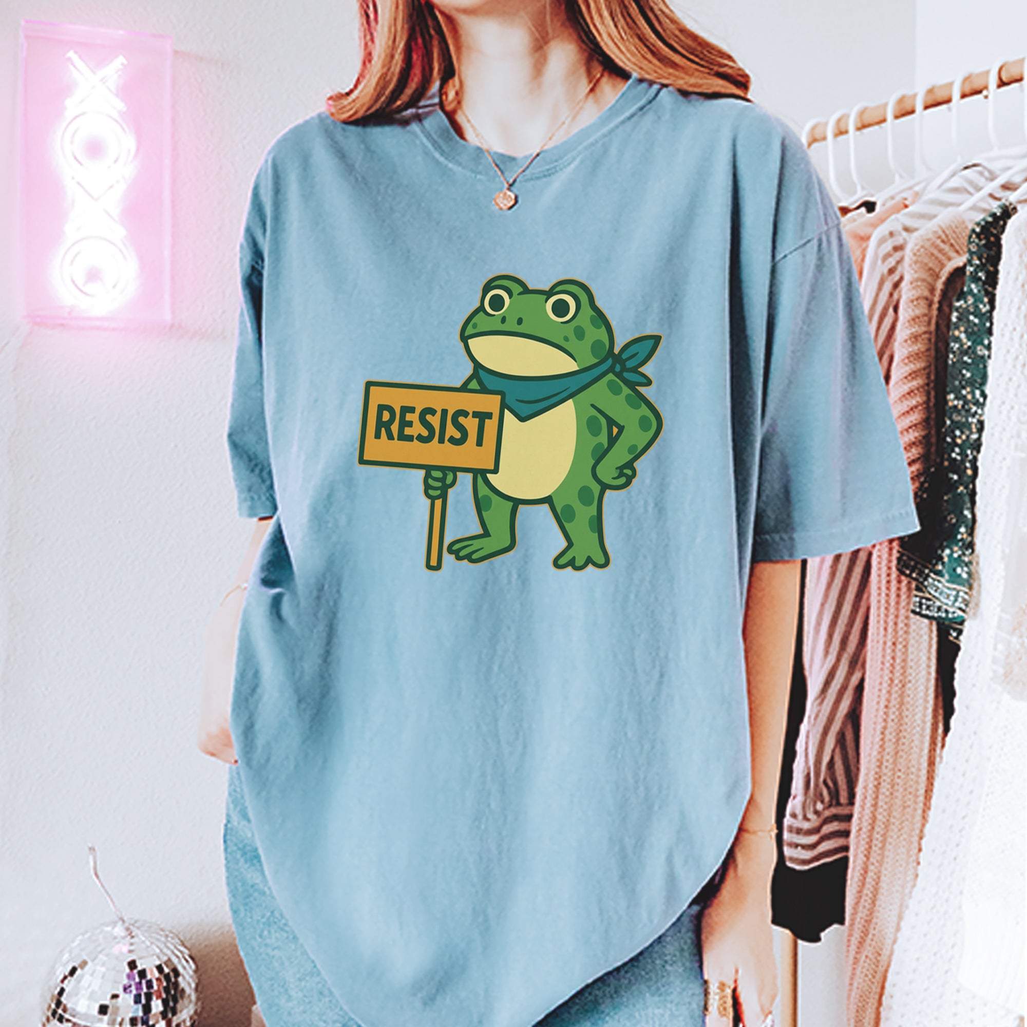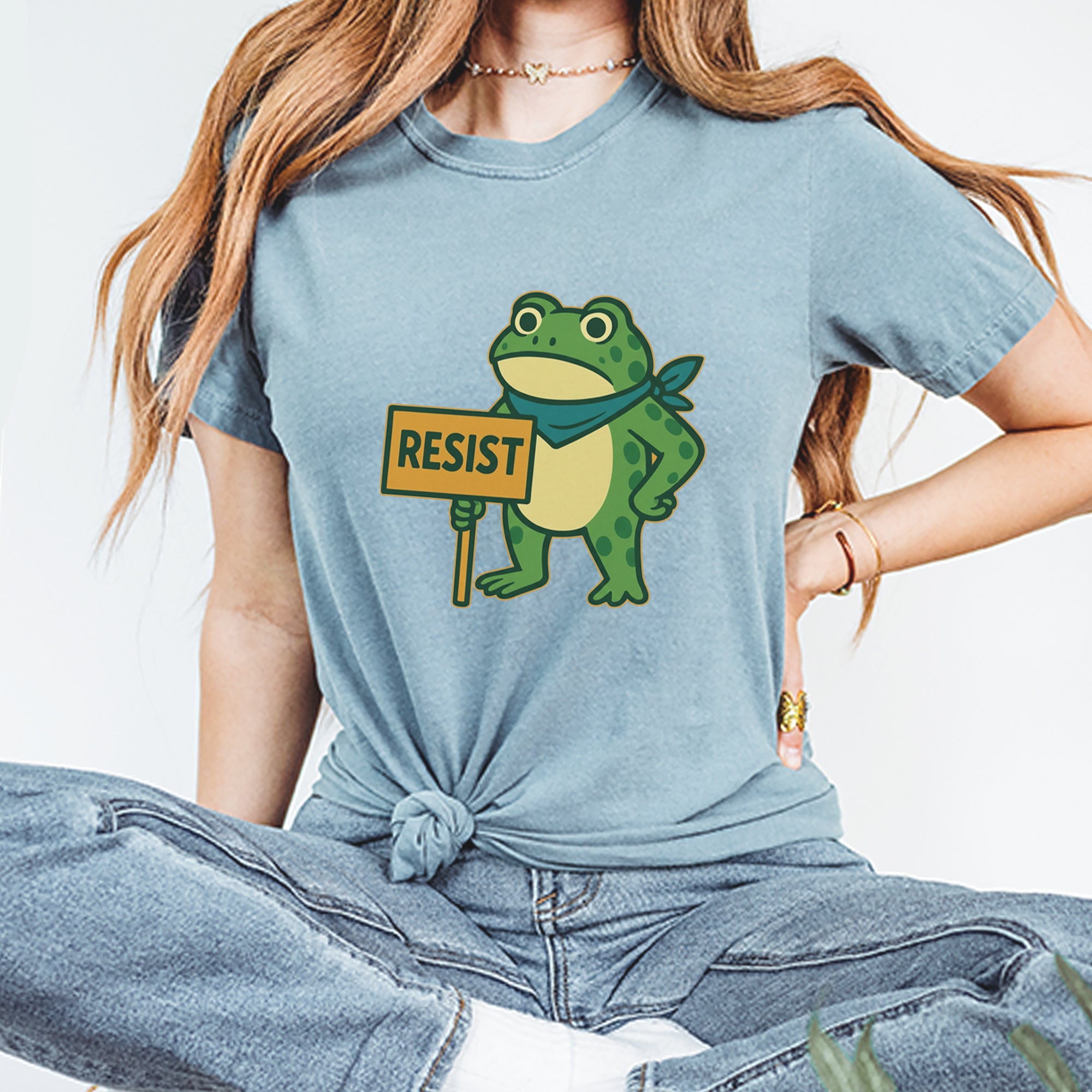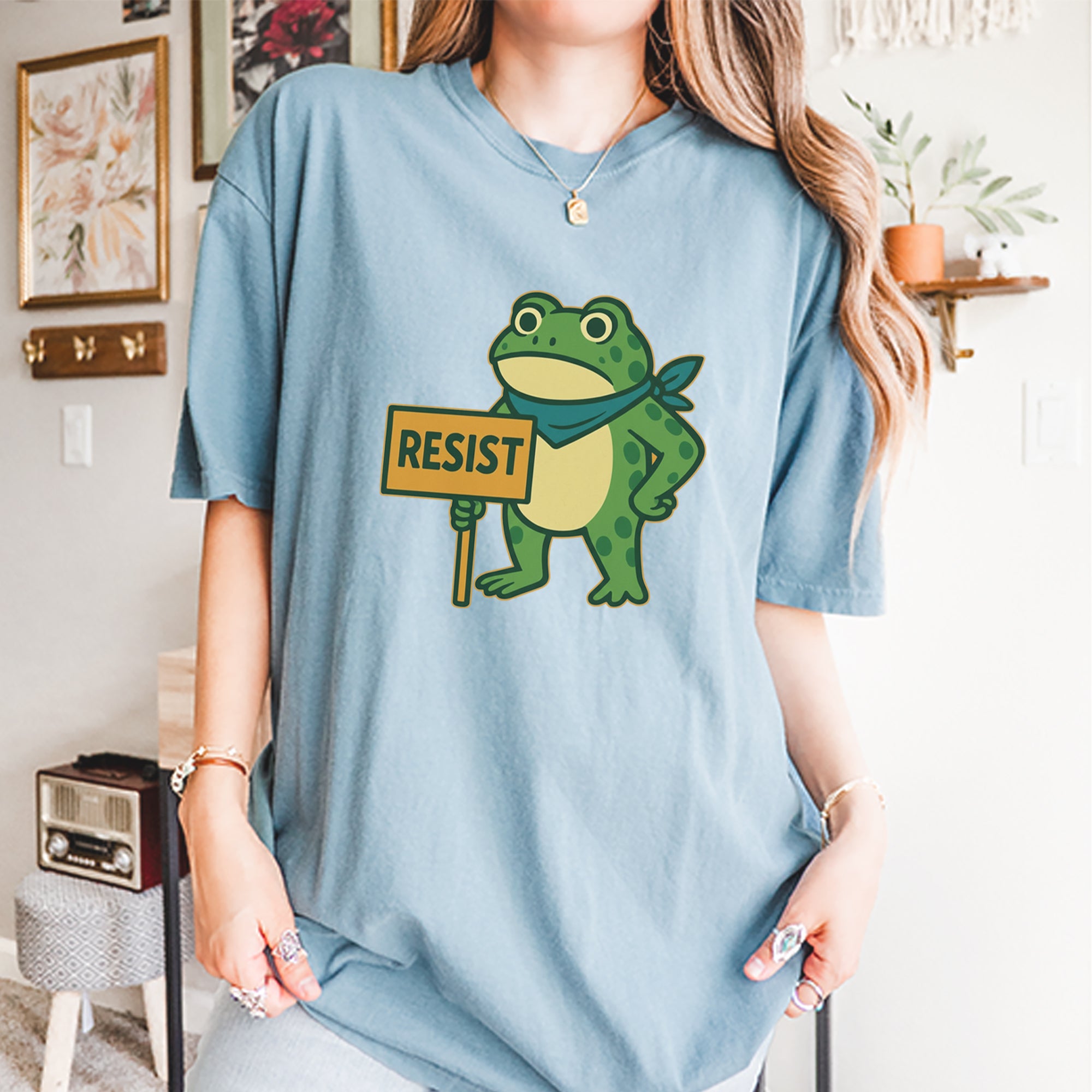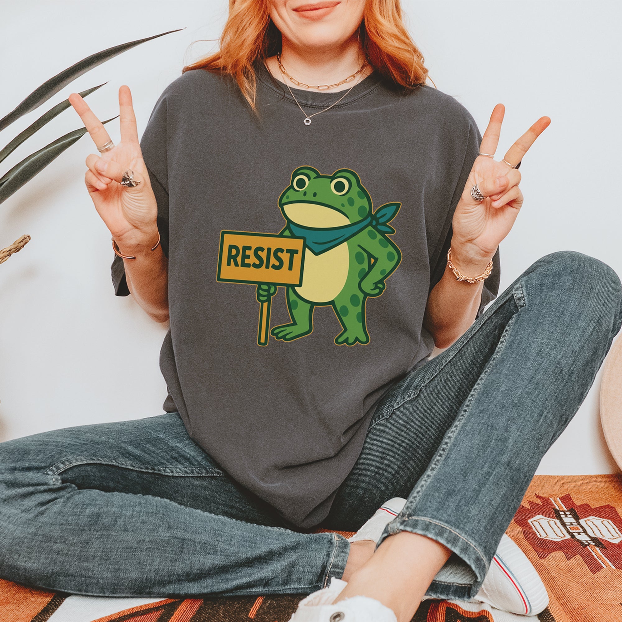 Cute but committed, this protest frog stands firm with sign in hand, bringing big energy from the streets of Portland to your wardrobe – a viral meme turned symbol of peaceful defiance.. Whether you're marching IRL or just resisting in spirit, this bold cartoon design mixes protest art with meme culture for a look that's both playful and powerful. Ribbiting Resistance..