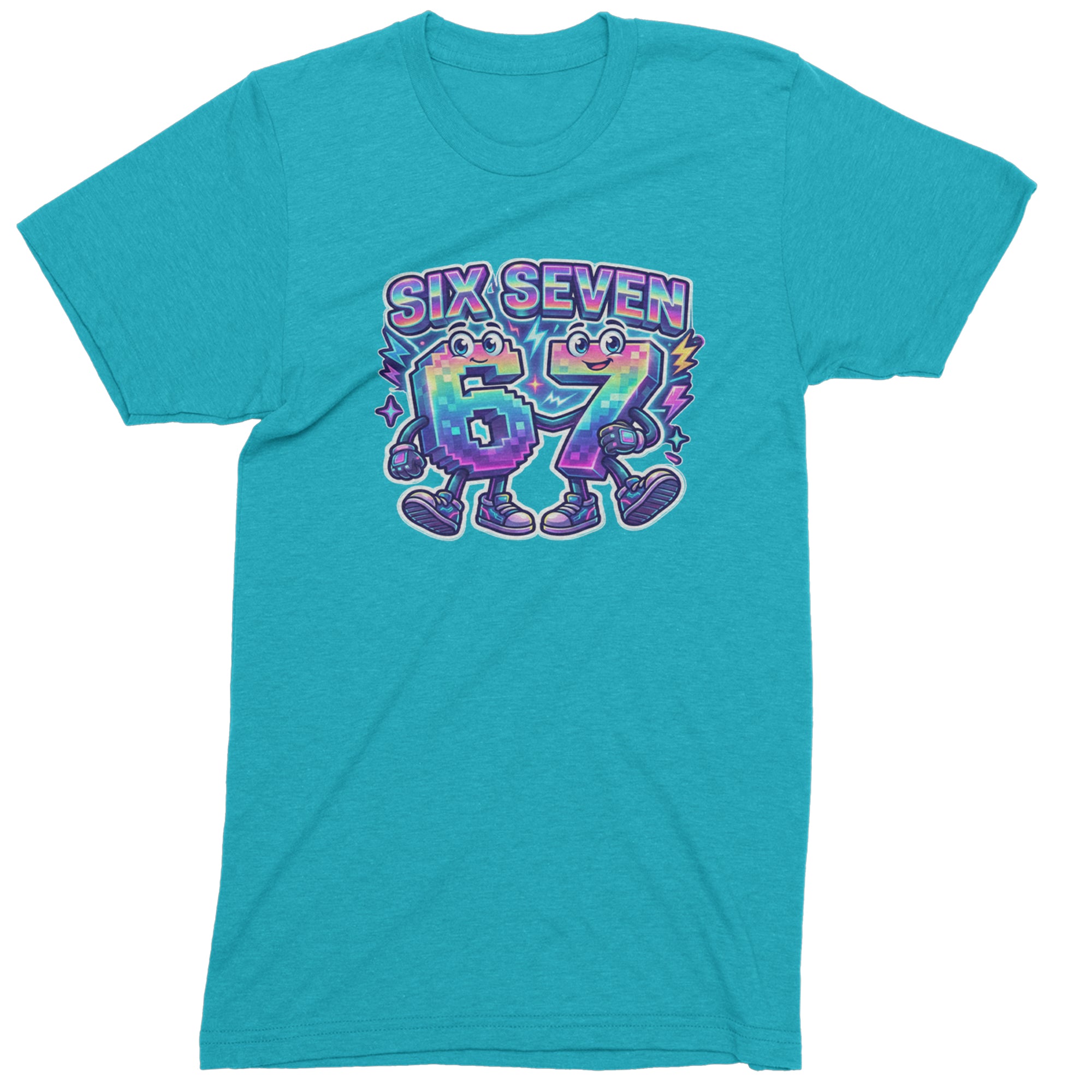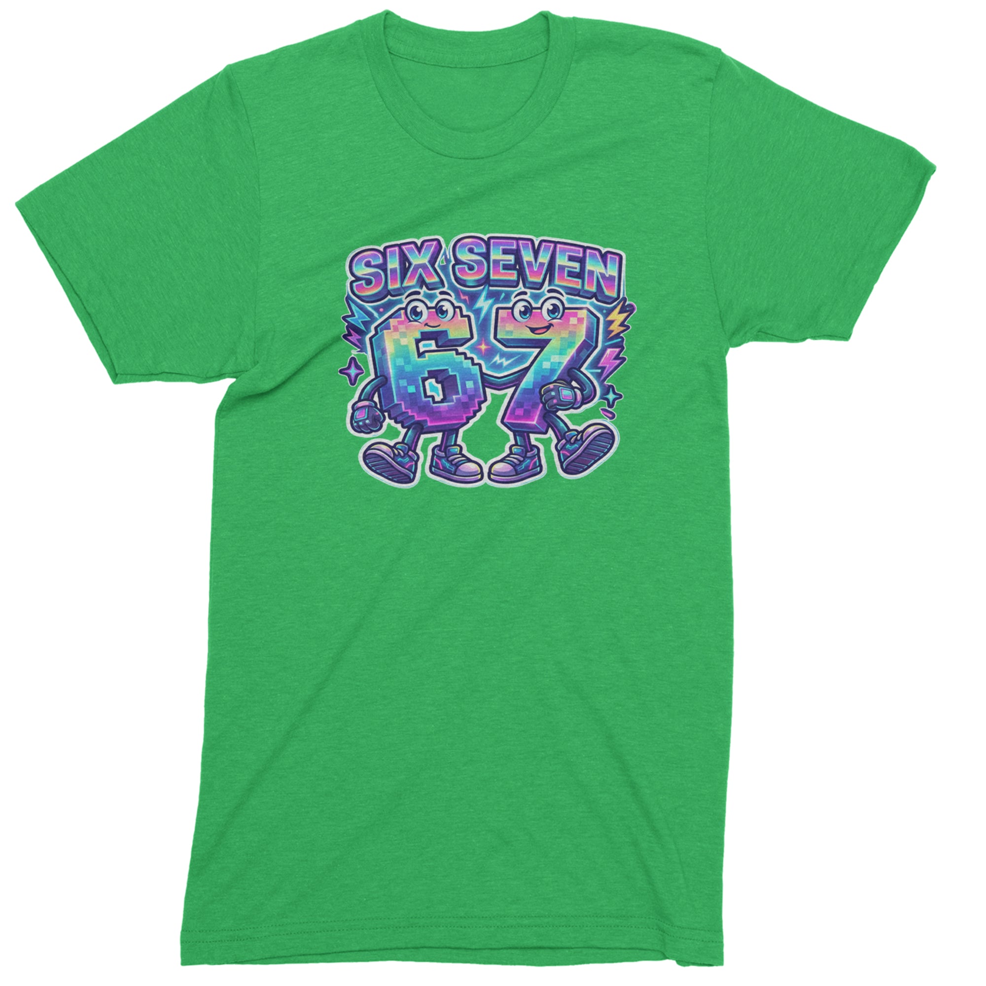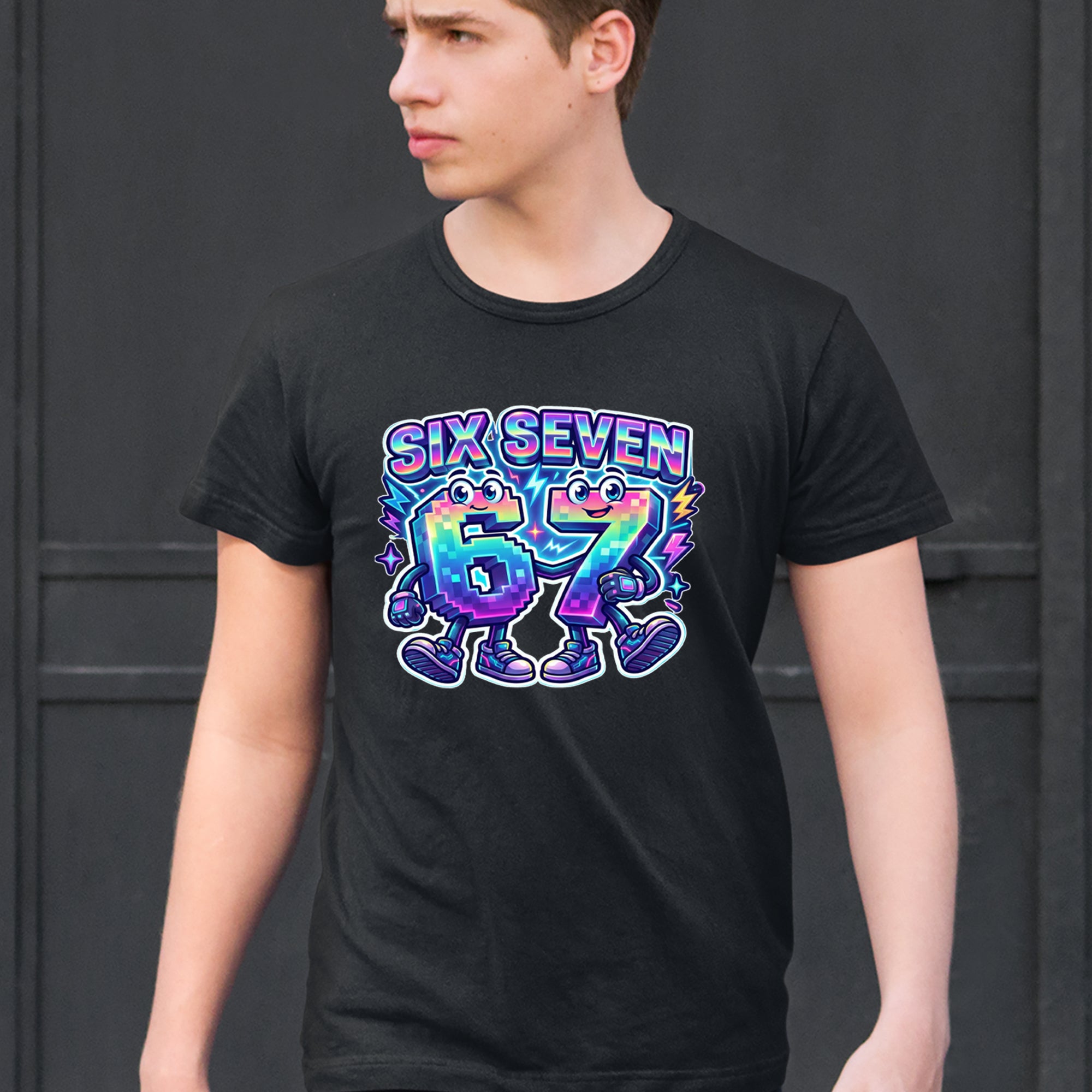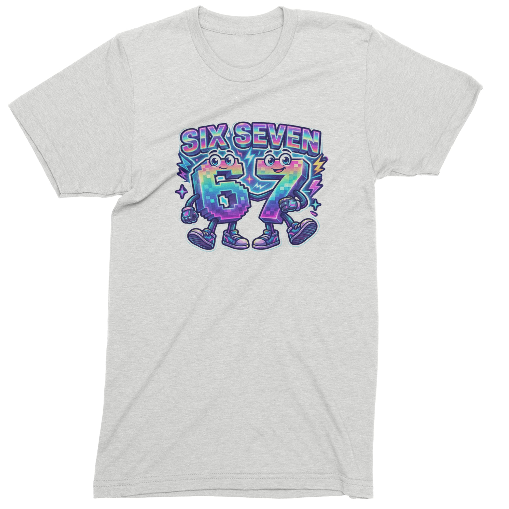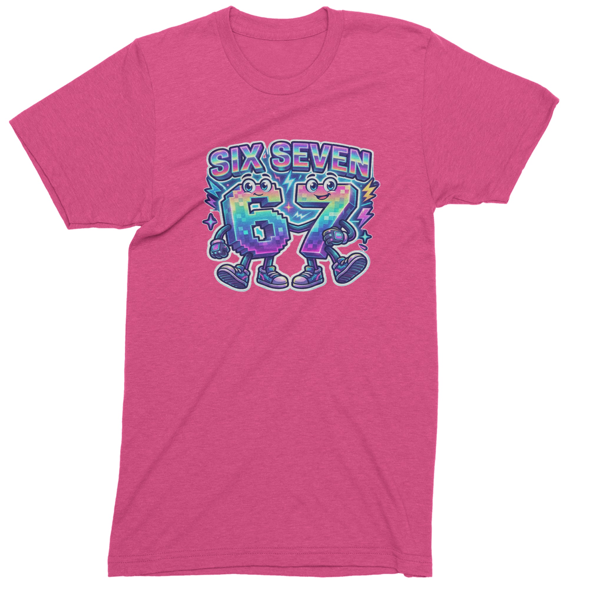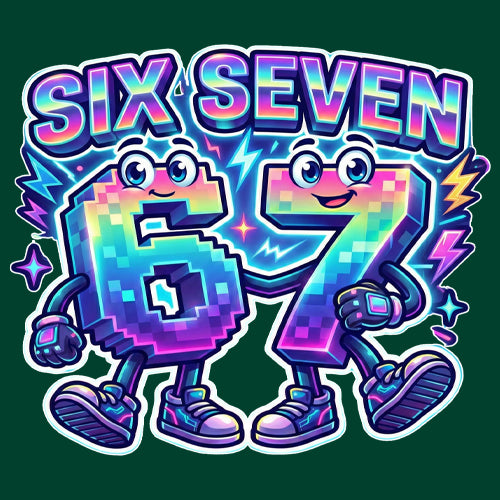 Colorful pixel 6 and 7 characters celebrate the viral Six Seven 67 meme, inspired by the TikTok brainrot number trend. Perfect for anyone who randomly blurts out six seven for no reason at all.. Fun pick for Gen Alpha kids, meme lovers, hoop fans, and creators who live on reels and shorts. Bright neon rainbow style makes this 67 meme art pop in videos, streams, and everyday fit pics..