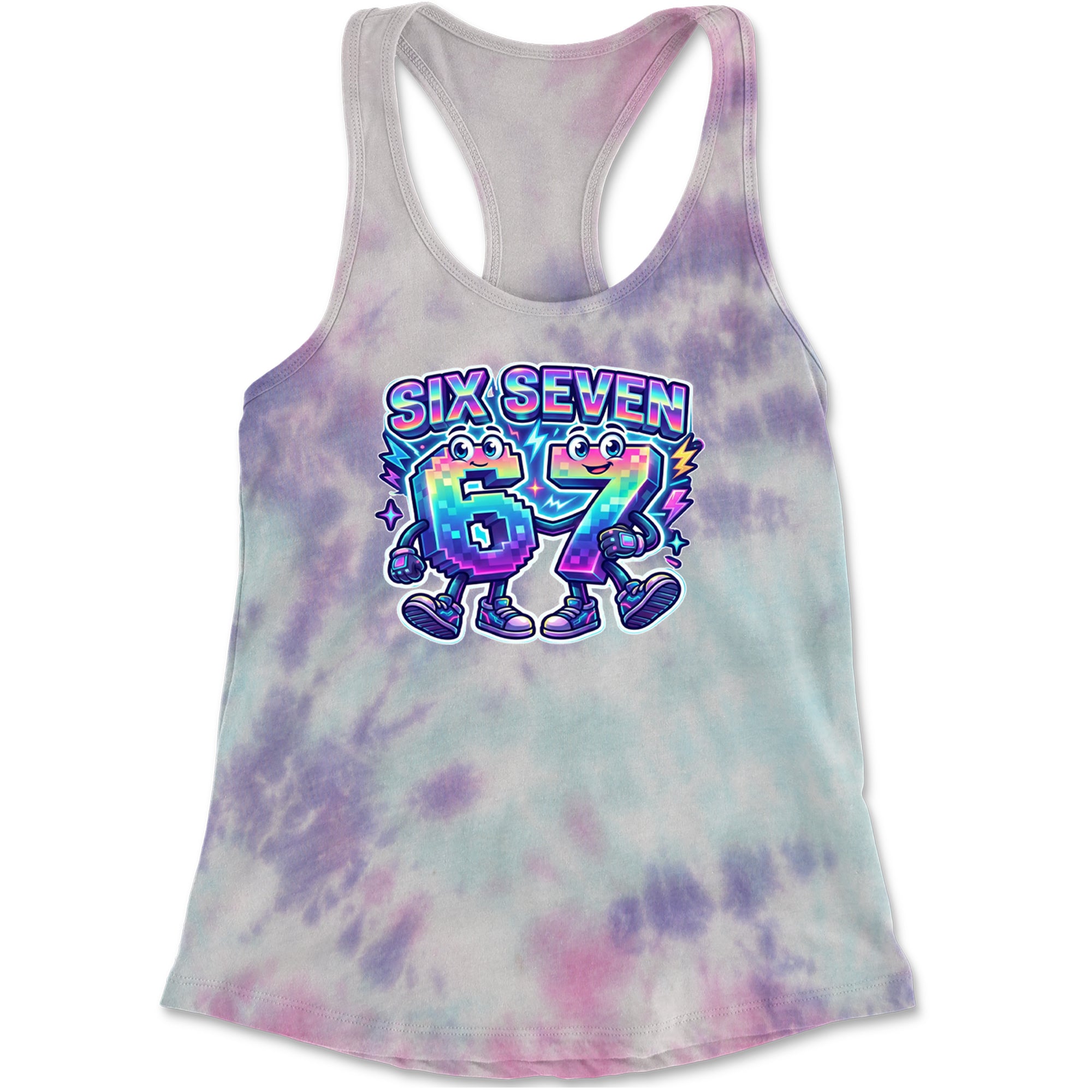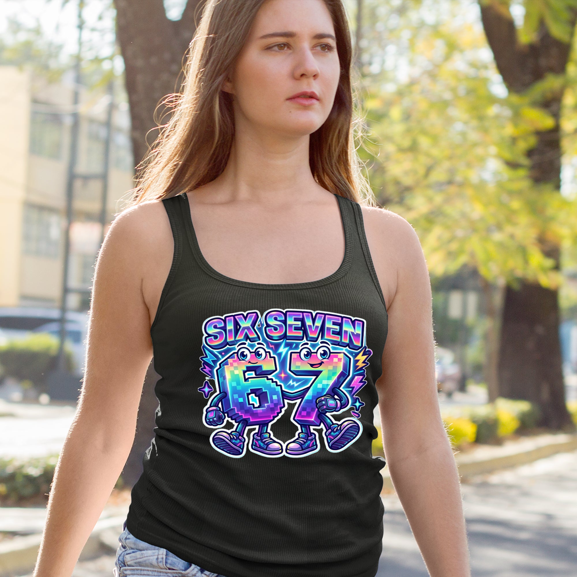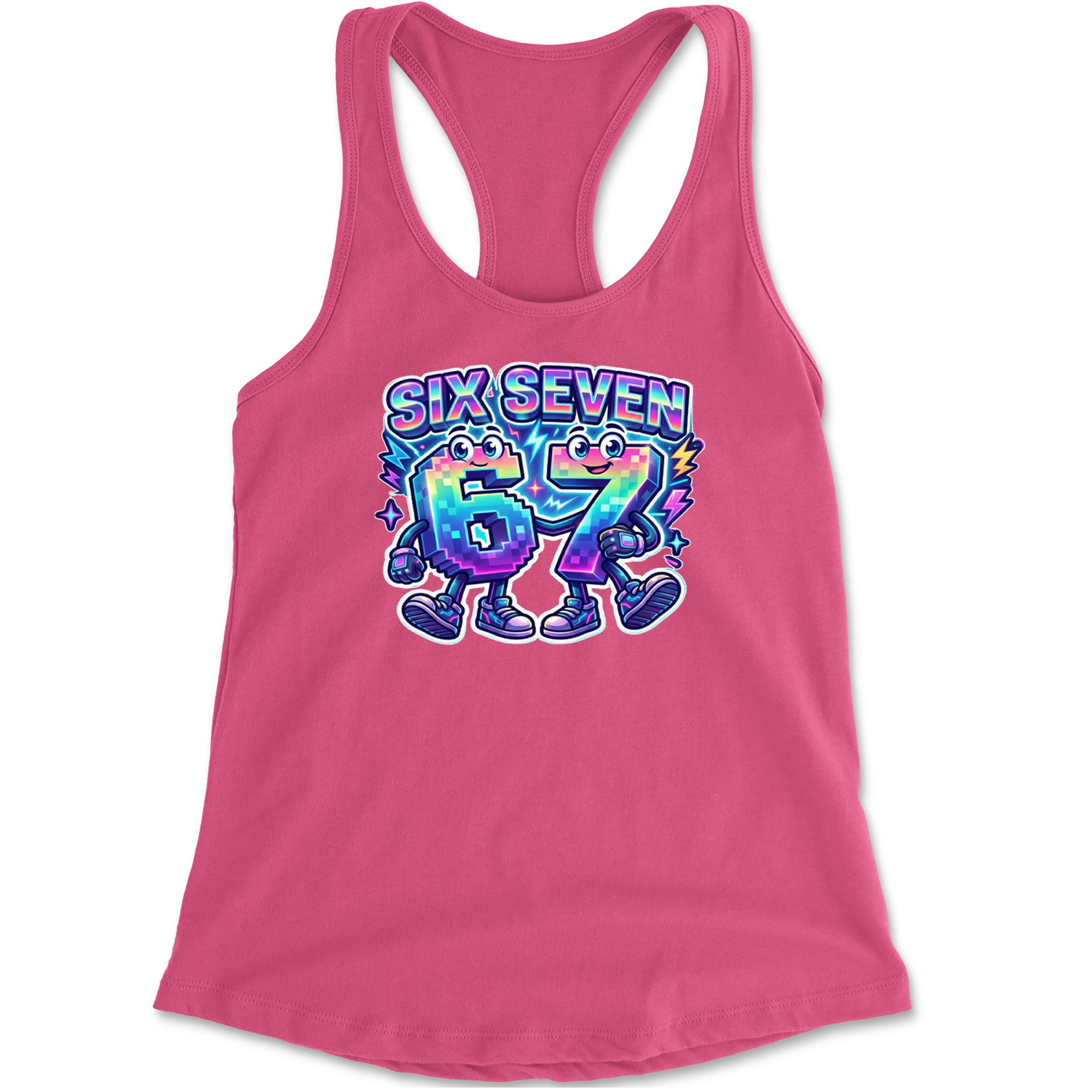Colorful pixel 6 and 7 characters celebrate the viral Six Seven 67 meme, inspired by the TikTok brainrot number trend. Perfect for anyone who randomly blurts out six seven for no reason at all. Fun pick for Gen Alpha kids, meme lovers, hoop fans, and creators who live on reels and shorts. Bright neon rainbow style makes this 67 meme art pop in videos, streams, and everyday fit pics.
