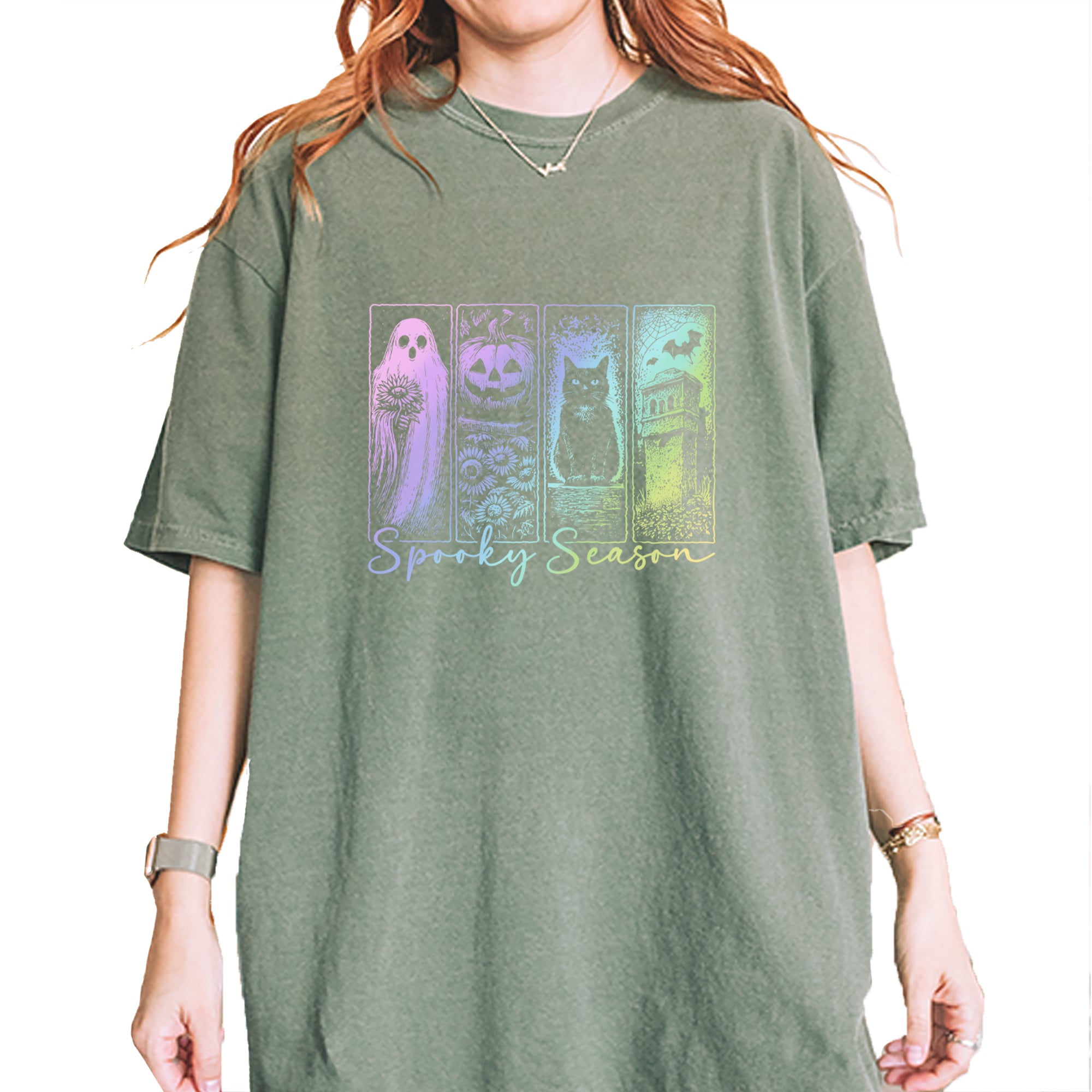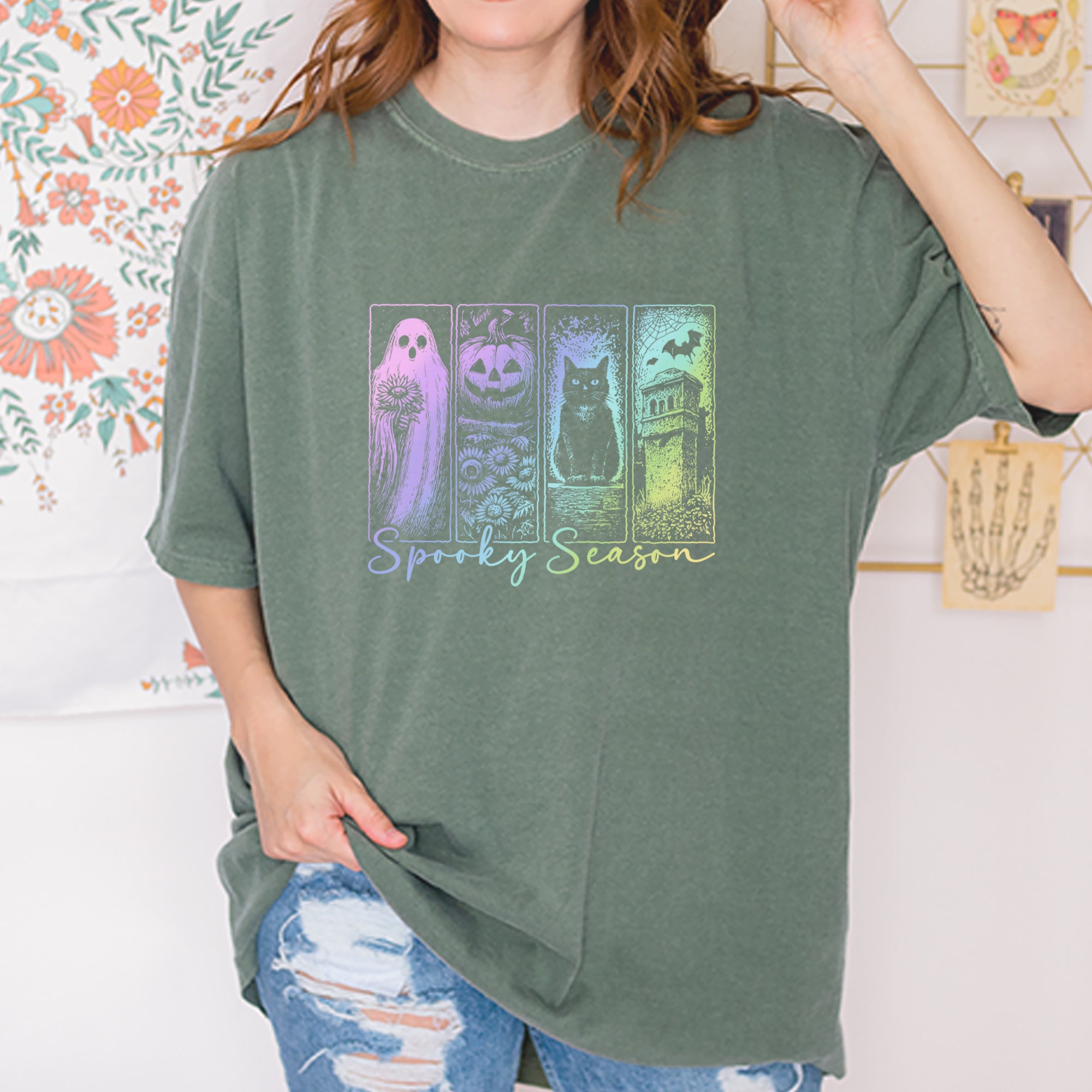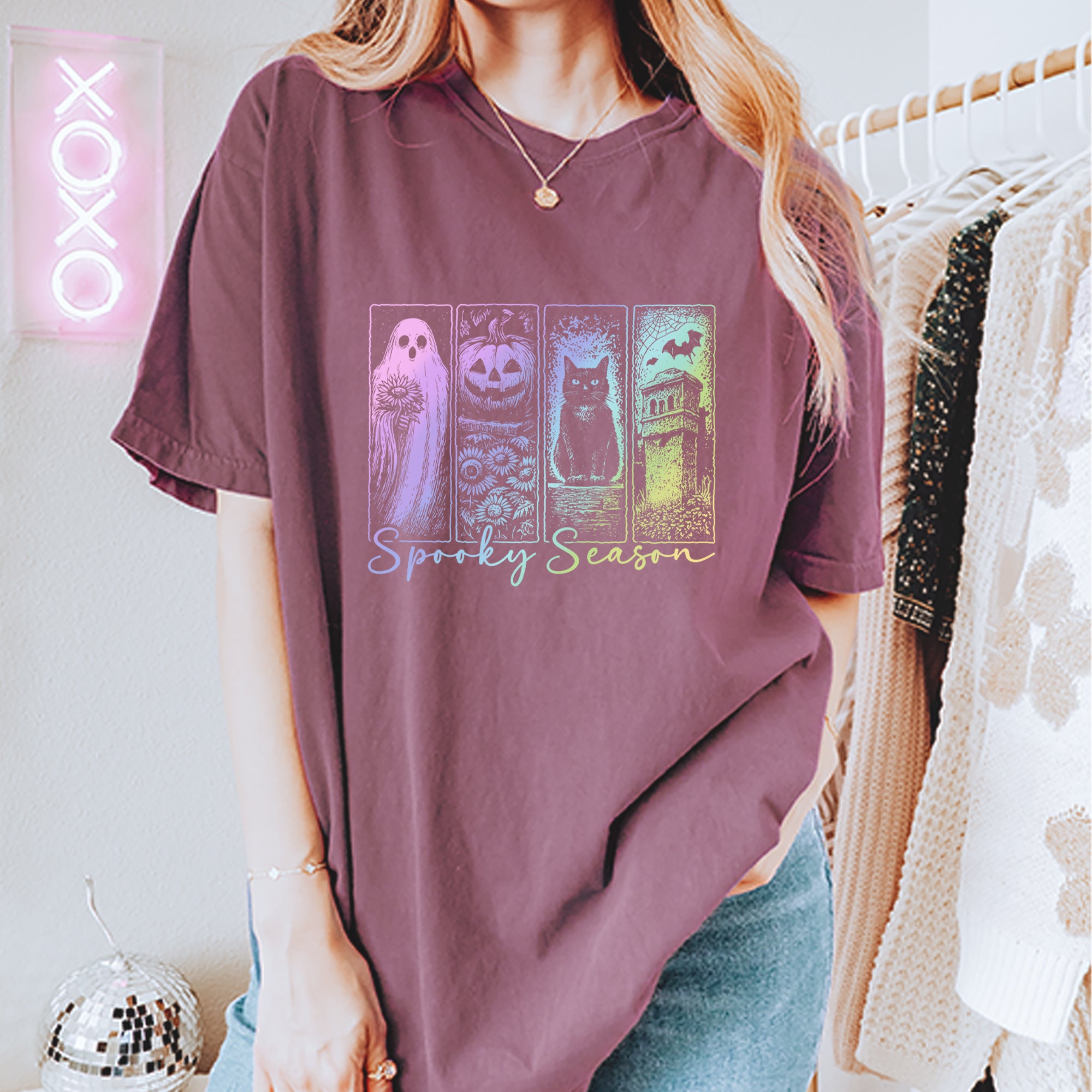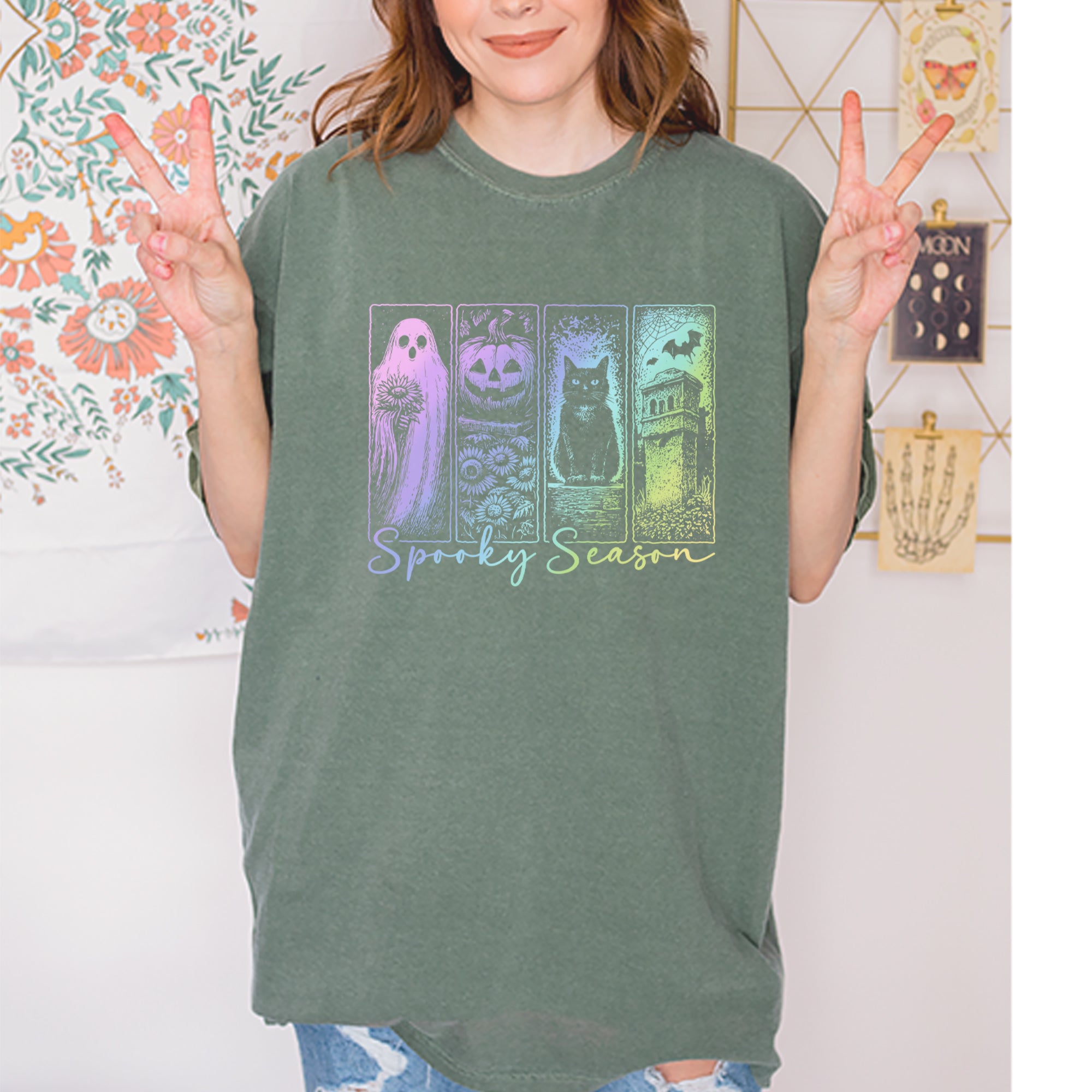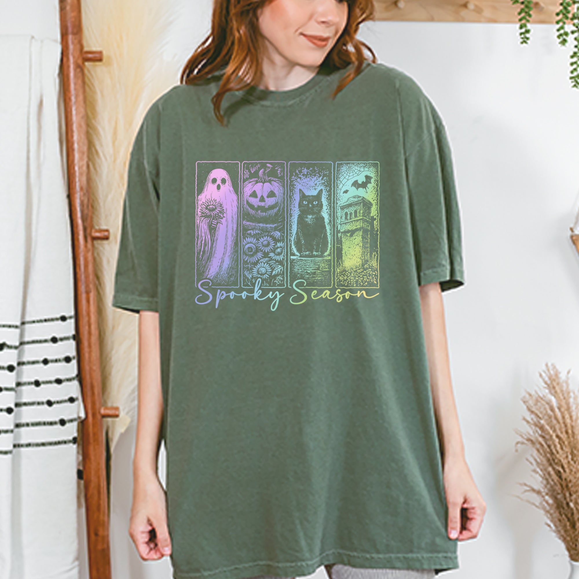 Celebrate the magic of spooky season with this colorful design featuring a sweet ghost, smiling pumpkin, mysterious black cat, and bats flying by.. A playful mix of creepy and cute, perfect for fall lovers who enjoy cozy Halloween vibes with a touch of witchy charm..