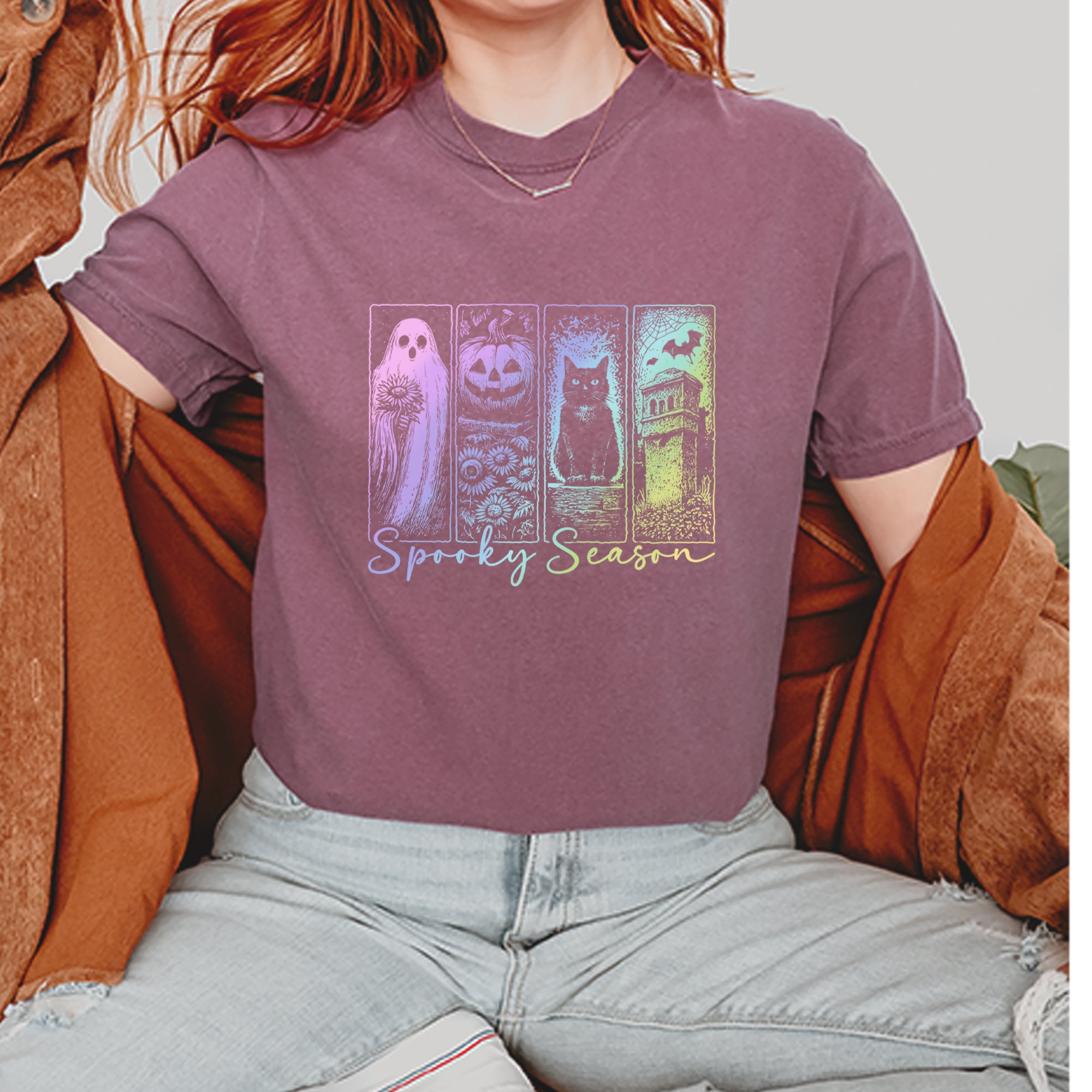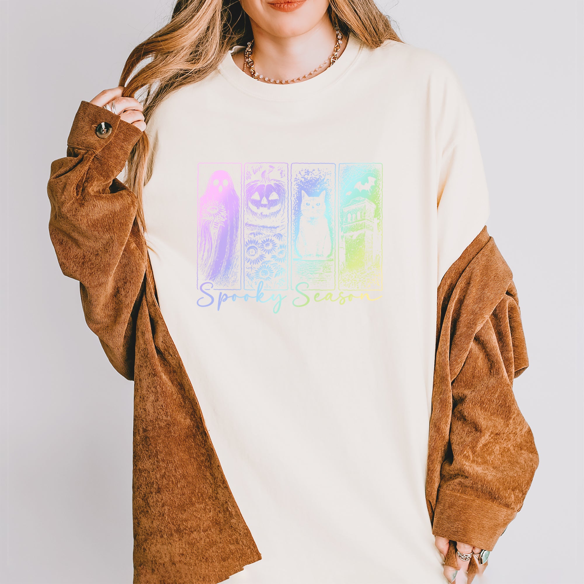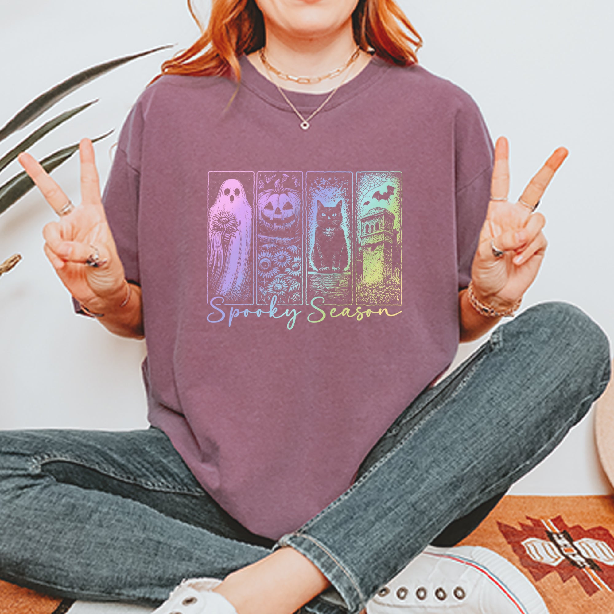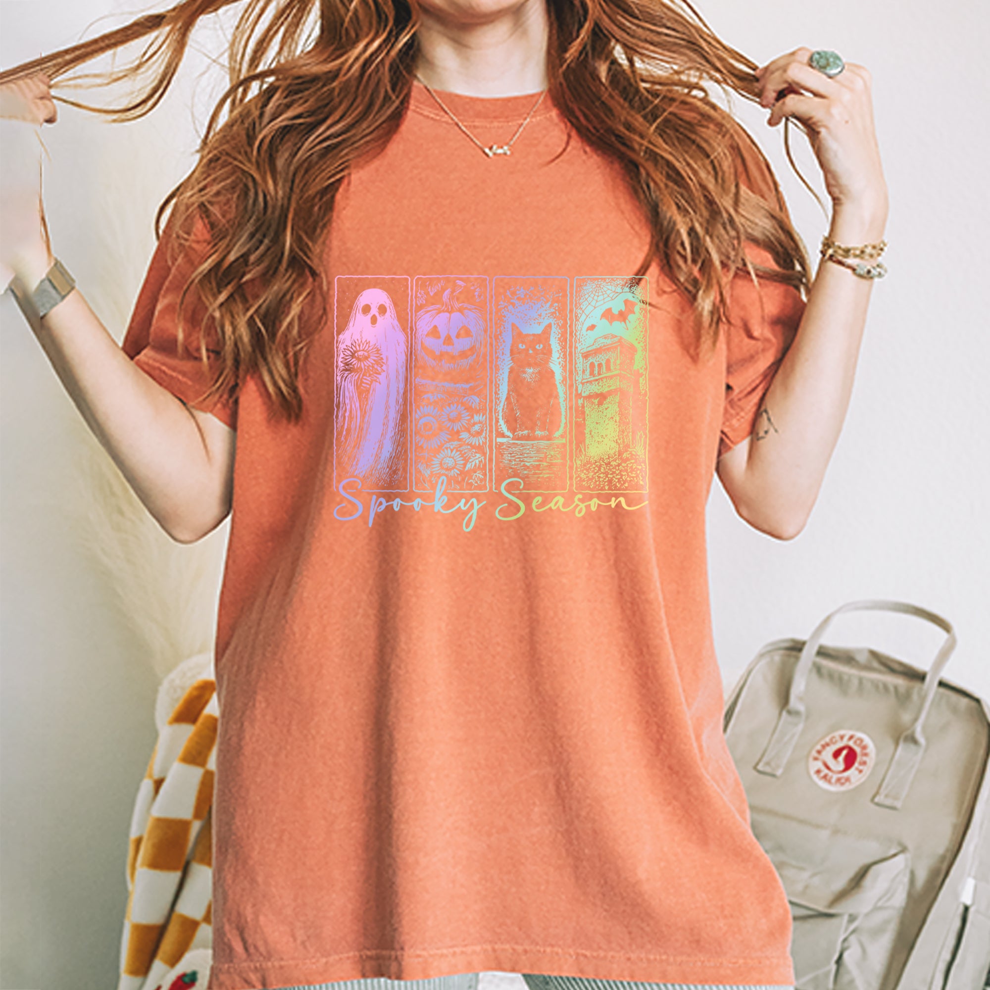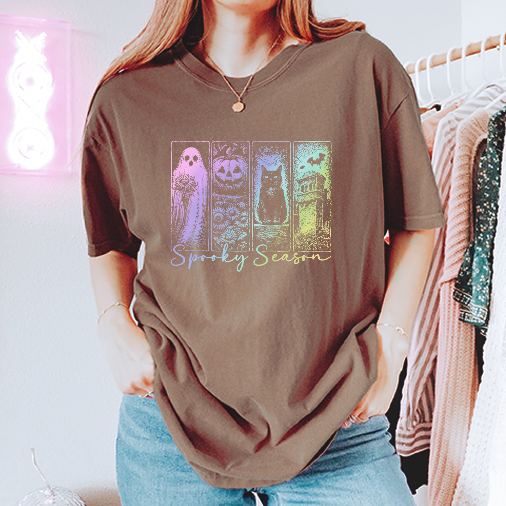 Celebrate the magic of spooky season with this colorful design featuring a sweet ghost, smiling pumpkin, mysterious black cat, and bats flying by.. A playful mix of creepy and cute, perfect for fall lovers who enjoy cozy Halloween vibes with a touch of witchy charm..