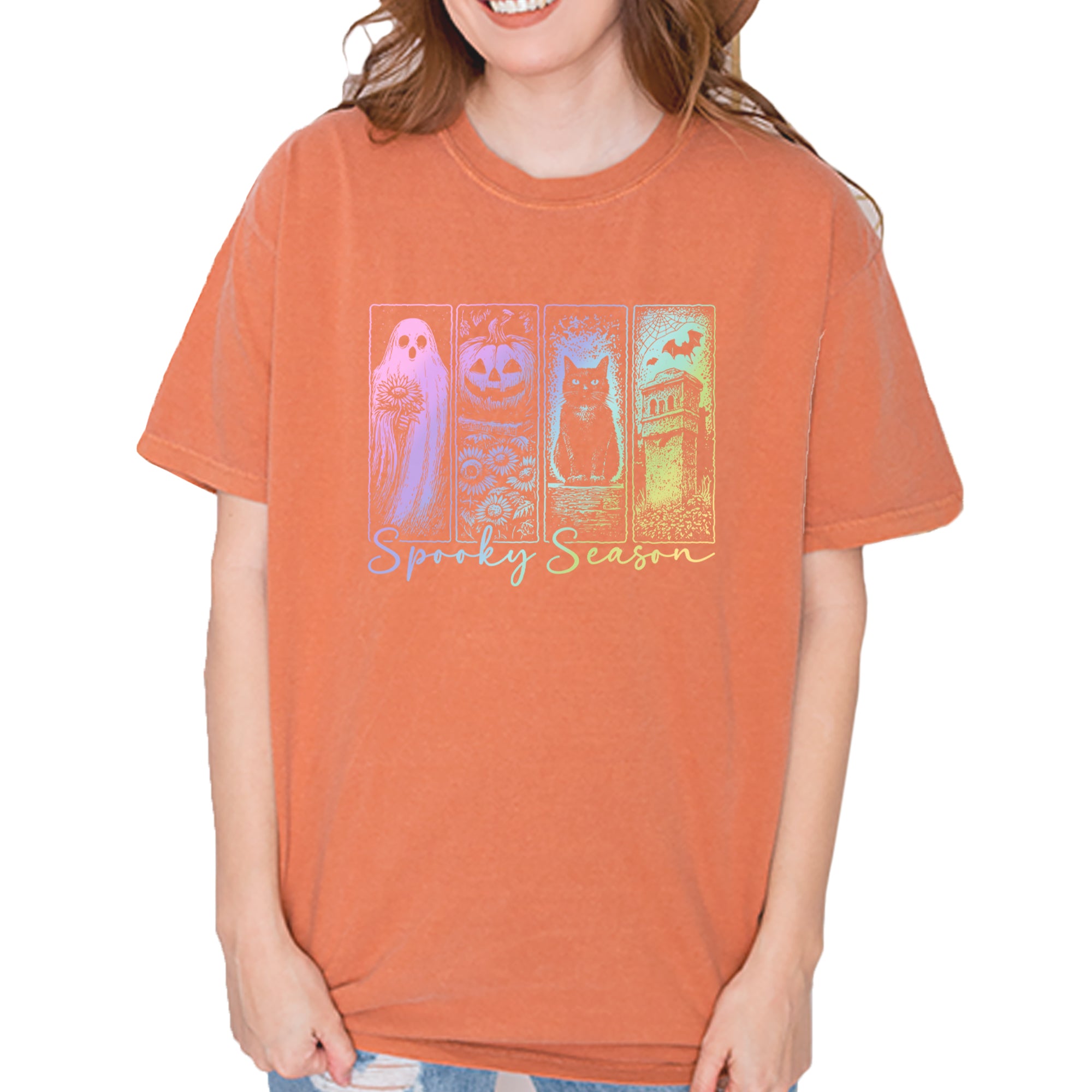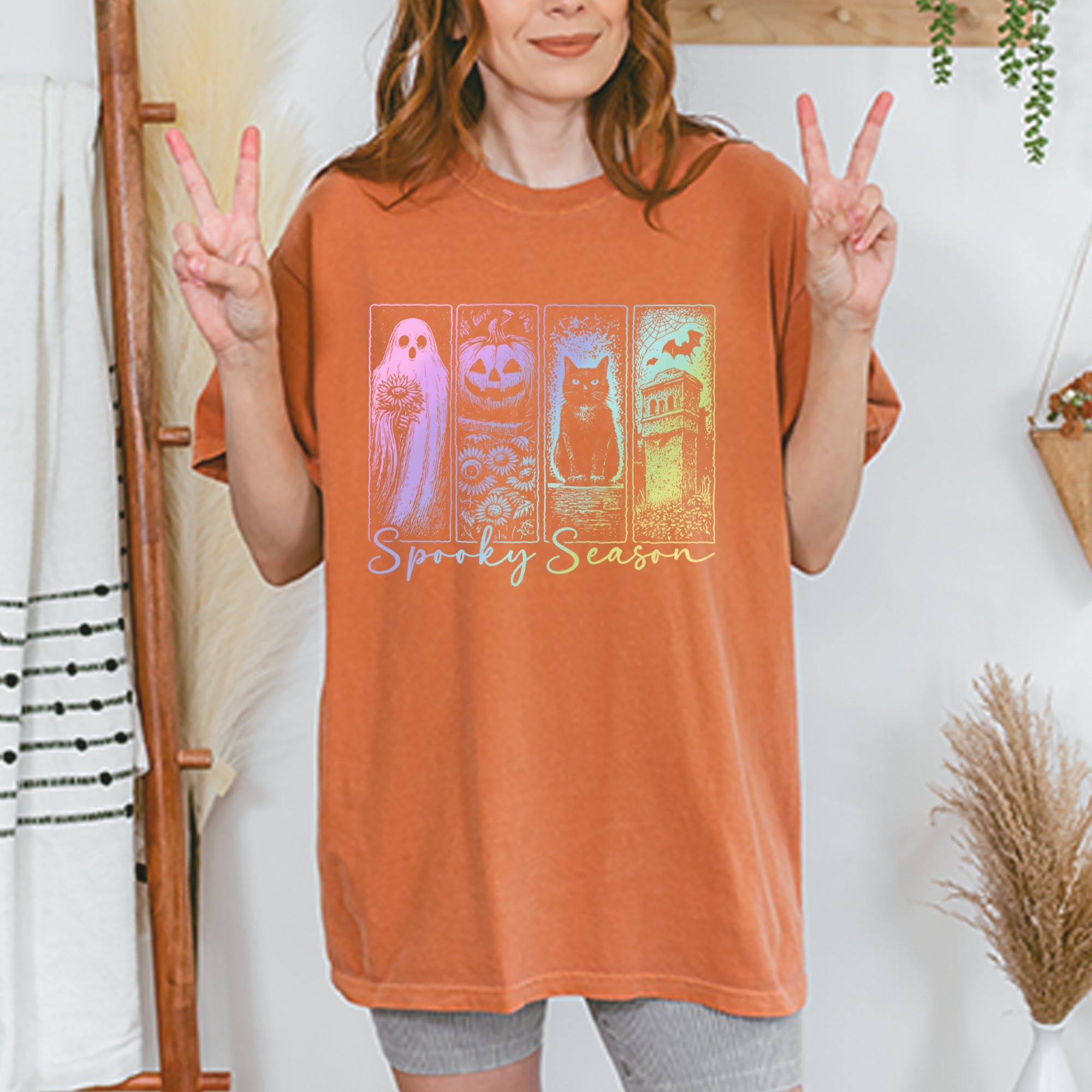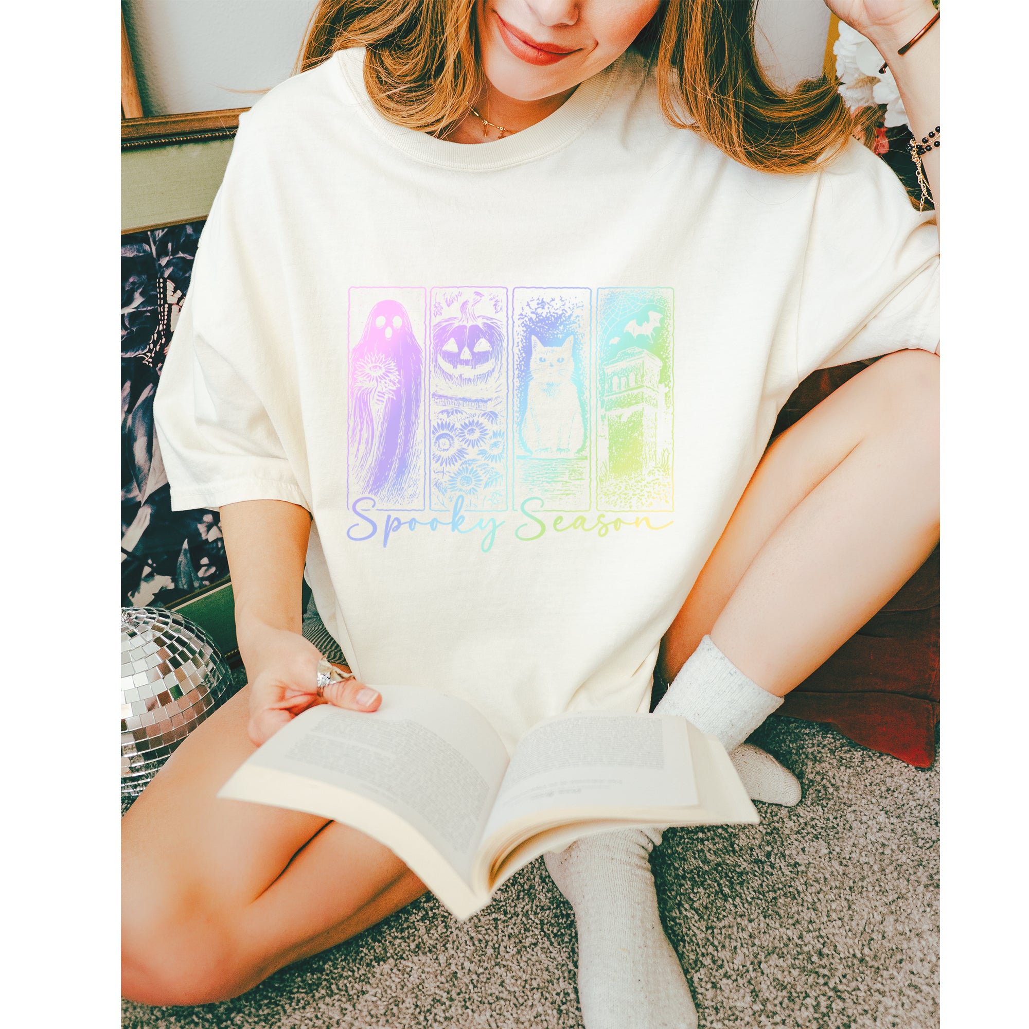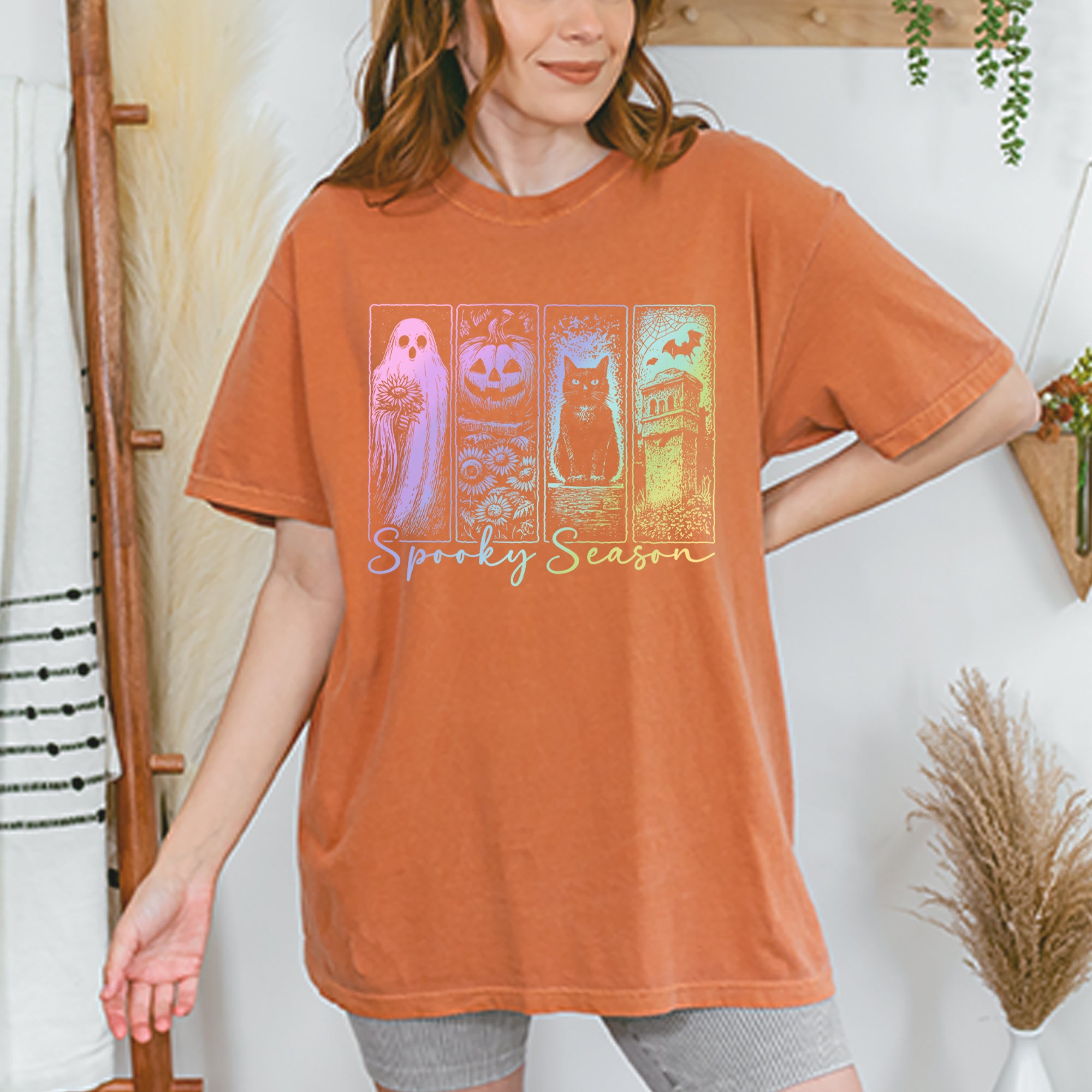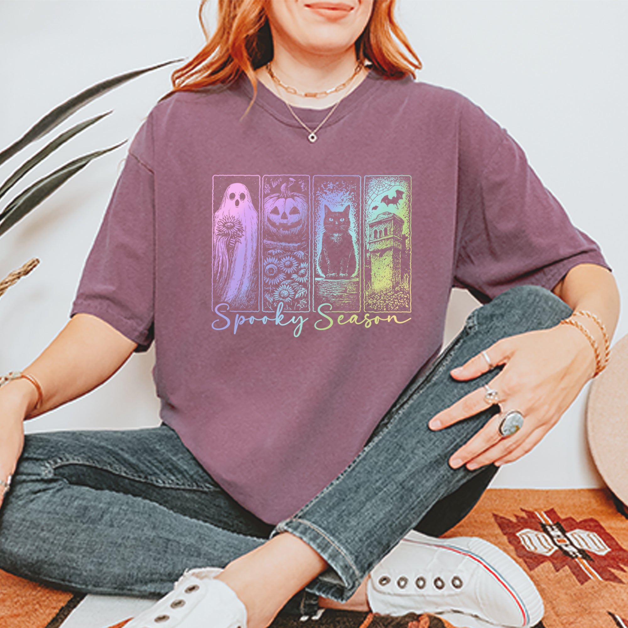 Celebrate the magic of spooky season with this colorful design featuring a sweet ghost, smiling pumpkin, mysterious black cat, and bats flying by.. A playful mix of creepy and cute, perfect for fall lovers who enjoy cozy Halloween vibes with a touch of witchy charm..