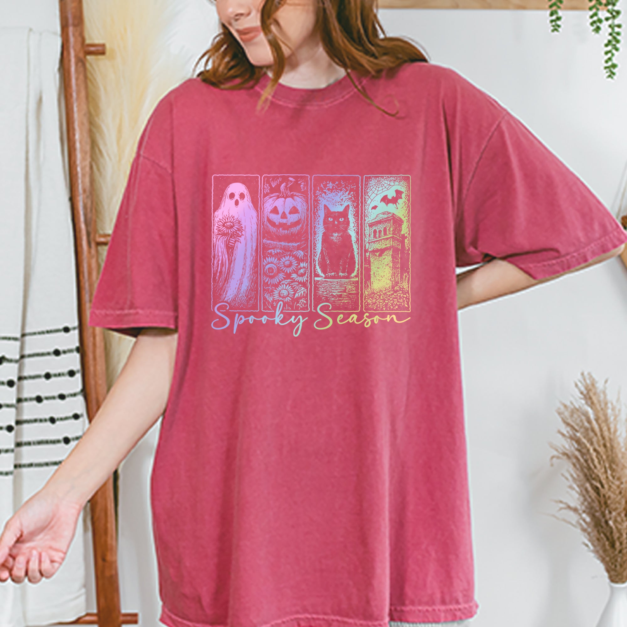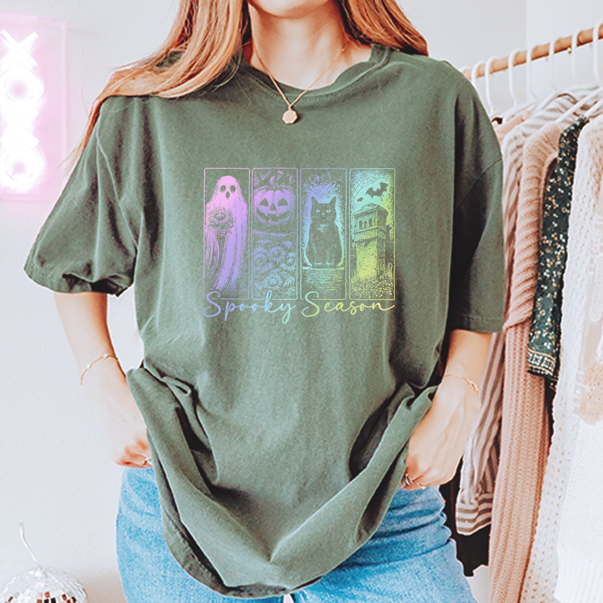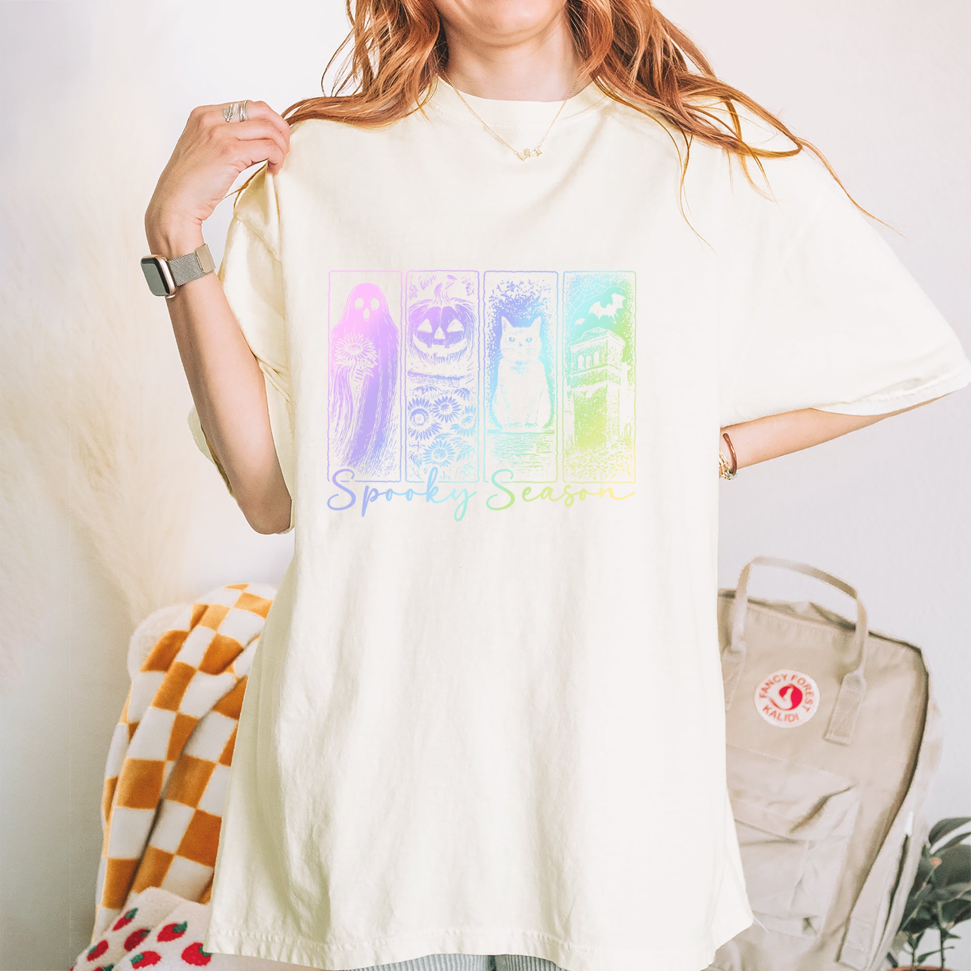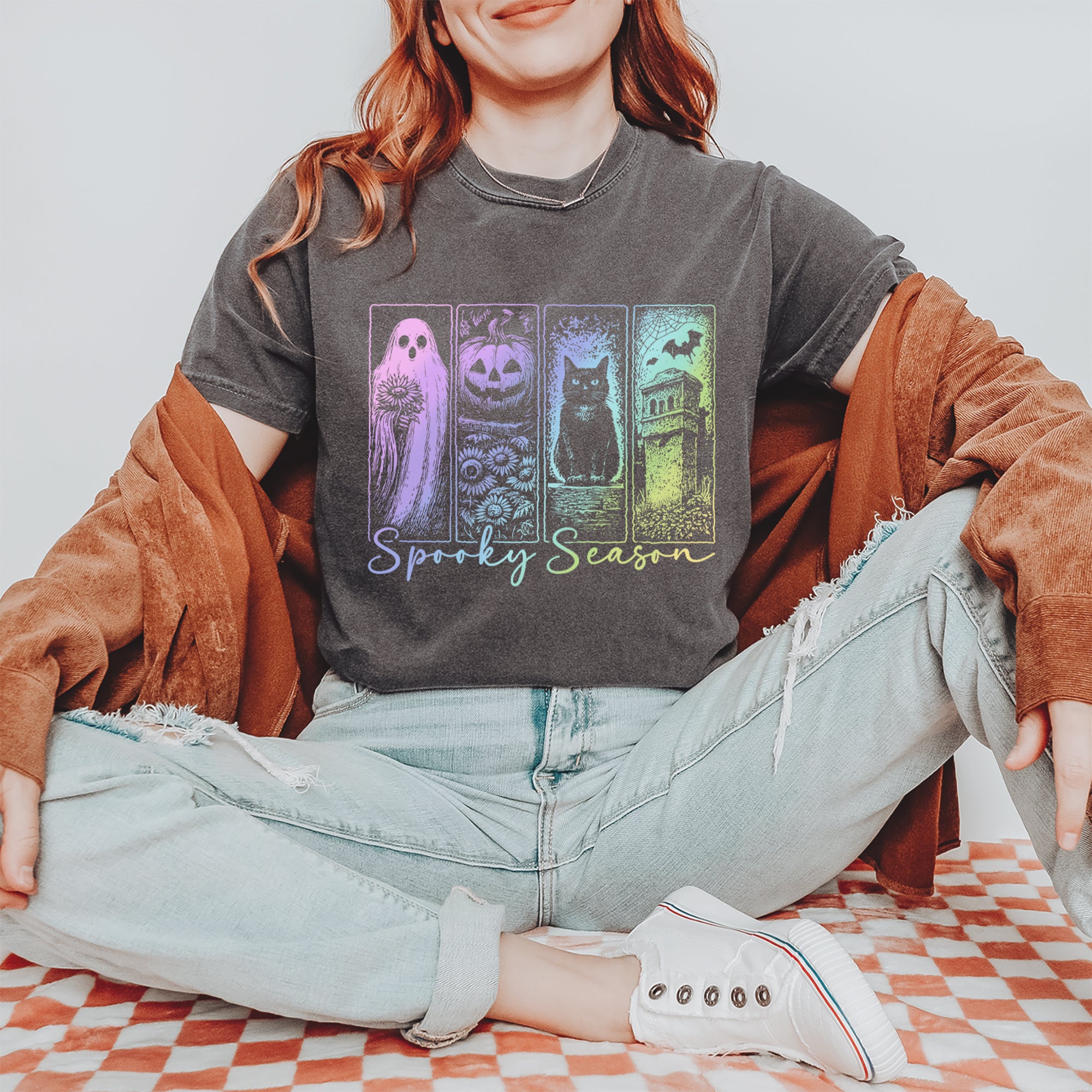 Celebrate the magic of spooky season with this colorful design featuring a sweet ghost, smiling pumpkin, mysterious black cat, and bats flying by.. A playful mix of creepy and cute, perfect for fall lovers who enjoy cozy Halloween vibes with a touch of witchy charm..