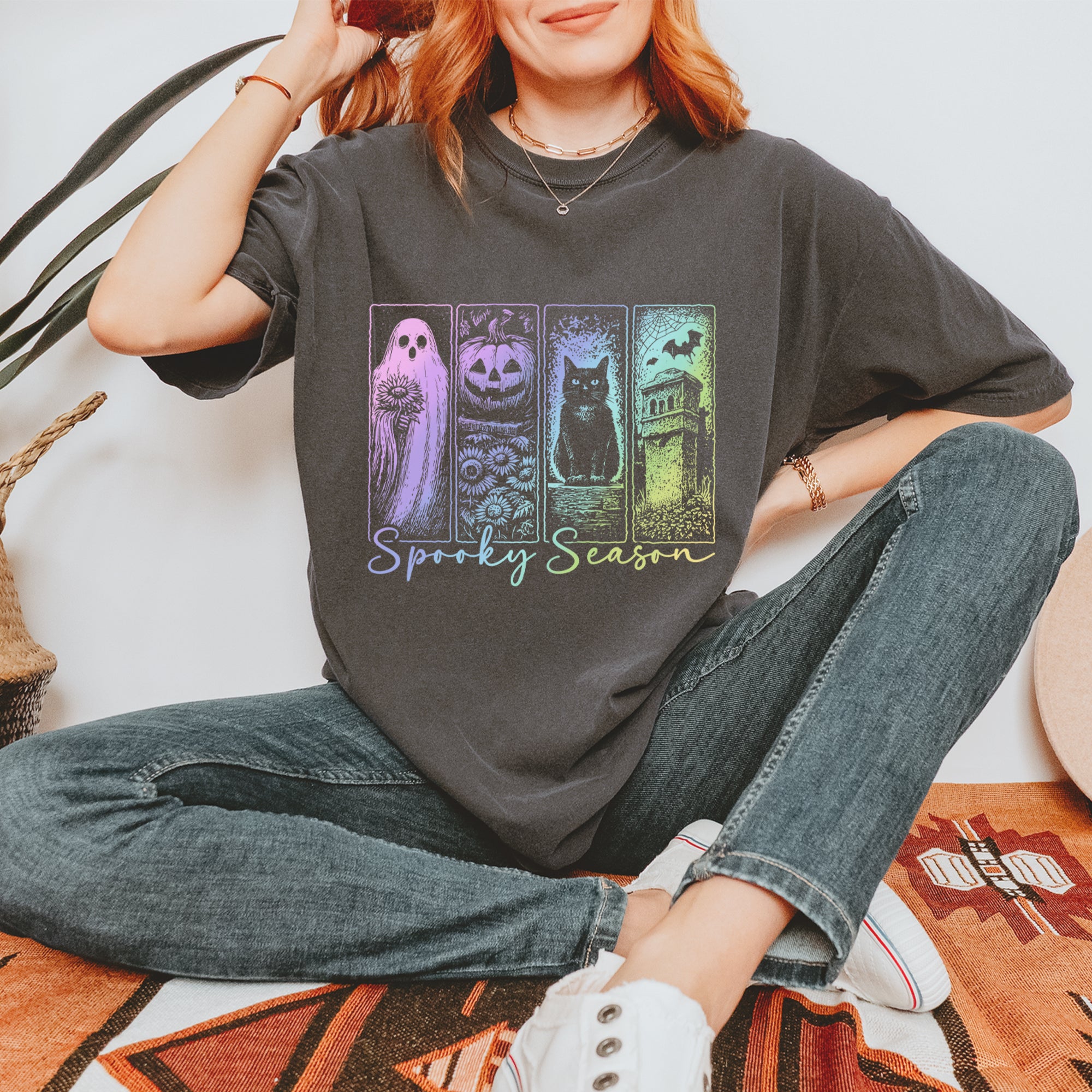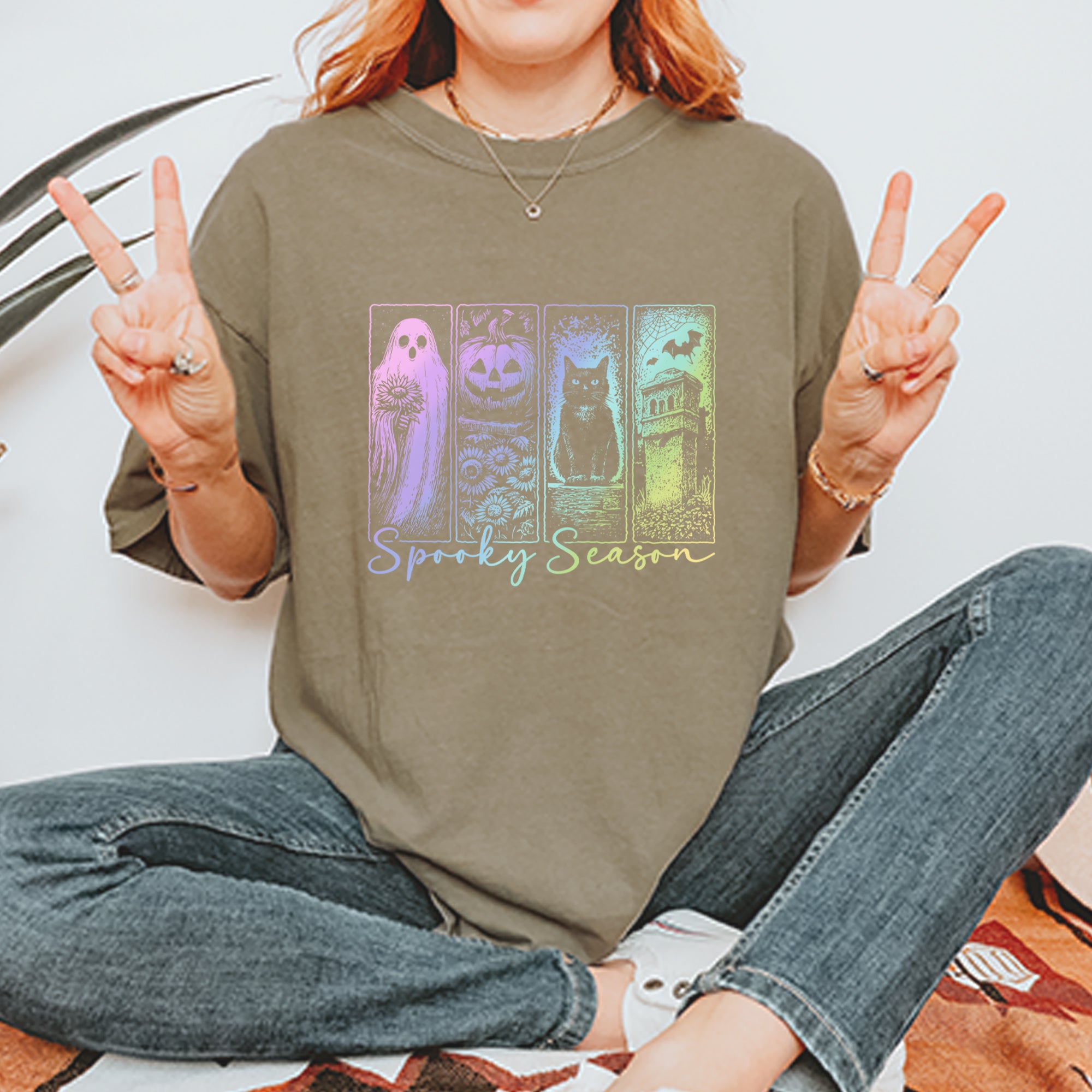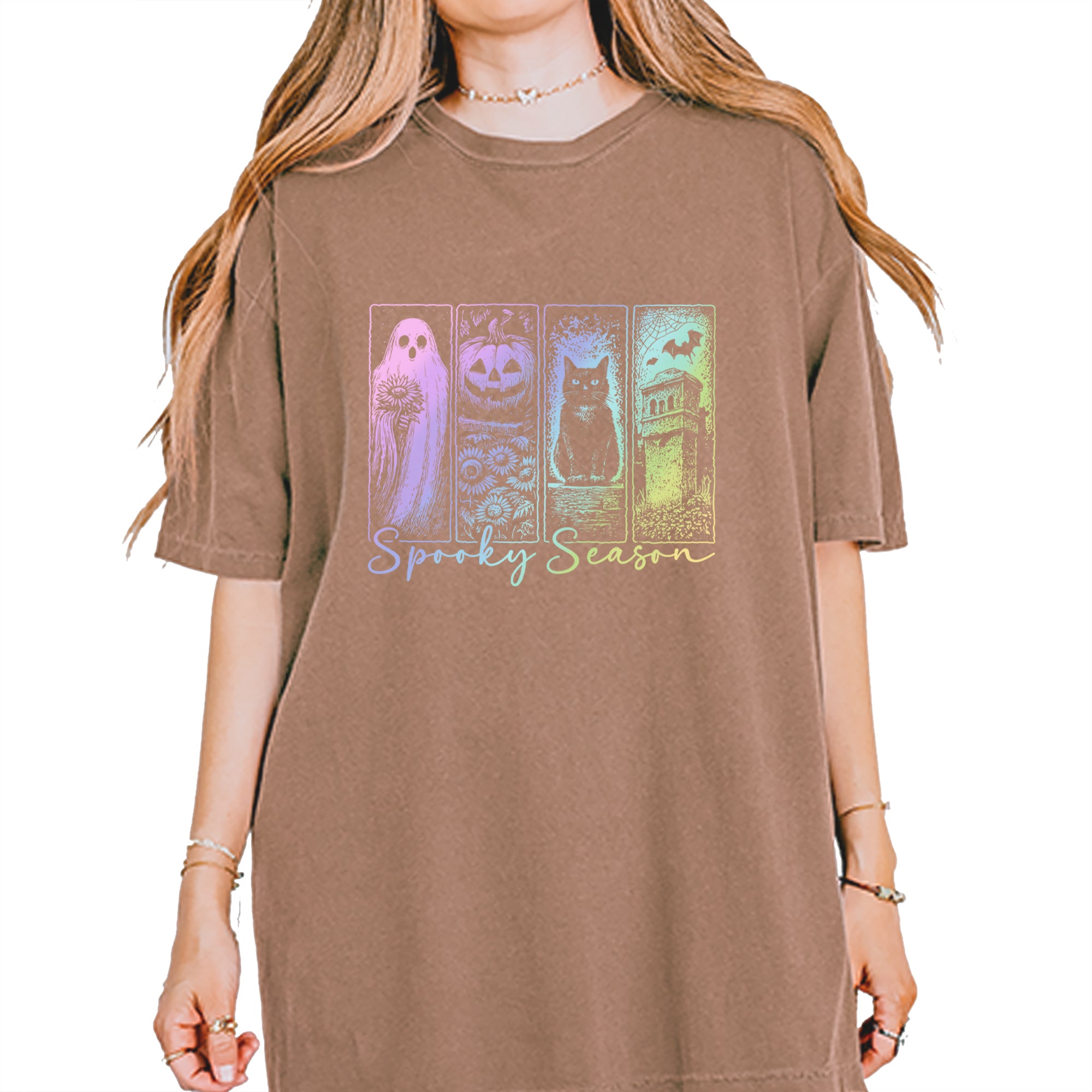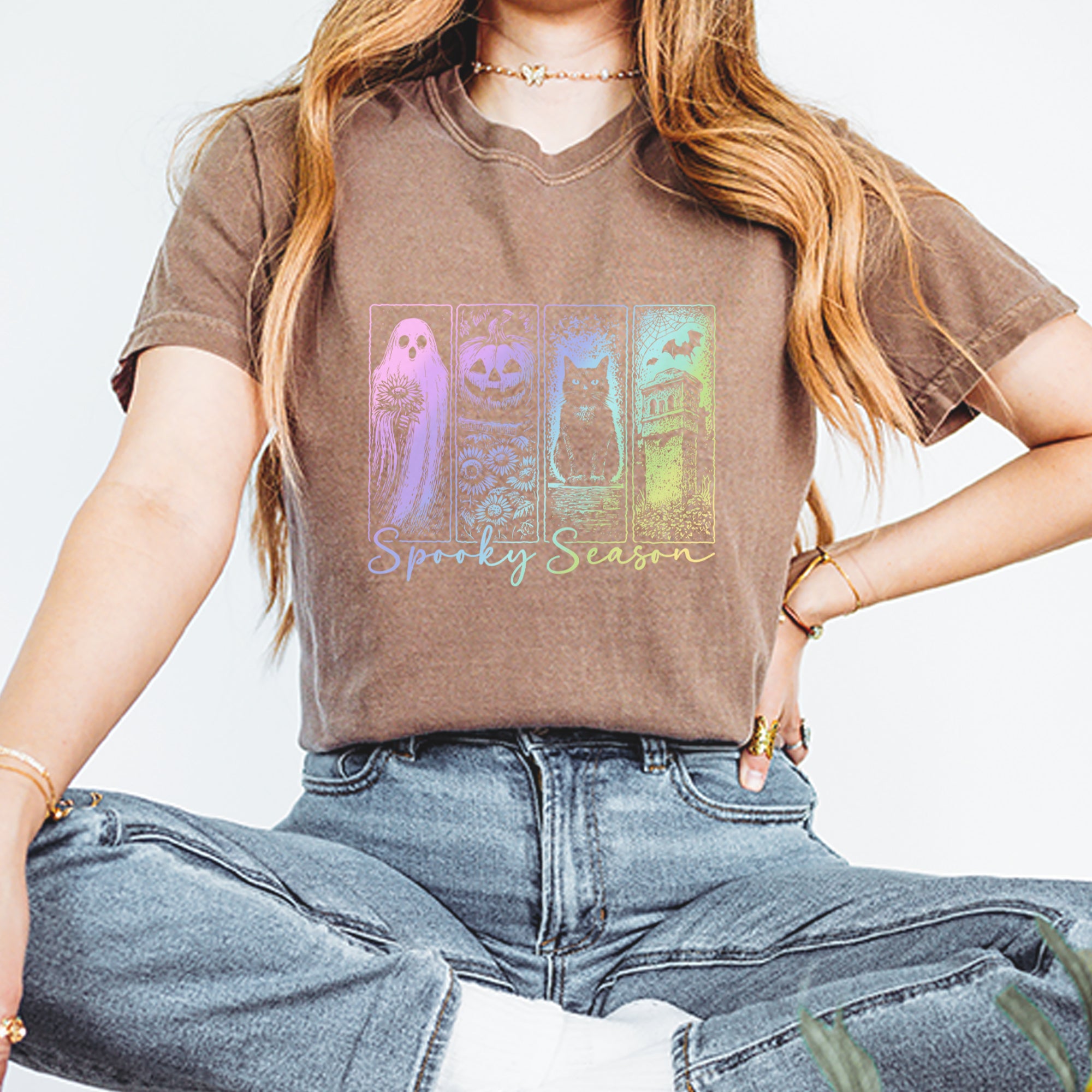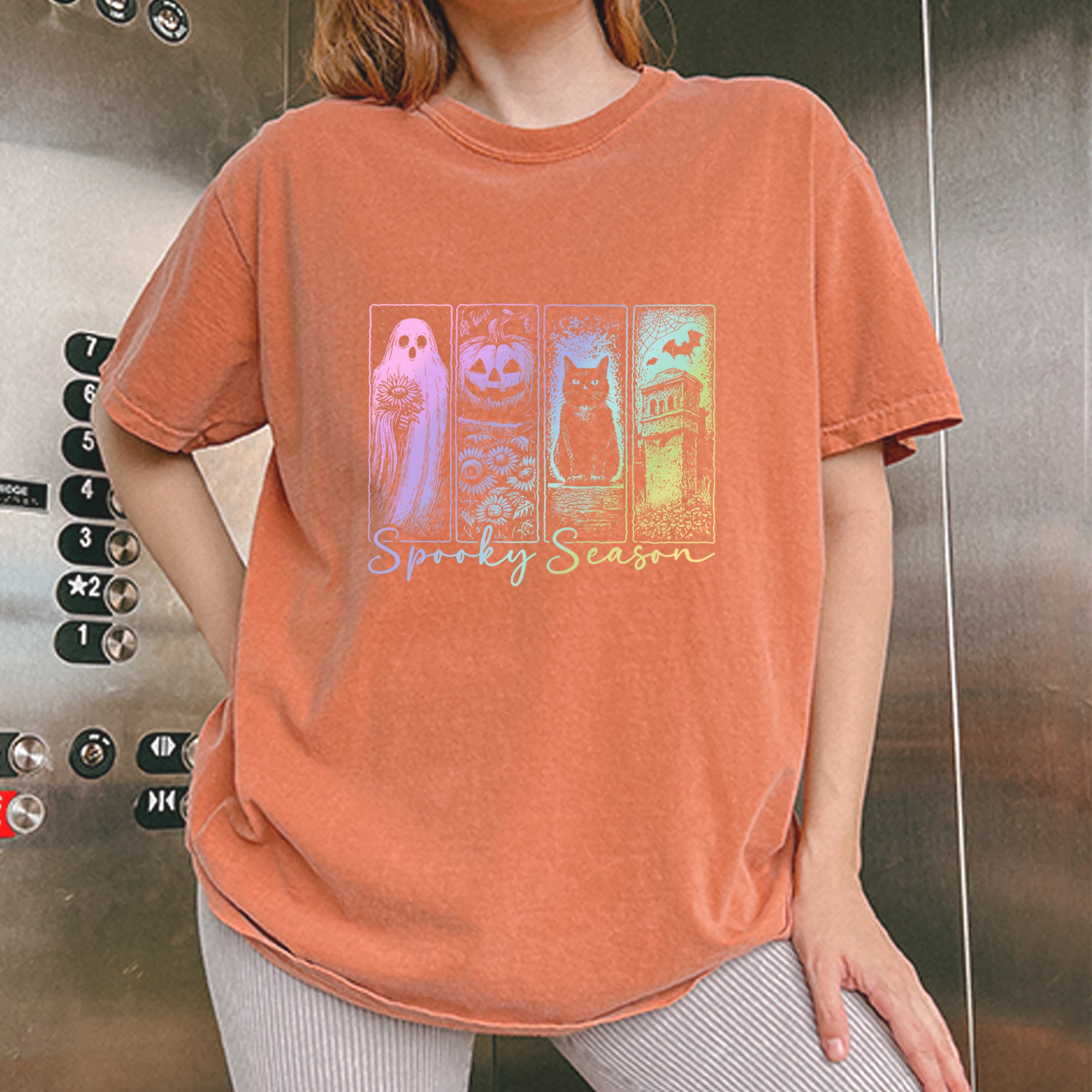 Celebrate the magic of spooky season with this colorful design featuring a sweet ghost, smiling pumpkin, mysterious black cat, and bats flying by.. A playful mix of creepy and cute, perfect for fall lovers who enjoy cozy Halloween vibes with a touch of witchy charm..