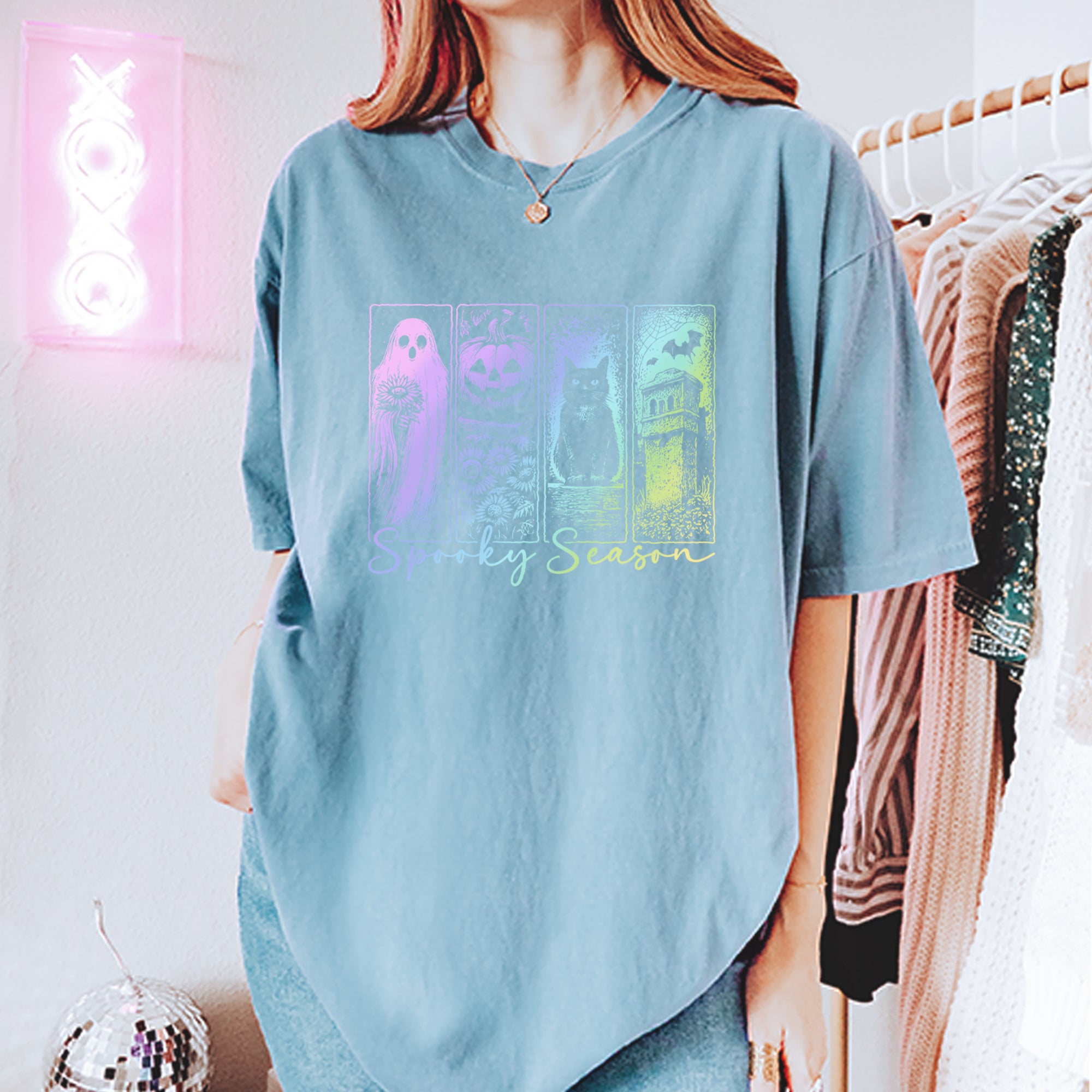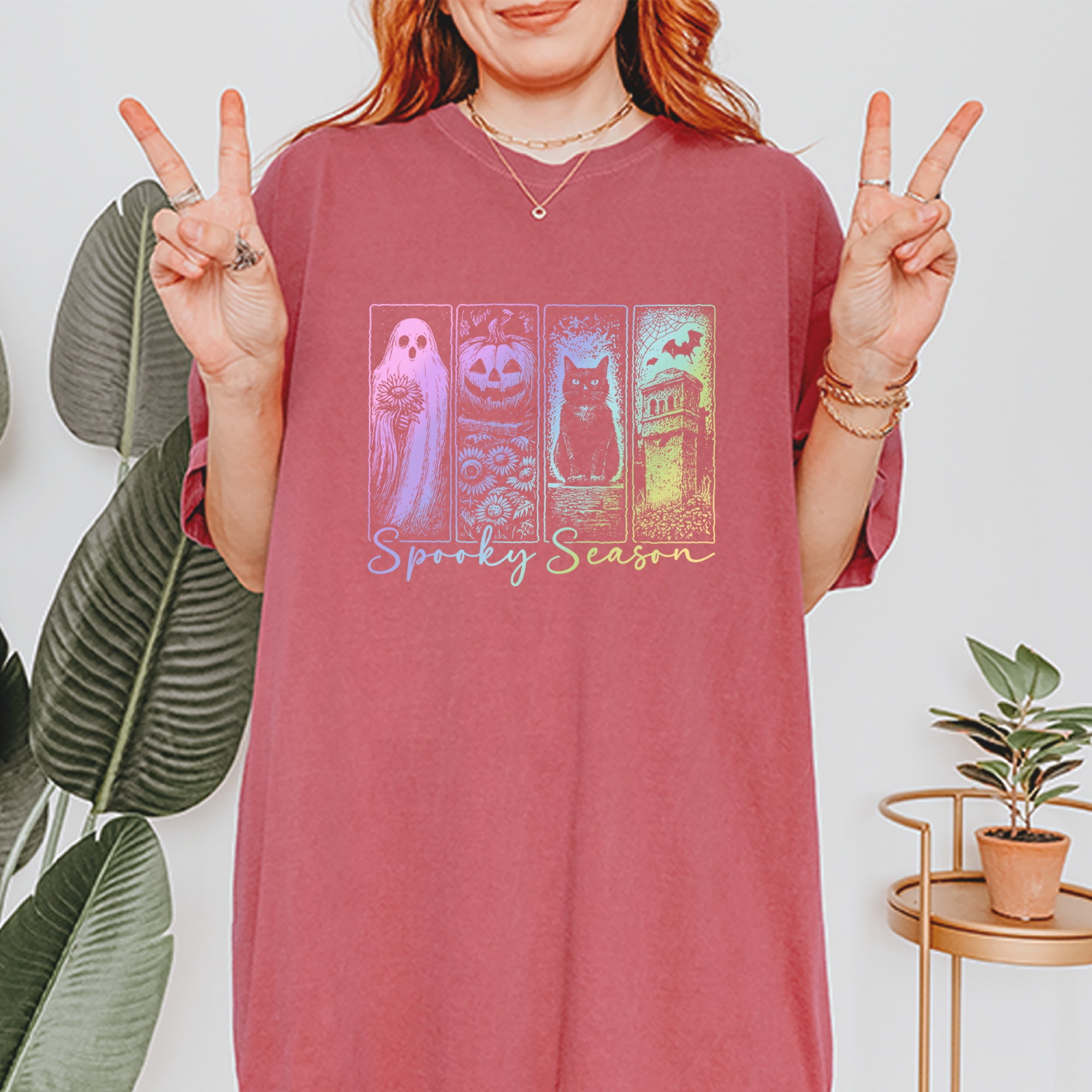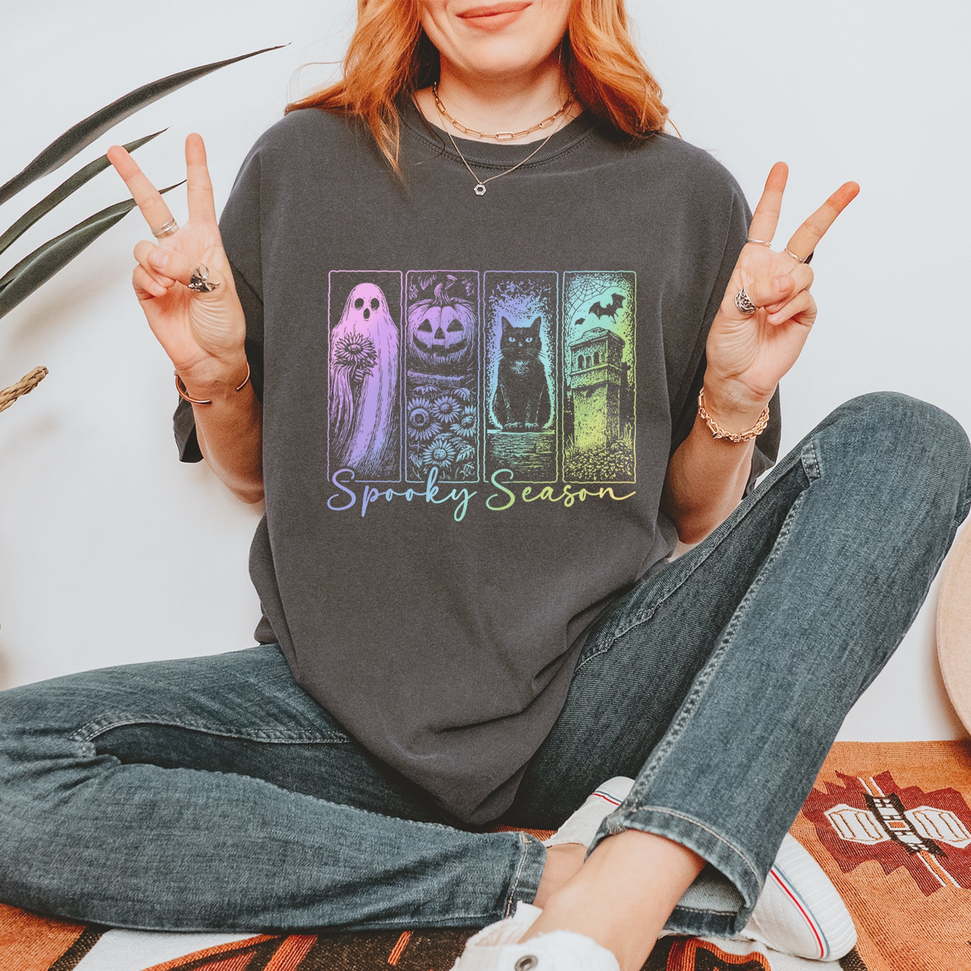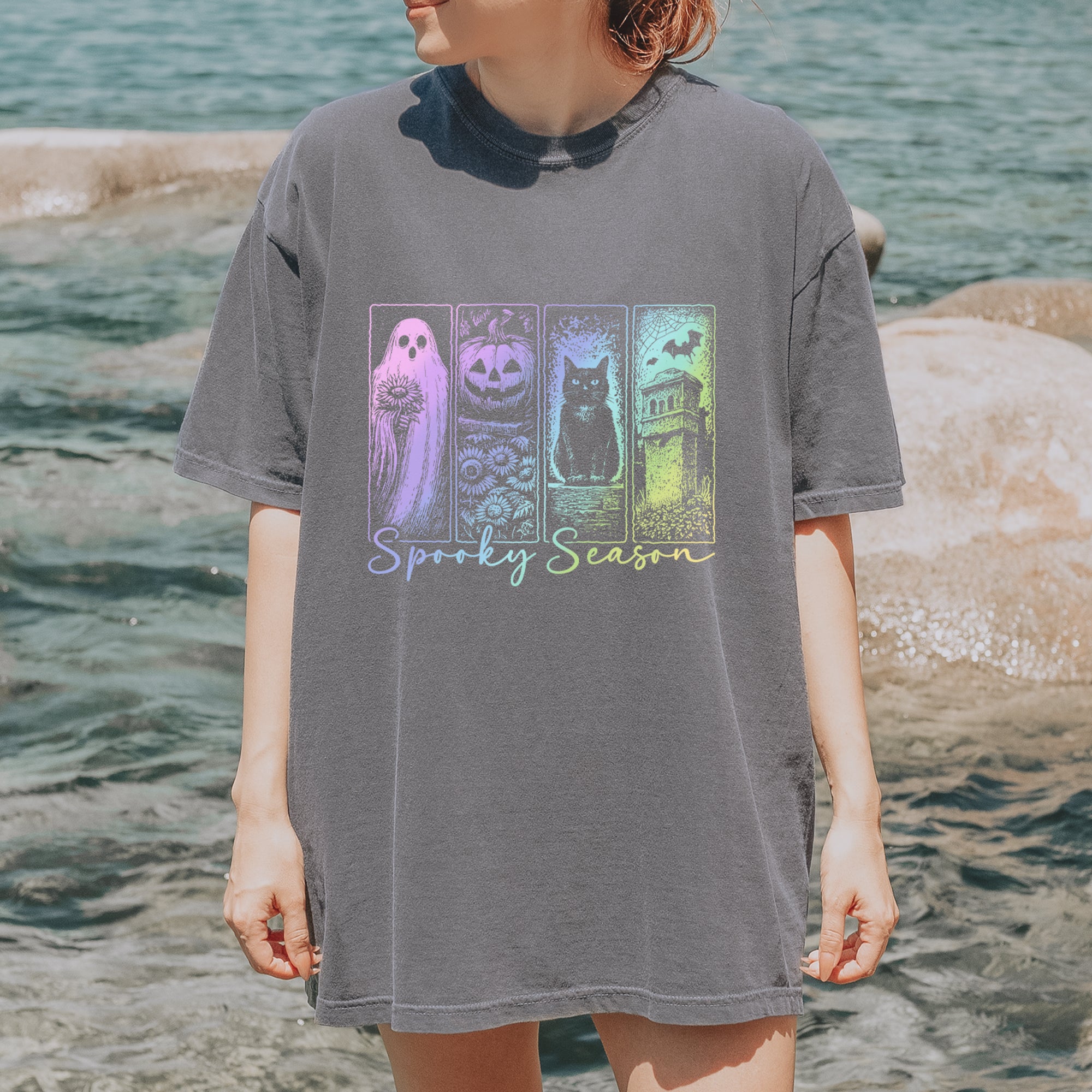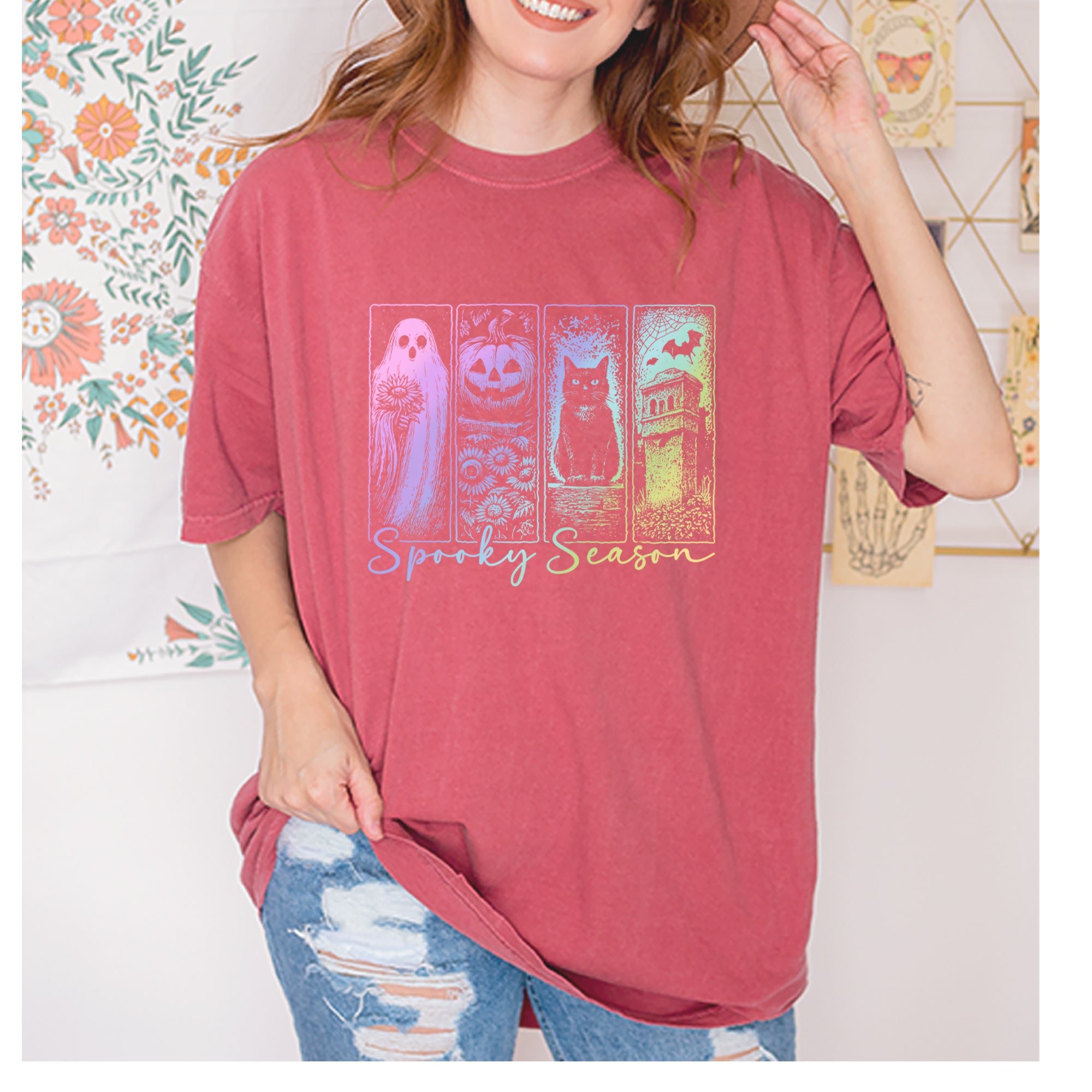 Celebrate the magic of spooky season with this colorful design featuring a sweet ghost, smiling pumpkin, mysterious black cat, and bats flying by.. A playful mix of creepy and cute, perfect for fall lovers who enjoy cozy Halloween vibes with a touch of witchy charm..