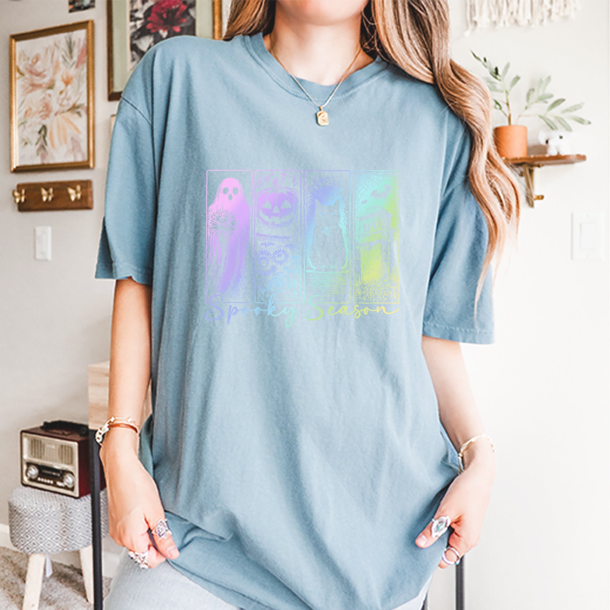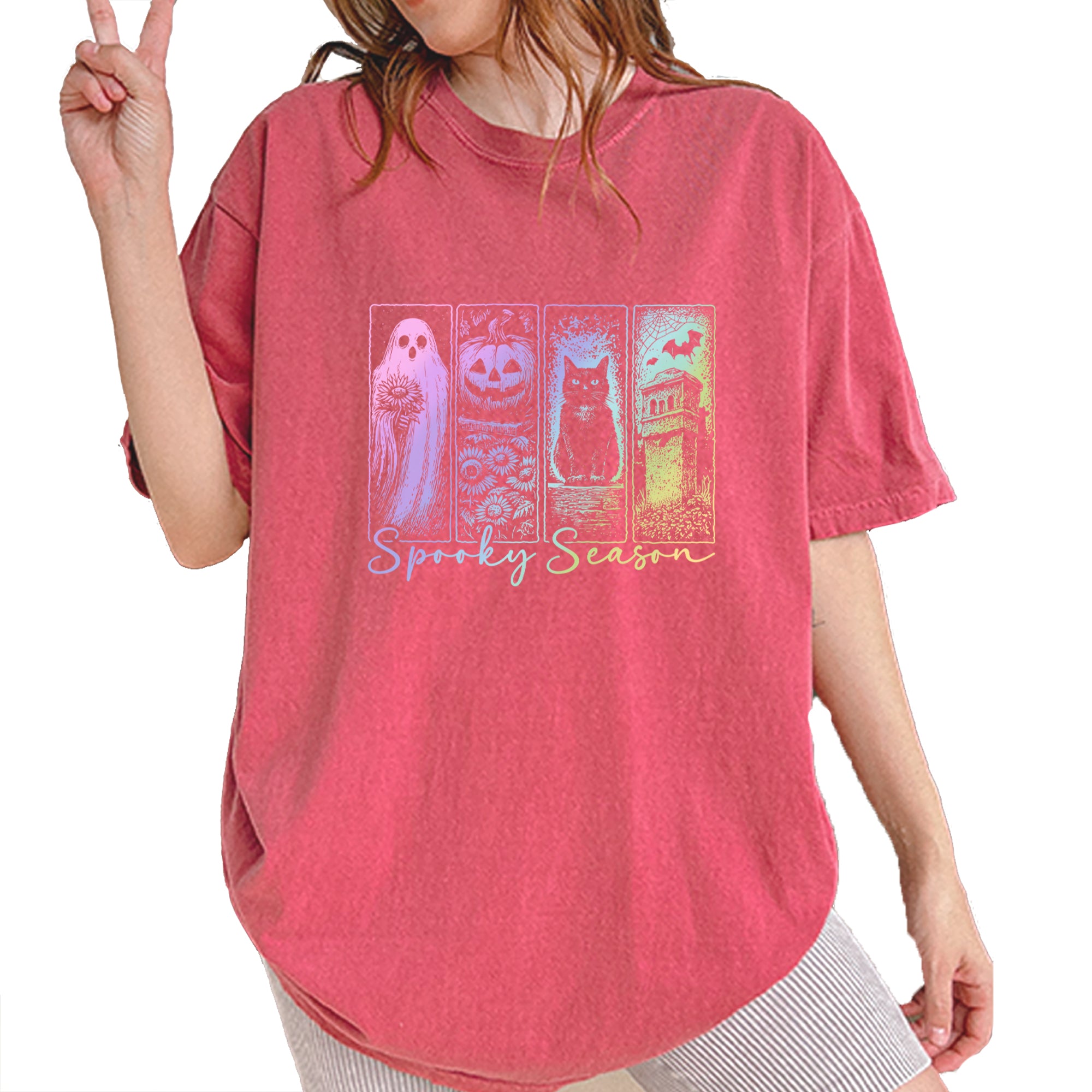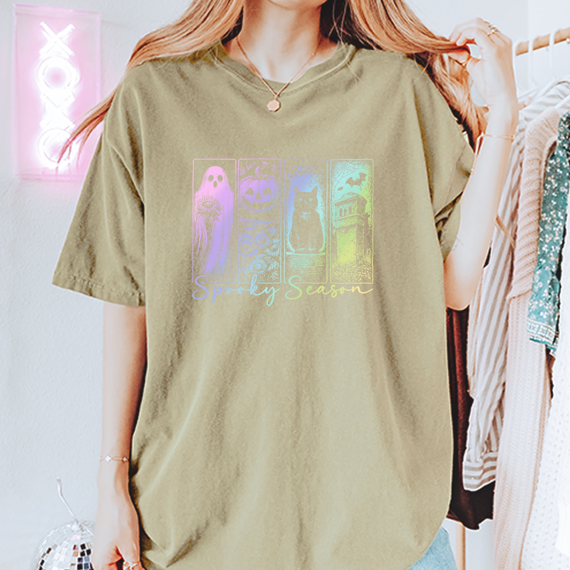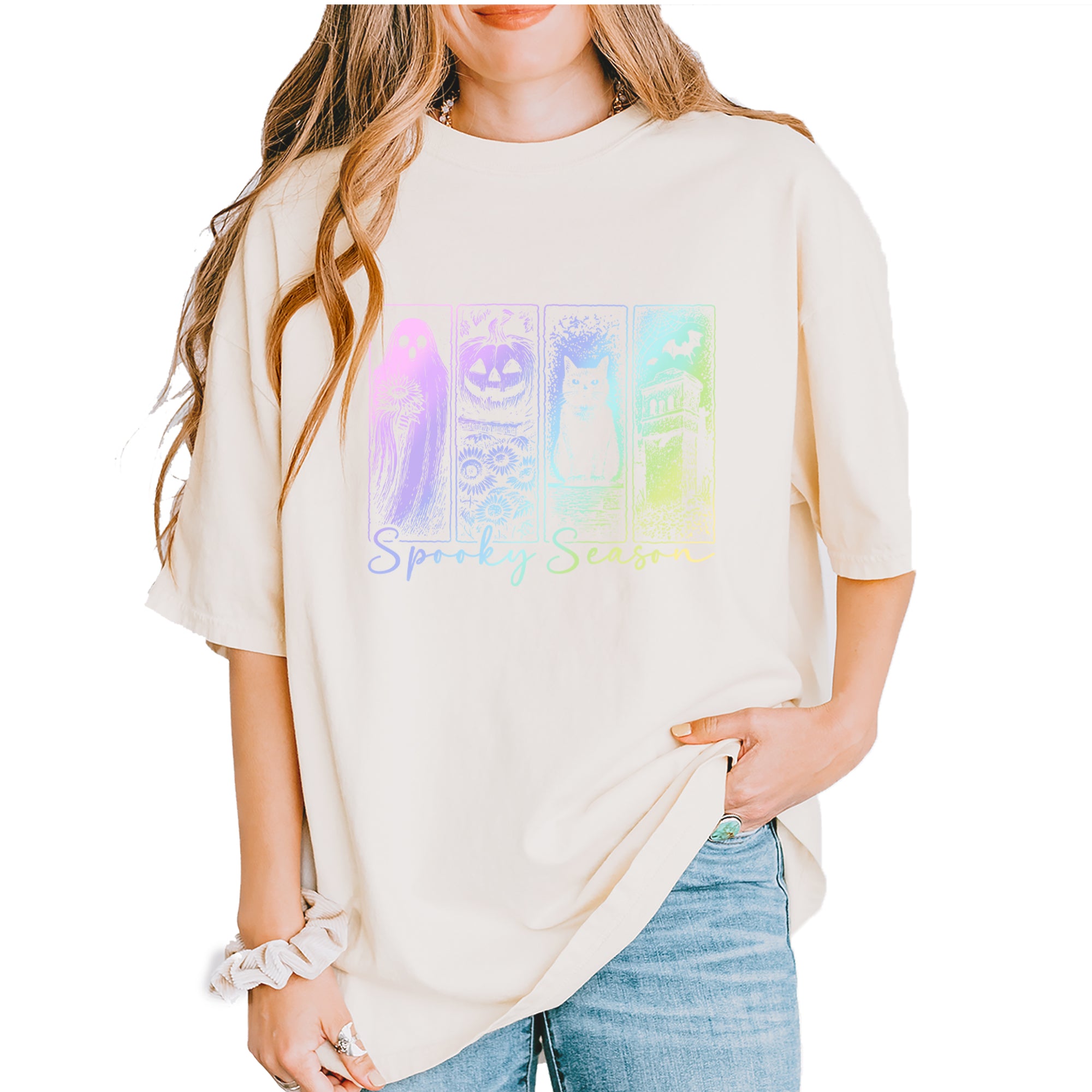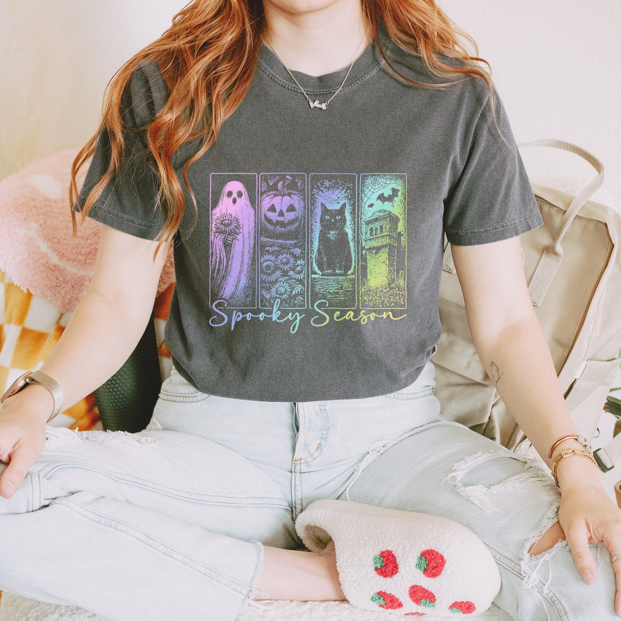 Celebrate the magic of spooky season with this colorful design featuring a sweet ghost, smiling pumpkin, mysterious black cat, and bats flying by.. A playful mix of creepy and cute, perfect for fall lovers who enjoy cozy Halloween vibes with a touch of witchy charm..