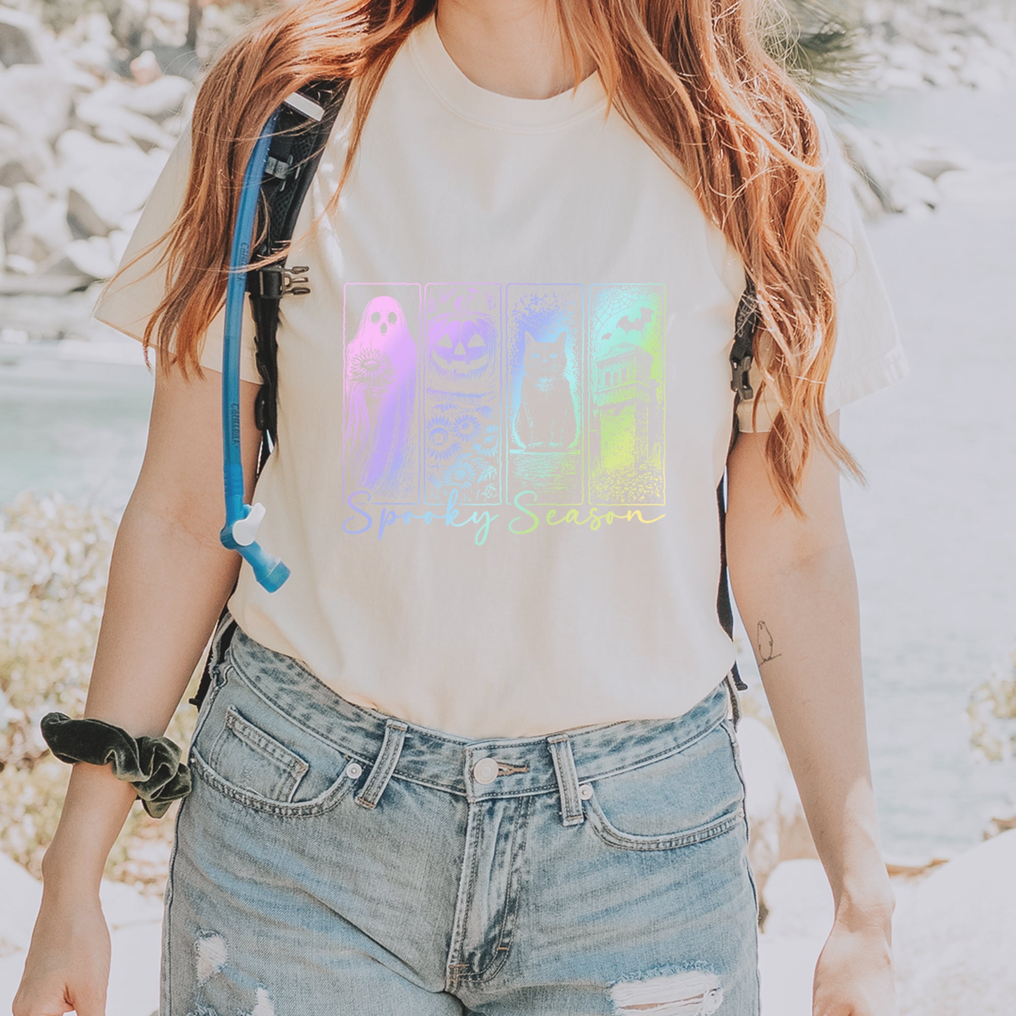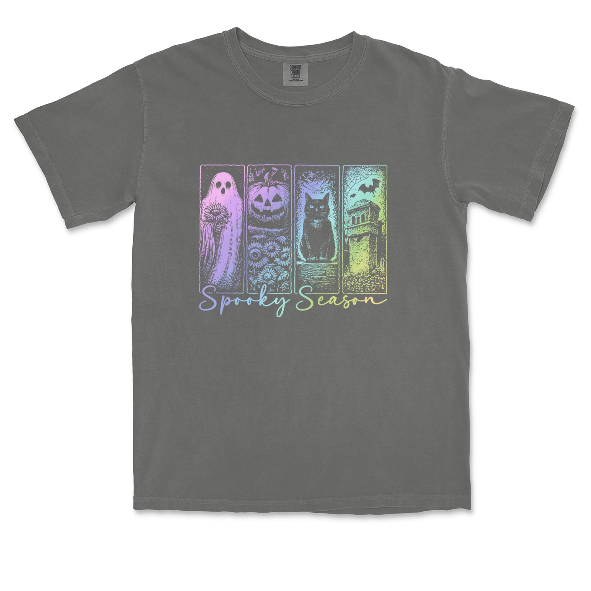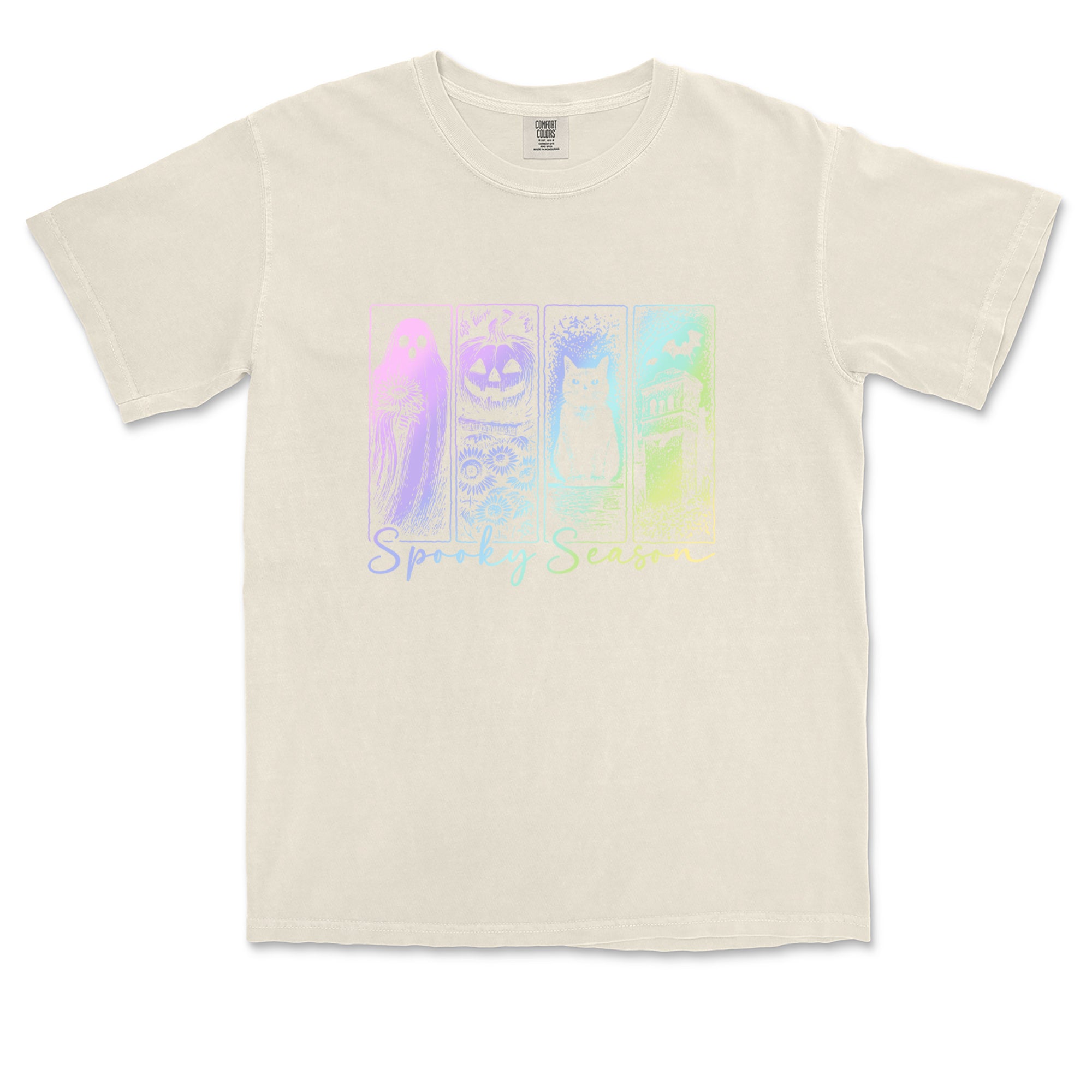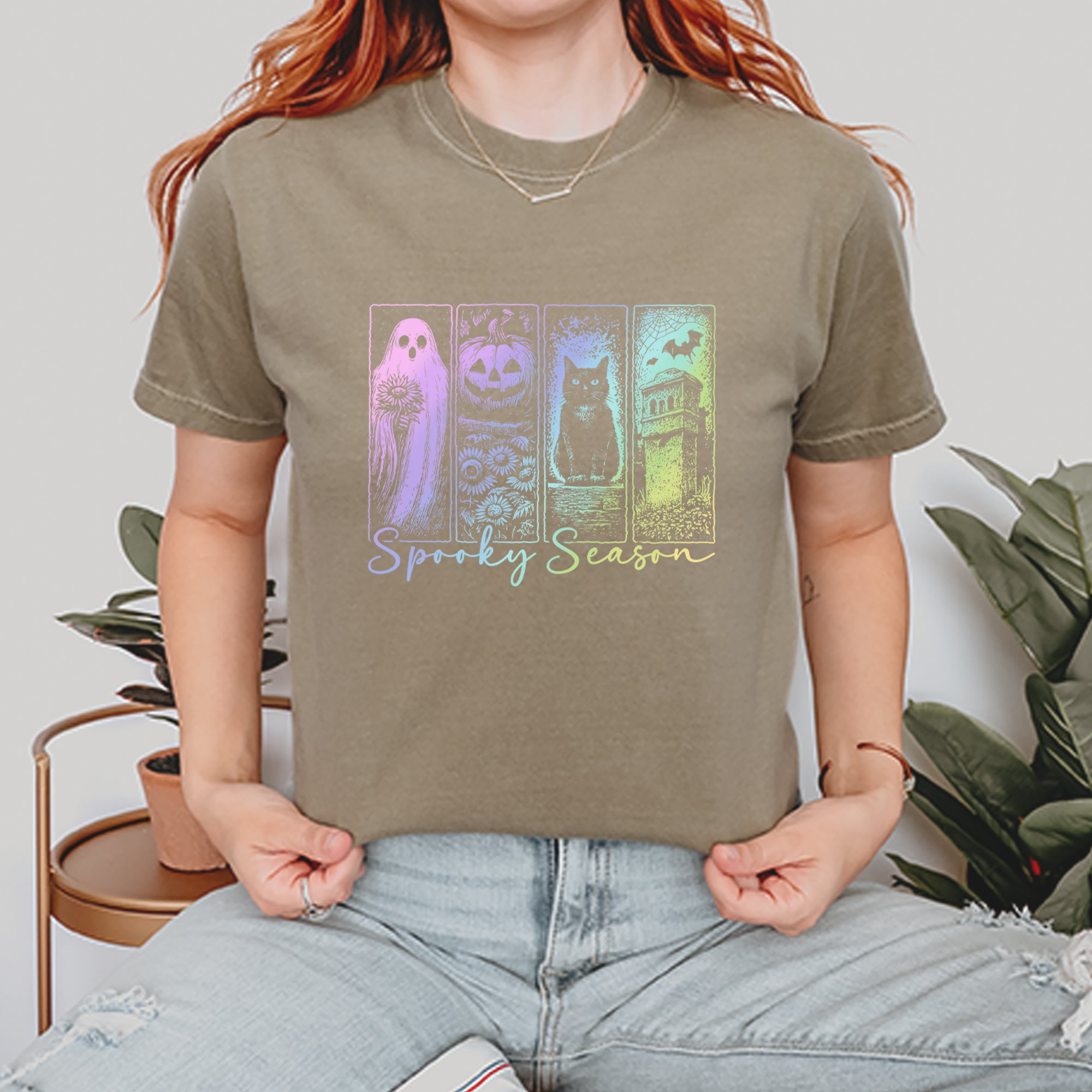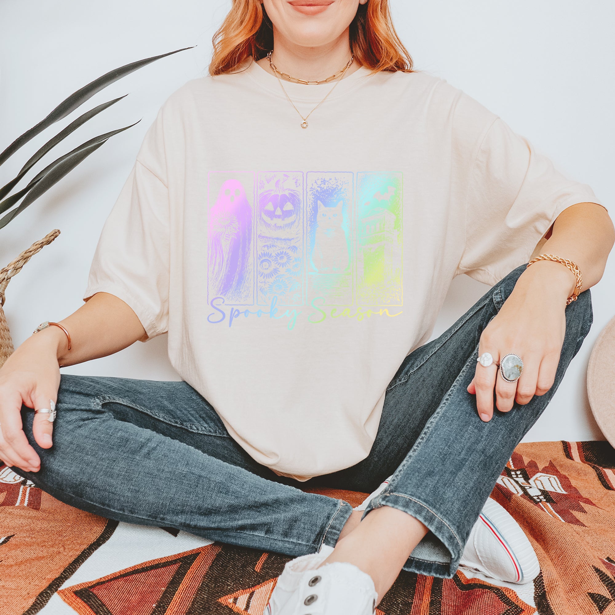 Celebrate the magic of spooky season with this colorful design featuring a sweet ghost, smiling pumpkin, mysterious black cat, and bats flying by.. A playful mix of creepy and cute, perfect for fall lovers who enjoy cozy Halloween vibes with a touch of witchy charm..