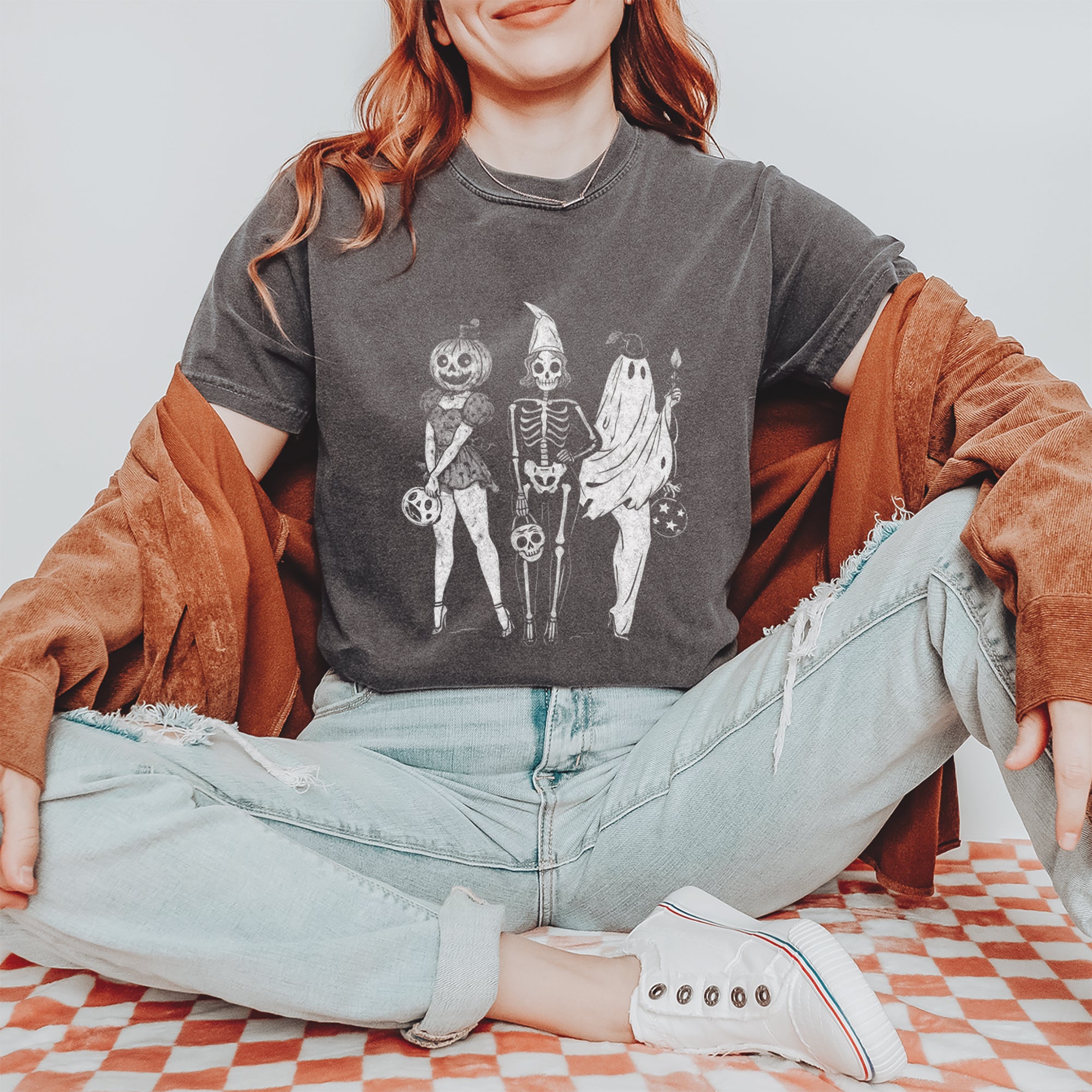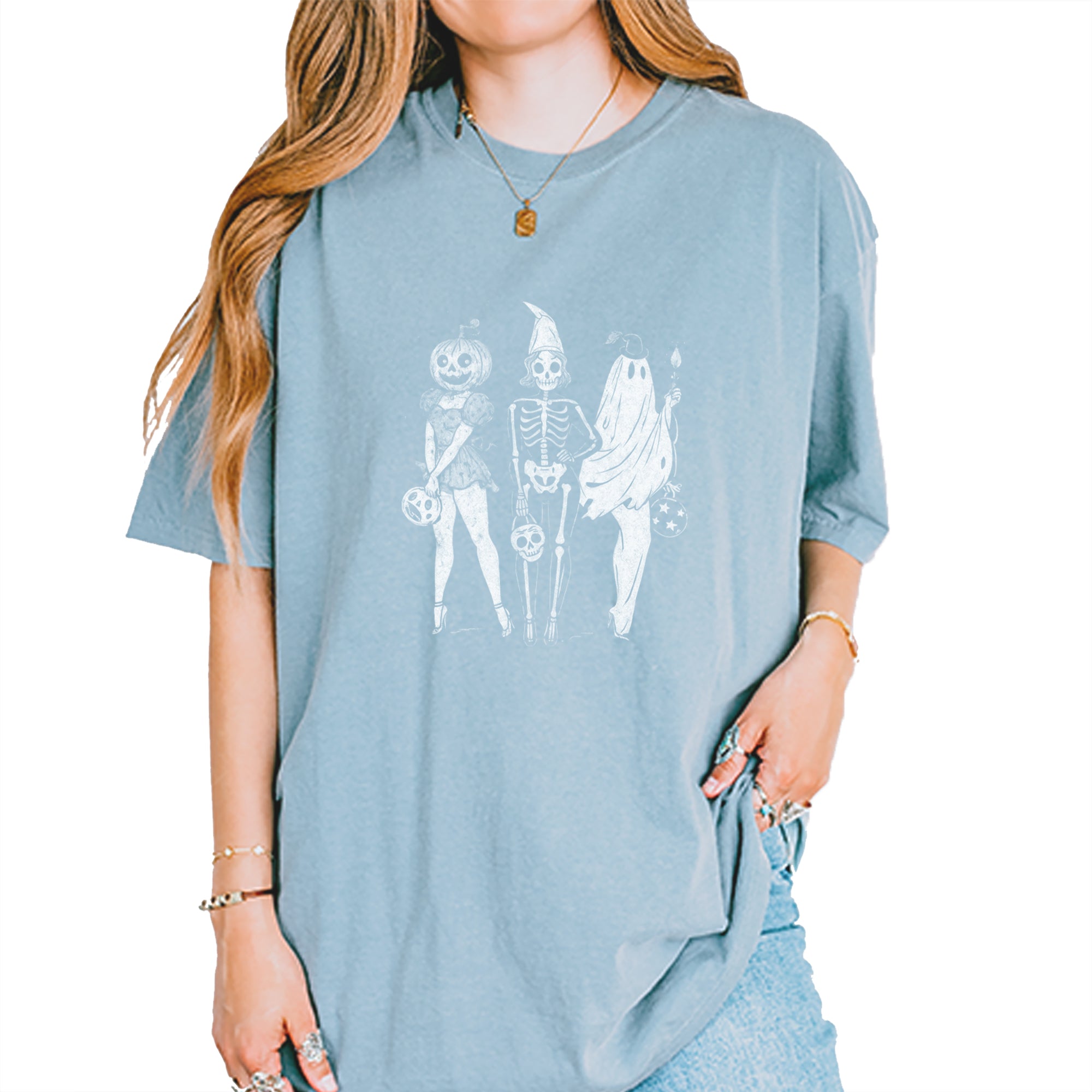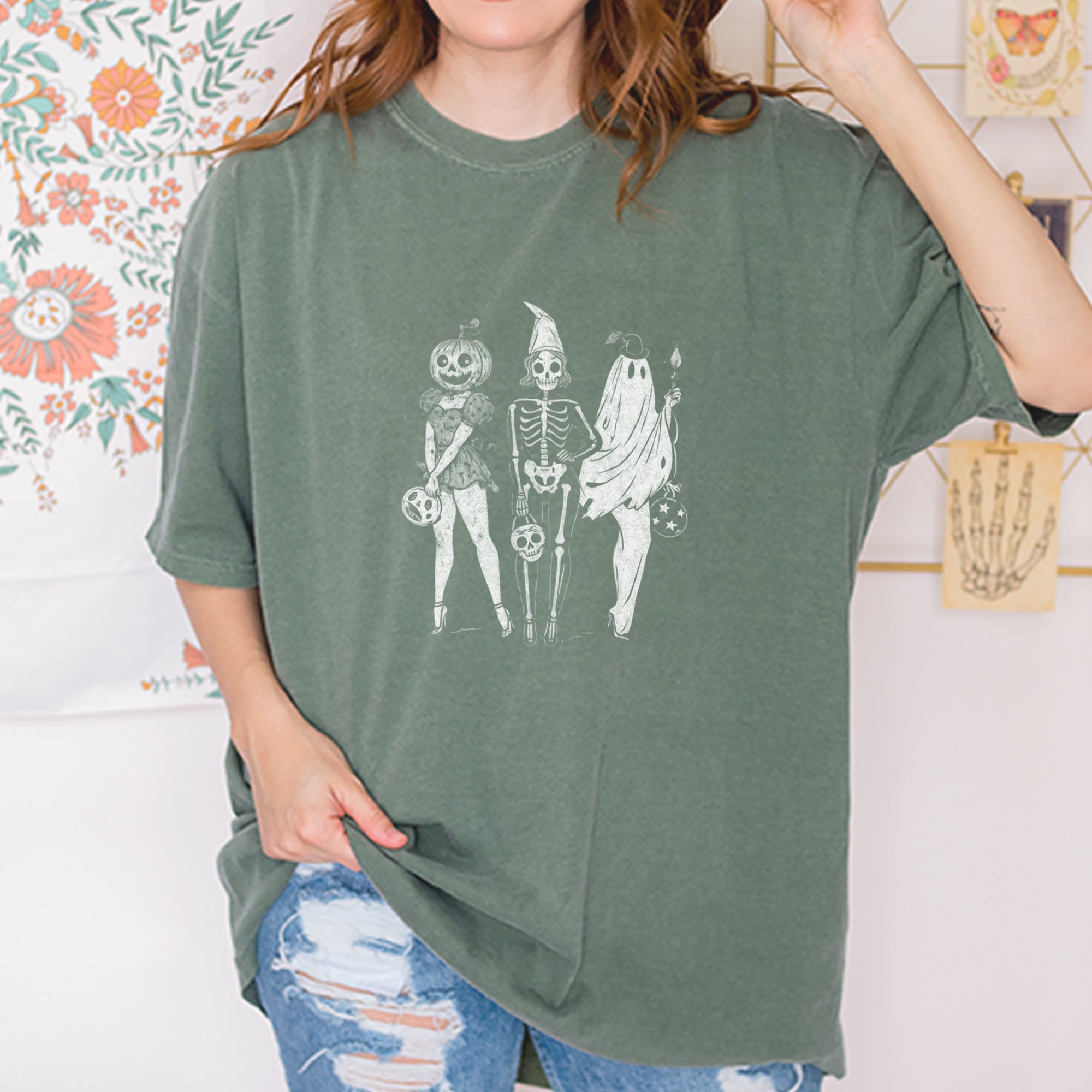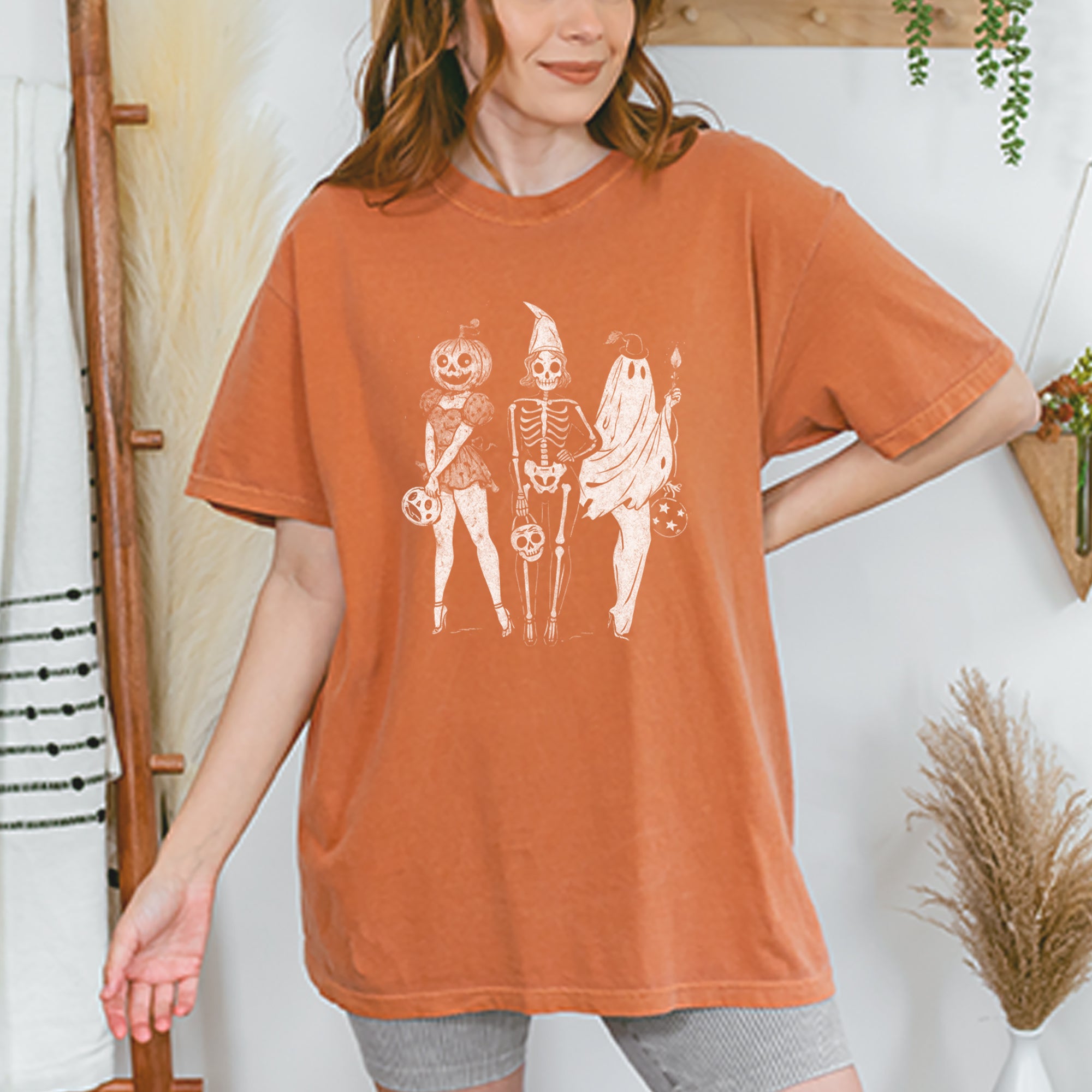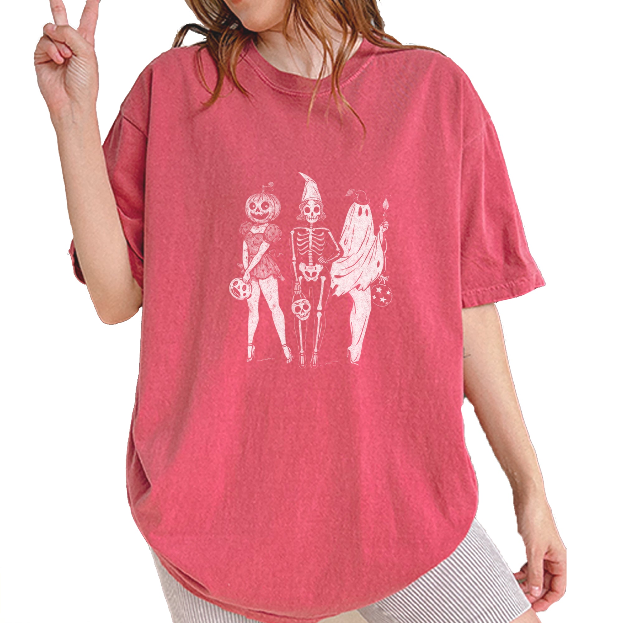 Gather your ghouls with this vintage-inspired spooky squad design featuring a pumpkin head, skeleton babe, and ghostly friend ready for Halloween fun.. A stylish mashup of creepy and cute, perfect for trick or treating, haunted parties, or showing off your retro Halloween aesthetic..