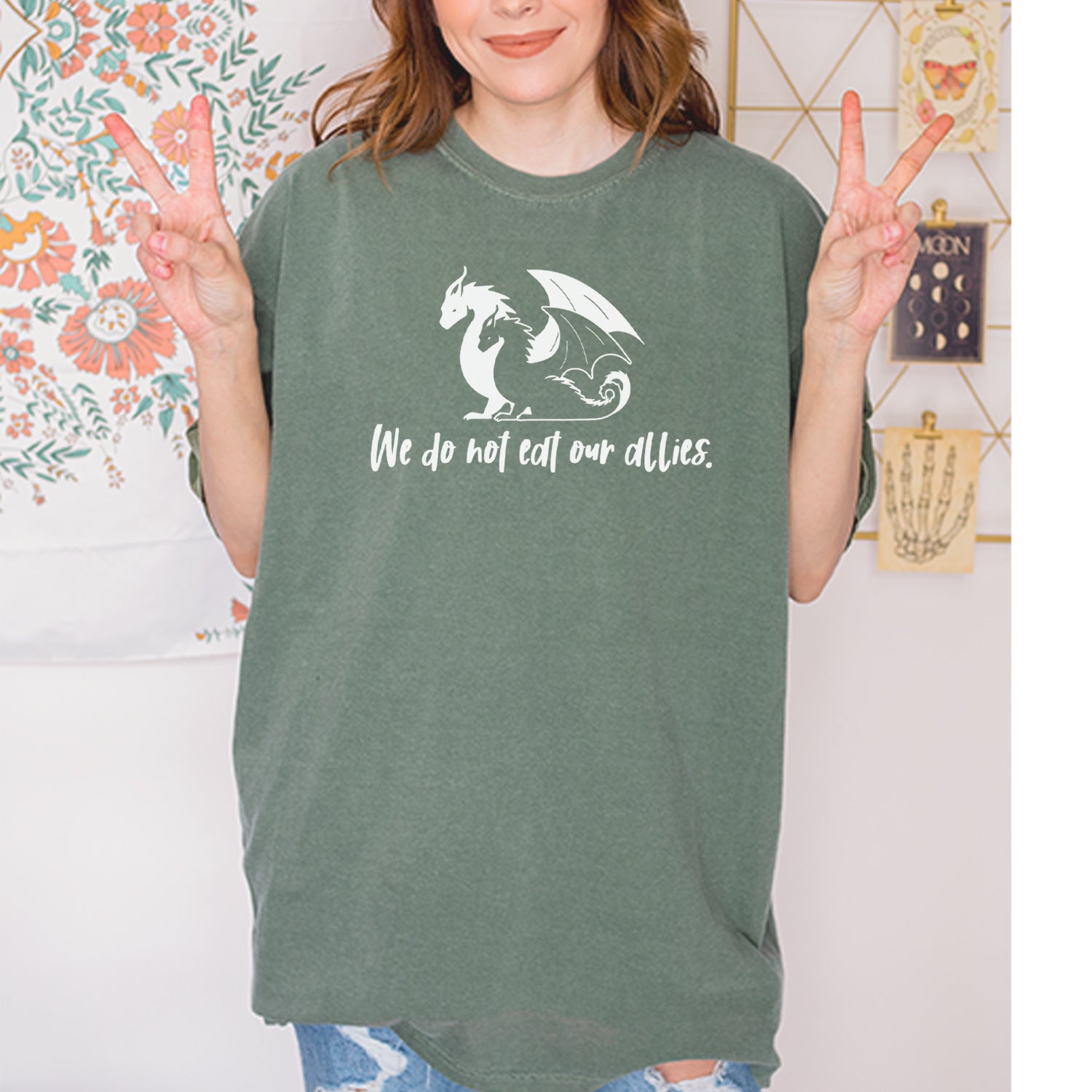 Celebrate the wisdom of dragons—this graphic perfectly captures the humor and heart of Fourth Wing with the iconic quote 'We do not eat our allies.'. Show your fandom with this standout design featuring two dragons and a lesson in loyalty straight from Basgiath War College!.